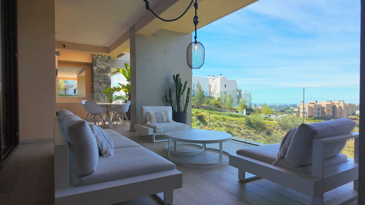The south west facing apartment of two bedrooms and two bathrooms has a covered terrace with panoramic views to the sea, where you can see Gibraltar and Africa on clear days, and enjoy impressive views to the mountains.