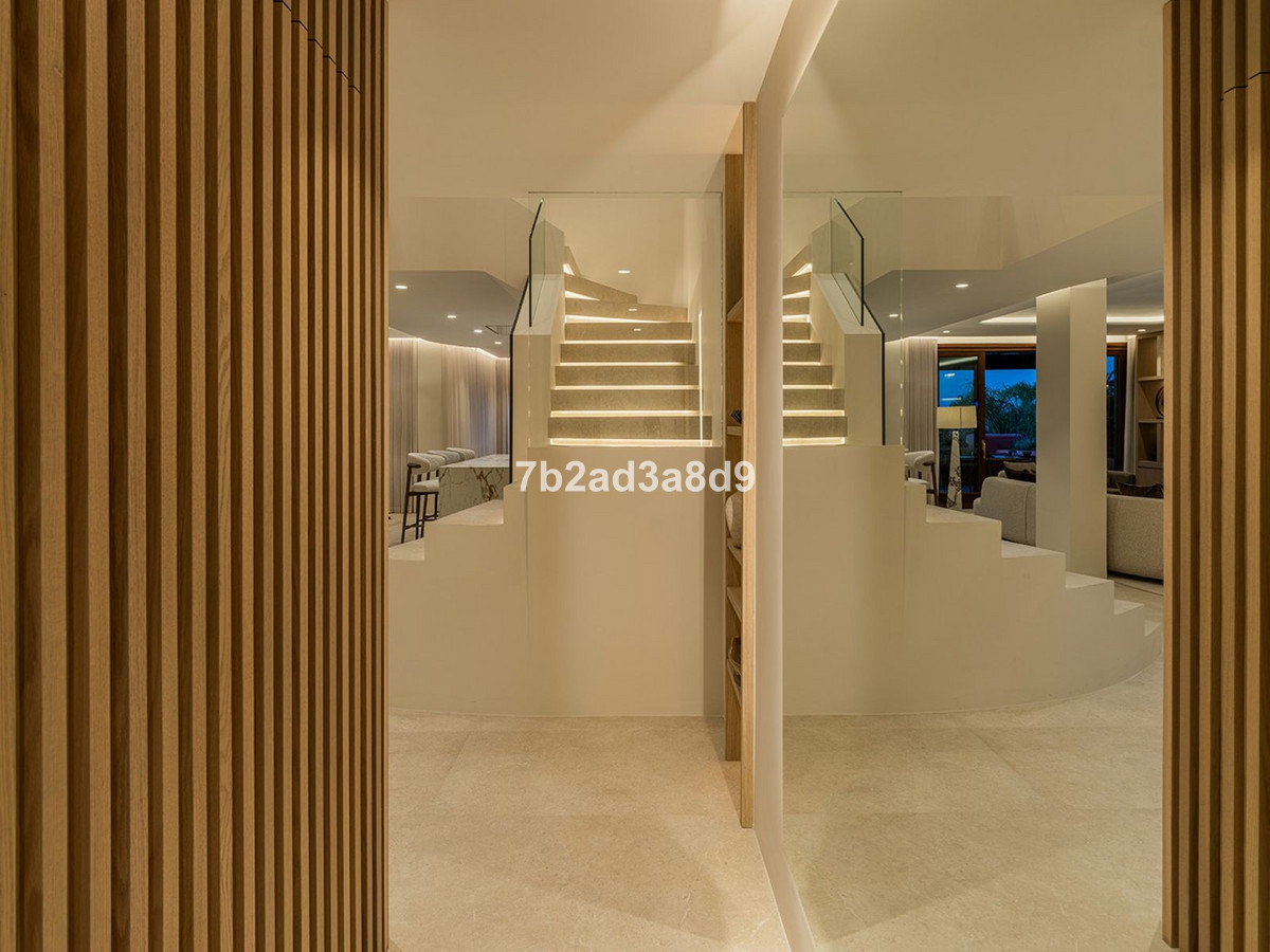 The primary suite is a sanctuary of its own, featuring a luxurious walk-in closet, a free-standing bathtub, and direct access to the upper terrace. Step outside to experience the pinnacle of outdoor living: a secluded sun terrace furnished with Kettal pieces, complete with a private sauna and Jacuzzi—ideal for relaxing after a day spent on nearby beaches or world-class golf courses.