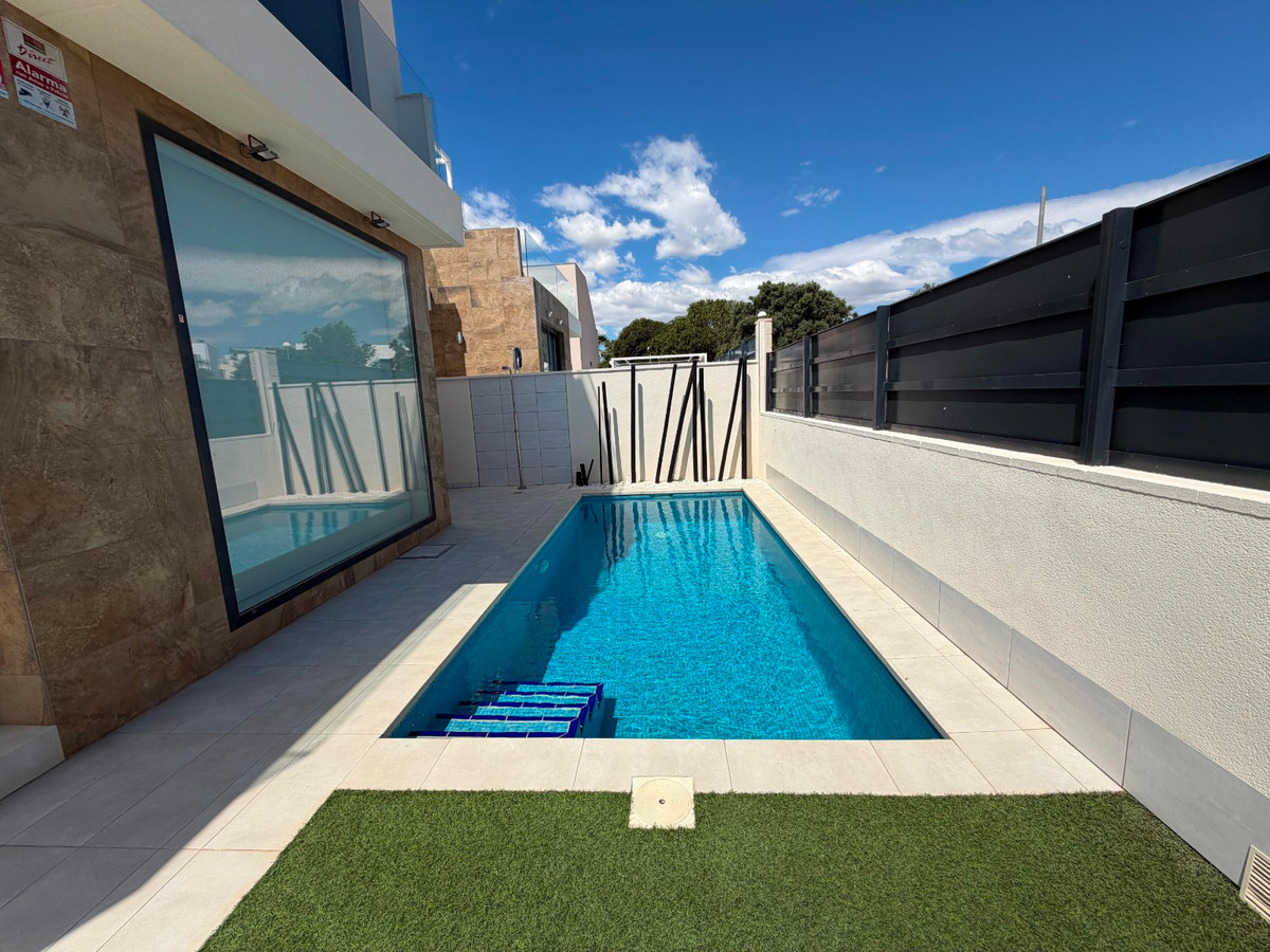 This Modern, Three Bedroom Detached, Villa in La Laguna, is located within a popular and convenient area on the Costa Blanca South, just a 3 minute walk to a main chain supermarket, 5 minutes by car to Ciudad Quesada high street with its array of amenities, 8 drive to La Marquesa Golf Course, and only 10 minutes to the beautiful beaches. This bright and beautifully maintained villa offers a 114m2 build and is accessed via a covered entrance terrace. Inside, the lounge area benefits from a stunning floor to ceiling wide window overlooking the pool, along with double sliding glazed doors providing direct access outside. The open plan, well fitted kitchen includes a breakfast bar and flows into the dining area, creating a perfect space for modern living. The ground floor also features a utility room, a double bedroom, and a family shower room, with stairs leading to the first floor.Upstairs, there are two further double bedrooms, including a luxurious master suite with a walk-in wardrobe and double sliding glazed doors leading out to a private terrace. A glazed sliding door leads into a stylish shower room with double sinks and a separate WC. From this level, there is access to a private solarium, complete with a retractable sun blind and enjoying lovely views across the salt lakes and surrounding countryside. Set on a 212m2 low maintenance, landscaped and tiled plot, the exterior offers a private swimming pool, an area with artificial grass, a stone BBQ area, and off road parking. Additional features include ducted air conditioning throughout, making this a comfortable home all year round. A superb modern villa offering stylish living in a great location on the Costa Blanca South, ideal as a permanent residence or holiday home.\n
