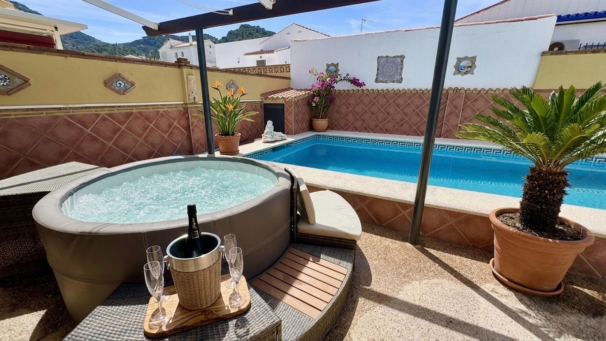 The 500 m2 plot includes various amenities such as a refreshing swimming pool, a relaxing jacuzzi, extensive garden areas, and a functional barbecue area perfect for enjoying the outdoors.