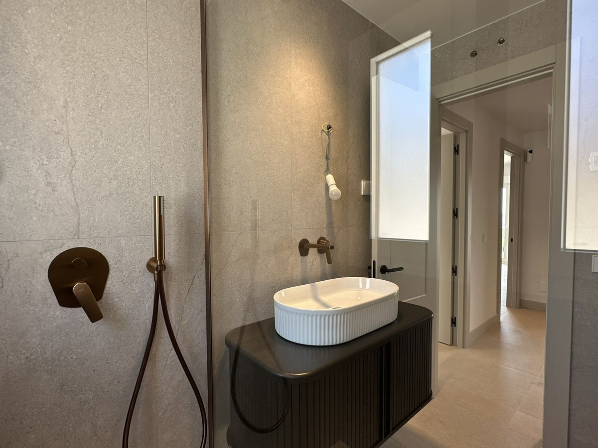 - Ground floor: Elegant living-dining room with an integrated, fully equipped designer kitchen and direct access to a pleasant terrace with sea views and a porch, ideal for enjoying the Mediterranean climate year-round. Guest toilet.