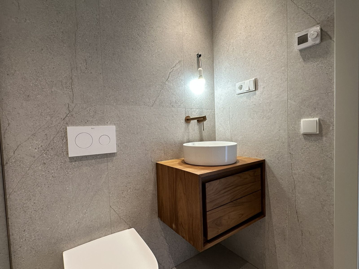 - Ground floor: Elegant living-dining room with an integrated, fully equipped designer kitchen and direct access to a pleasant terrace with sea views and a porch, ideal for enjoying the Mediterranean climate year-round. Guest toilet.