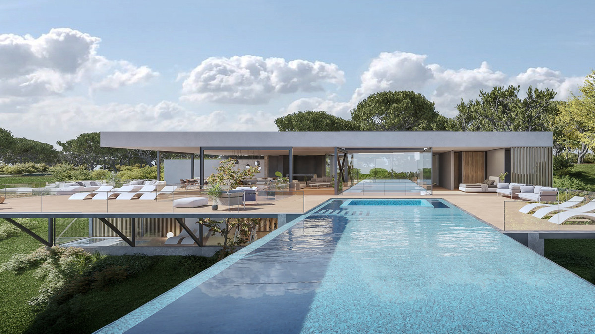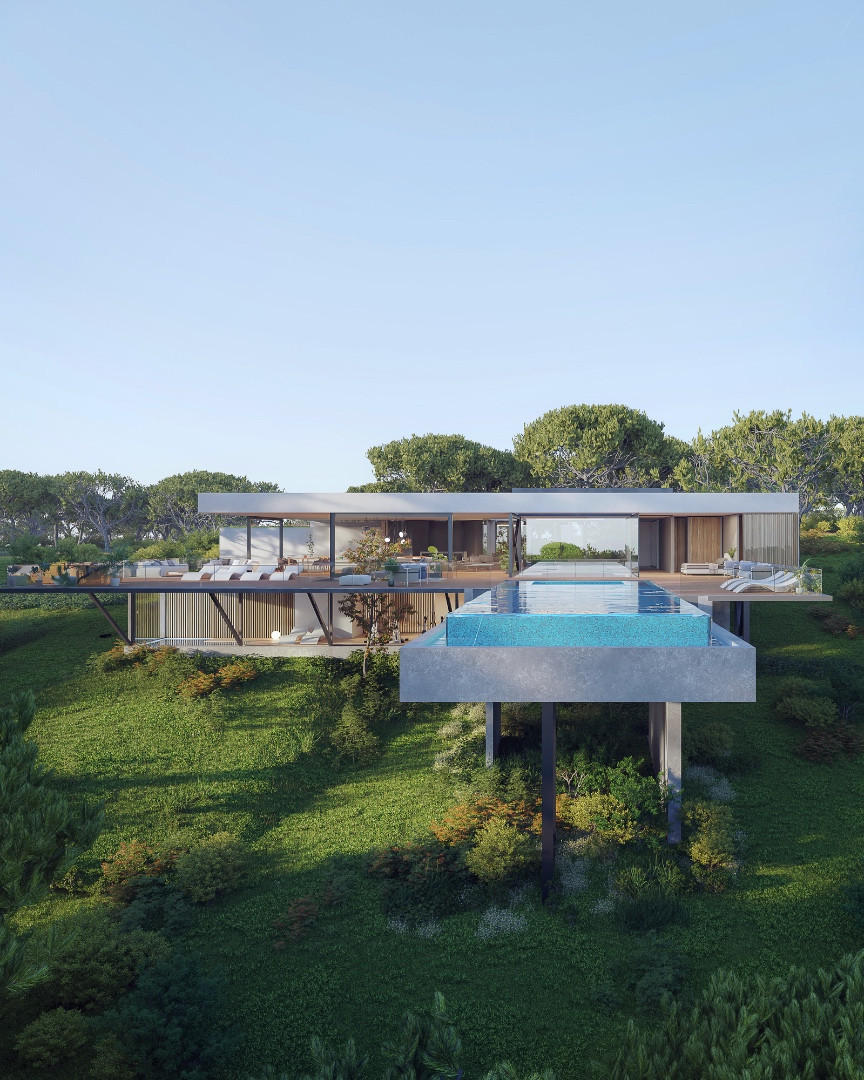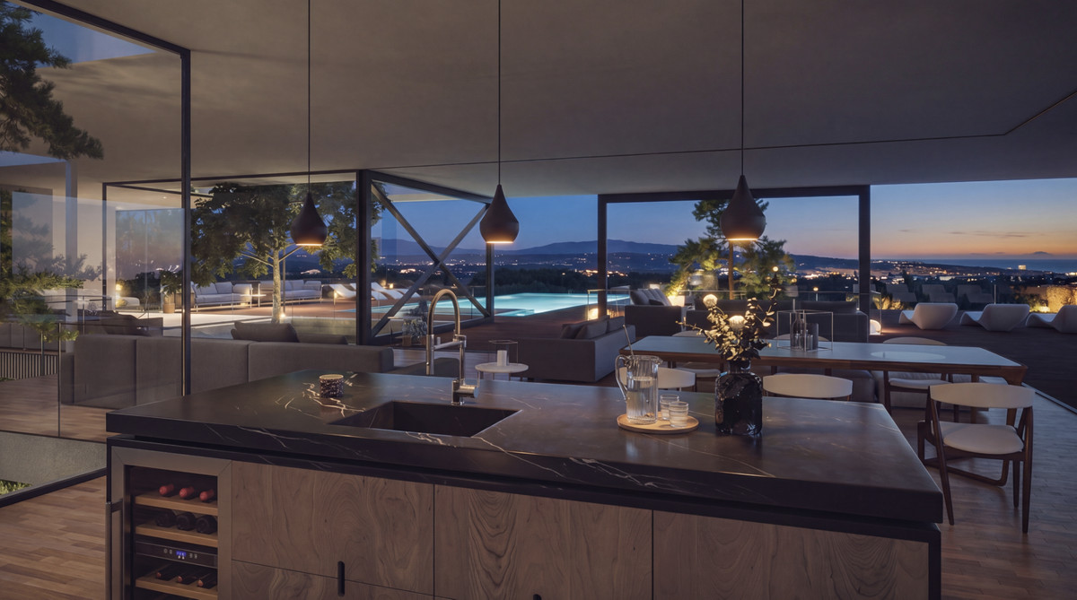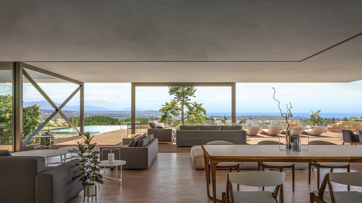The villa is set across multiple levels with a bright open living area on the top floor. This level connects directly to a covered terrace and outdoor spaces with panoramic views. The lower level hosts the bedroom suites and can be accessed by lift or stairs. The design also allows for upgrades such as an indoor pool and private gym to suit your needs.