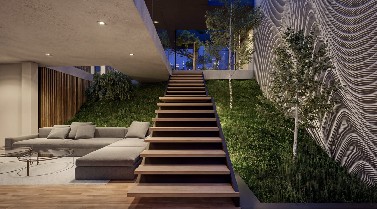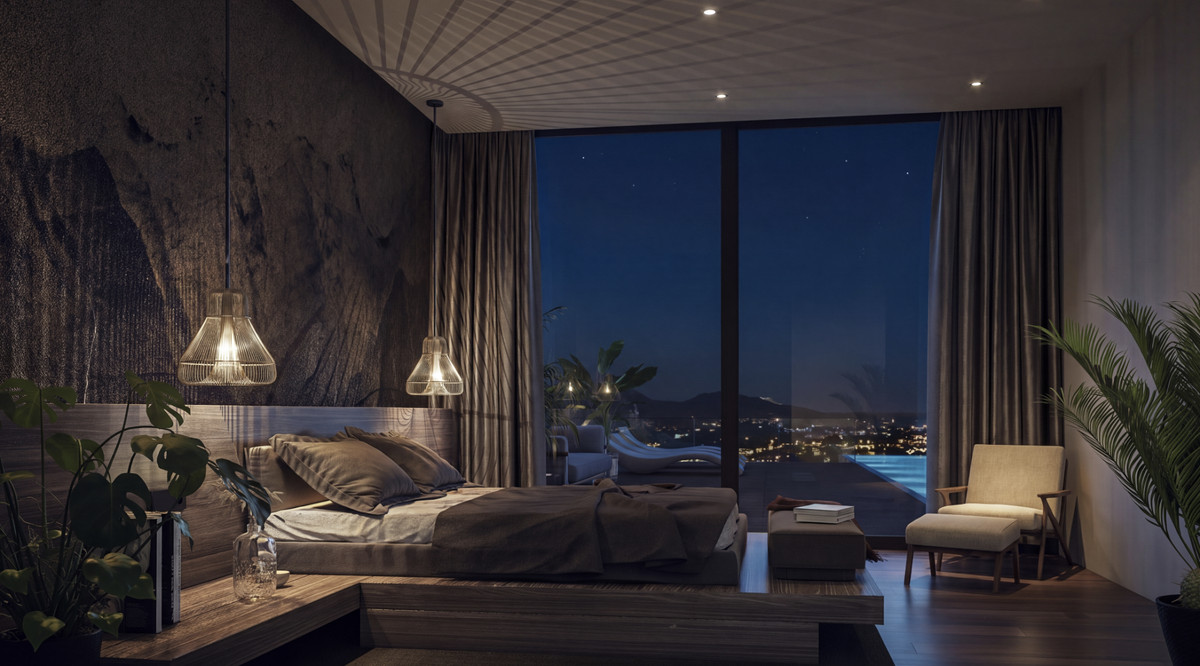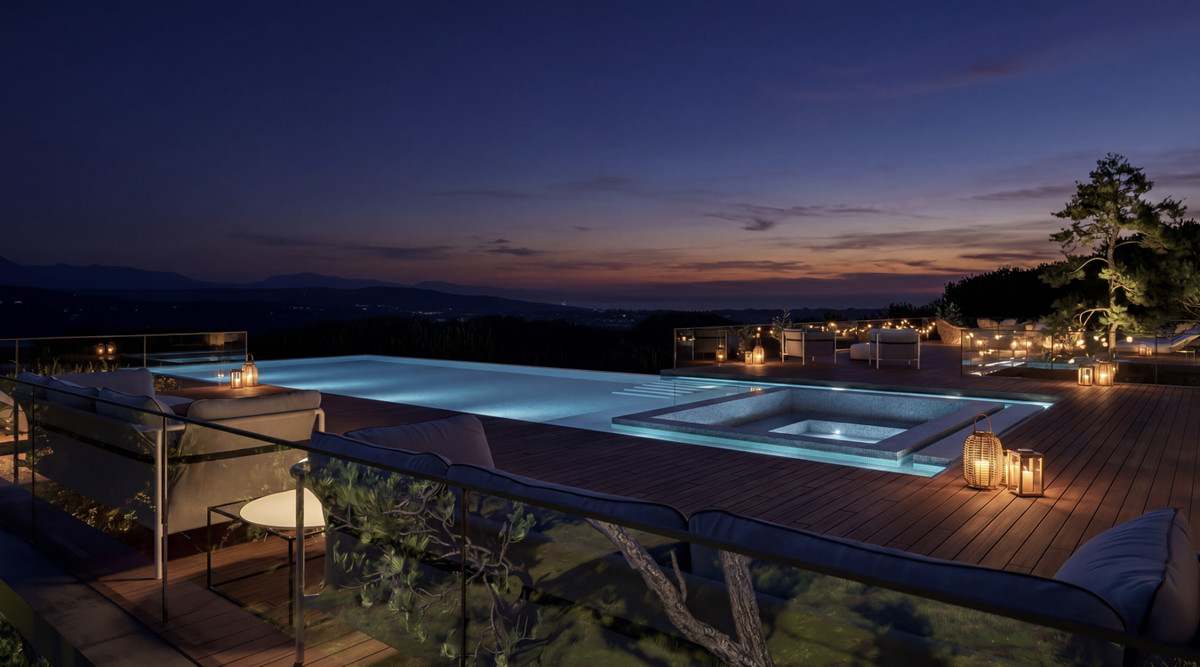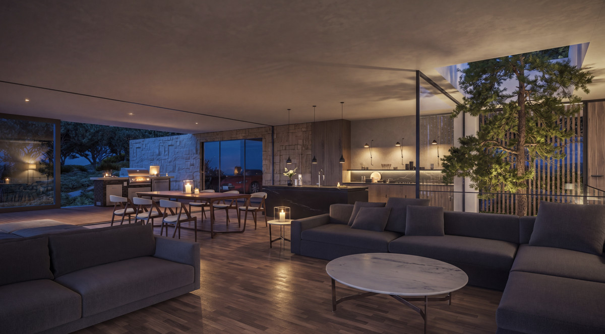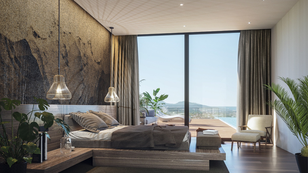 The villa is set across multiple levels with a bright open living area on the top floor. This level connects directly to a covered terrace and outdoor spaces with panoramic views. The lower level hosts the bedroom suites and can be accessed by lift or stairs. The design also allows for upgrades such as an indoor pool and private gym to suit your needs.