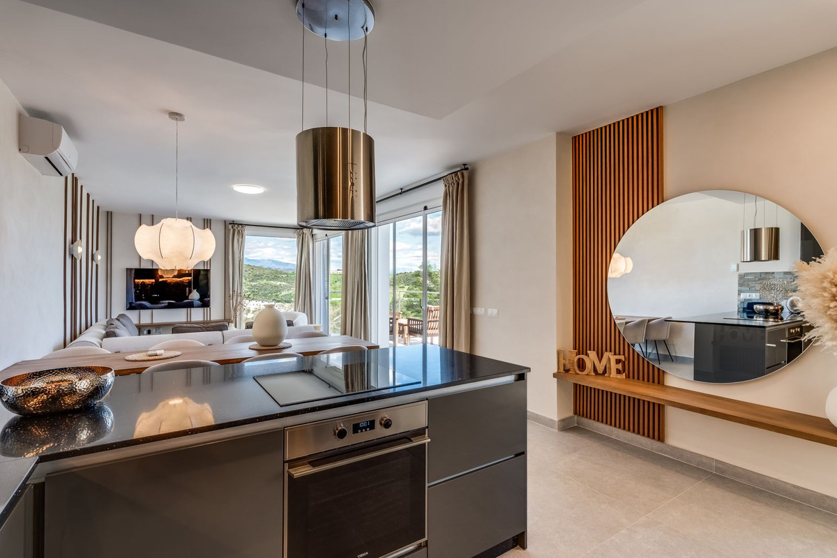 The living room and open-plan kitchen form the central heart of the home. The kitchen is fully equipped with modern appliances and perfect for daily living or enjoyable dinners with family and friends.