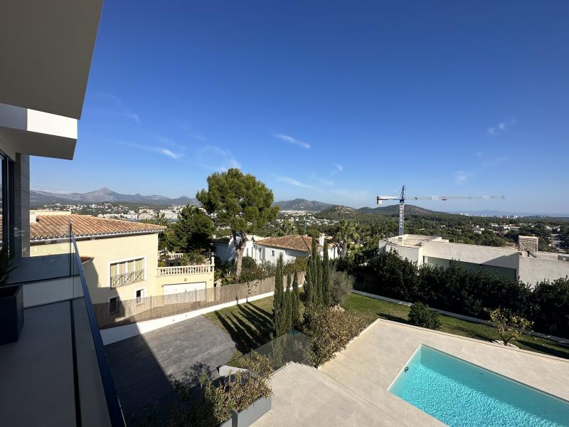 3 sea view luxury property in Nova Santa Ponsa, Built on an elevated plot in one of the most sought after locations, with stunning sea views in 3 directions, and panoramic views of the Port Adriano marina, views of the harbor and the bay of Santa Ponsa. The Tramuntana Mountains are also in full view. The linear architecture, designed by Mallorcan architect Alejandro Palomino, and the open and spacious living and outdoor areas make this property unique and extraordinary. Built with only the best materials and first-class technology, the house offers pure luxury and comfort. The light-flooded entrance area with a large roof gallery and the representative staircase provides an impressive field of vision. The elegant designer fireplace serves as another special eye-catcher and as a room divider. Open living area with designer kitchen, dining room and living area as well as a guest room extend to the spacious, covered outdoor terrace. The master bedroom with bathroom en suite and large dressing room, two double bedrooms, bathroom and a small utility room are located on the lower level, the partially covered pool terrace invites you to sit comfortably and sunbathe. Here there is access to the outdoor area and a flat, minimalist garden. The spacious pool with counter-current system and partially covered outdoor terraces invite friends and relatives to linger and unwind. Extras: elevator, underground parking for 4-5 vehicles, air conditioning, hot water supported by a solar system, electric shutters, alarm system with camera surveillance and smart home system, built in 2021, security front door, Velux roof gallery with automatic shading, ceramic facade cladding with ventilation ducts.