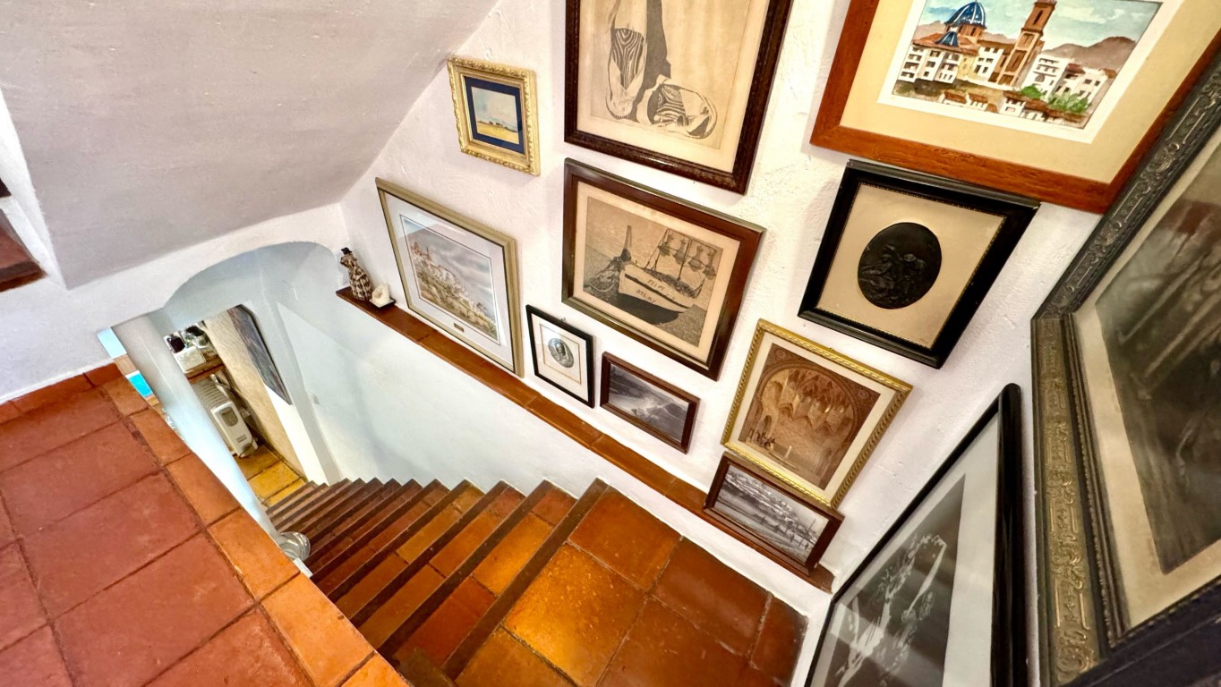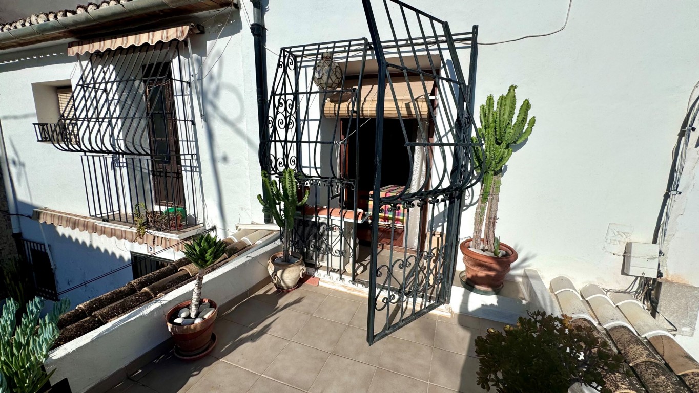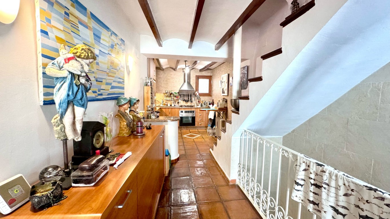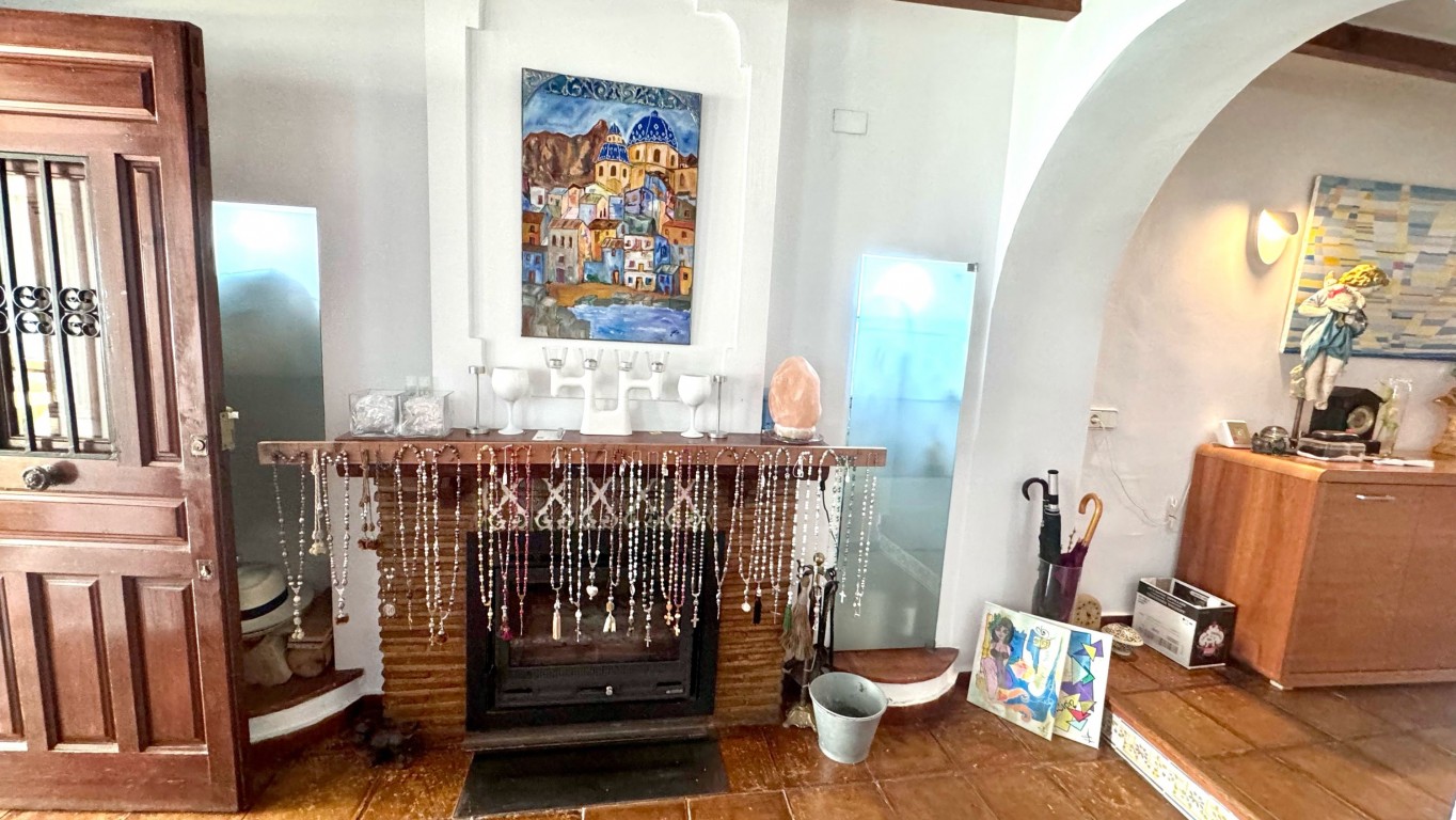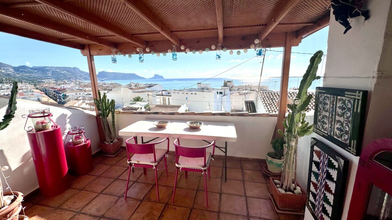 FEEL THE ATMOSPHERE OF OLD ALTEA WITH THIS  CHARMING RUSTIC  PROPERTY LOCATED IN THE CENTRE OF OLD TOWN ALTEA CLOSE TO THE MAIN SHOPPING AREA. This is  house has  fantastic sea and mountain views from the two  upper terraces so there is good outsize space. There are 3 floors, 2 upstairs and one downstairs. The entrance floor las a lounge area with windows that open fully and  an open kitchen and small area for dining. Down the stairs at street level is the large rustic bathroom with shower and bath and the original characteristic rock wall.  On the 1 first floor, there are 2 bedrooms, with the master bedroom leading out to a terrace with views to the sea and the town. On the 2nd floor is the loft area with a another multipurpose room, used as a bedroom, kitchenette with a water connection and sink. The terrace on the this floor has superb views towards the bay and Calpe and ideal  to enjoy outdoor living. Also included is air conditioning on the ground floor, a fireplace and  electric heaters. In addition, not connected to the main house, is an entrance to a storage area . The walls are very thick so maintains the  heat in winter and is kept cool in summer. If you love the charm of old Altea, this may be the property for you and is one of the most photographed streets in Altea, with the centre just 3 minutes walk away.