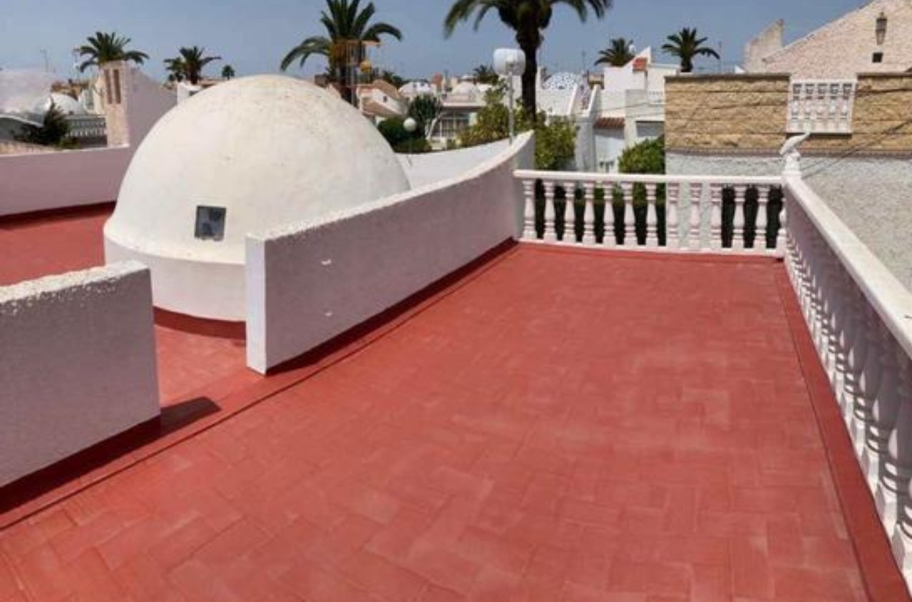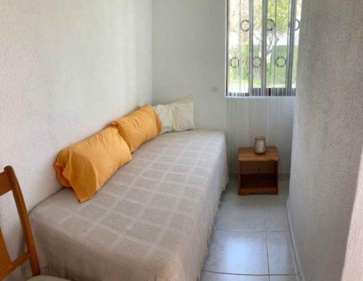 Beautiful Bungalow in Las Chismosas, Orihuela Costa, has 2 bedrooms, bathroom, kitchen, living room and closed terrace, renovated kitchen with all appliances, bathroom with shower, PVC floors, pellet stove, fans, closed terrace, with roof top solarium, furnished, could do with some modernisation which is refelected in the asking price. 10 minutes from beaches and great coves, 5 minutes CC la Zenia, next to the municipal sports center, schools, institutes, supermarkets, restaurants.... Very quiet urbanization with large green areas, plants and fruit trees.