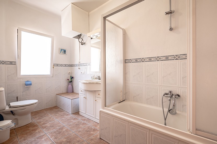 The main bedroom has the bathroom en suite . There is a useful private sun terrace at this level with views over the village.