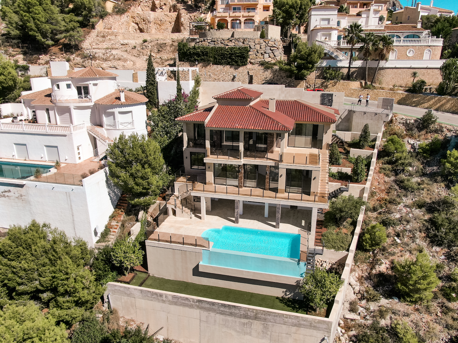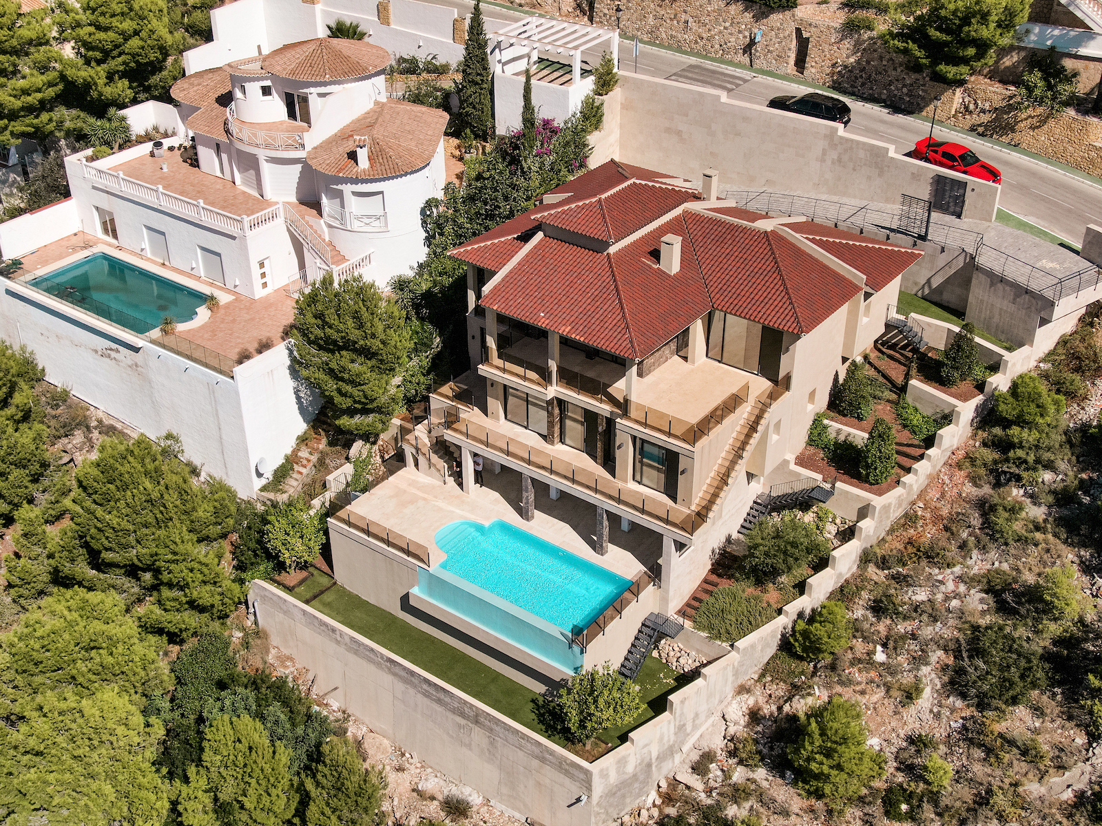 The villa is built in modern rustic style using the highest quality materials. You enter the villa by first going through the security checkpoint of the residence then taking a 4-minute drive to where it is located.