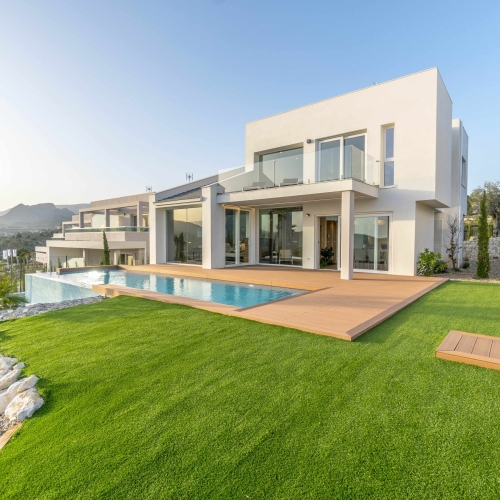 Modern villa built over 2 floors with private swimming pool and lovely garden in Sierra Cortina. The property is ready to move into and comes fully furnished and equipped with top of the range kitchen appliances and full air con system (hot and cold). The property was build in 2021 and is situated in the much sought after Sierra Cortina residential complex of Finestrat. The property is bright and very spacious with lounge - open plan kitchen, laundry room, bedroom and bathroom on the ground floor with access to the garden and private pool, upstairs the master bedroom and en suite boasts a dressing room and fabulous terrace with lovely sea views, one further bedroom, bathroom and terrace too! The property is decorated and furnished to a very high standard and is being sold as seen! Full air con system throughout, top of the range kitchen appliances, double glazing are but a few of the fabulous features..