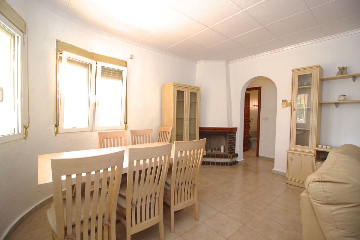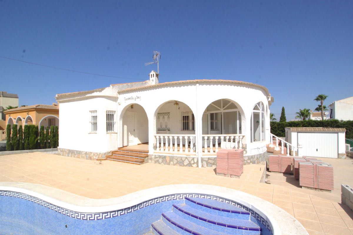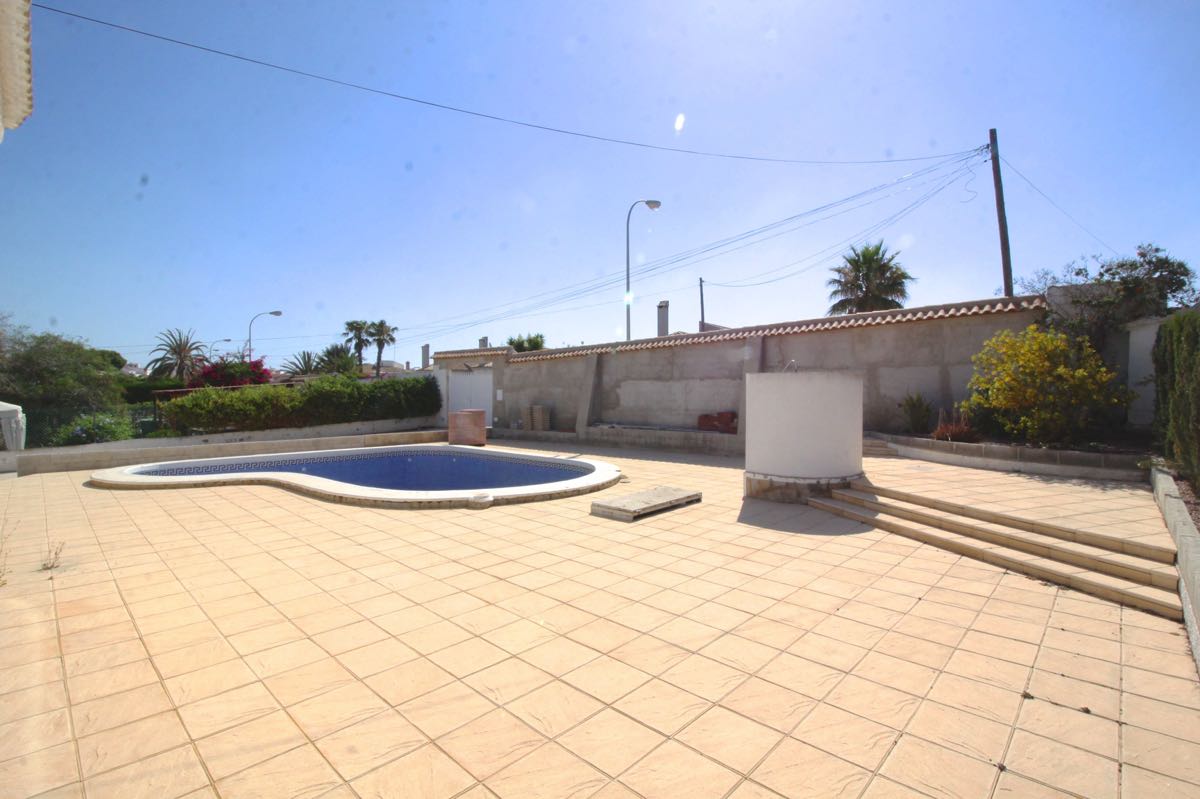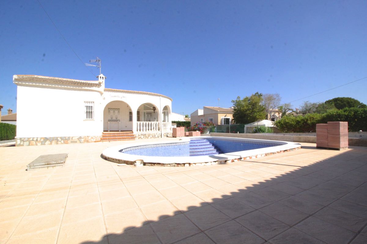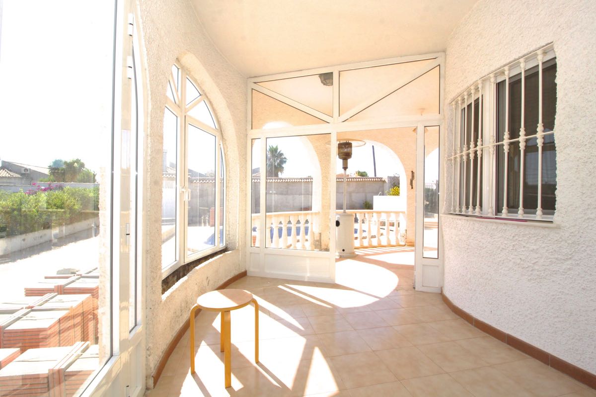 Lovely traditional 4 bedroom spanish villa in La Siesta, Torrevieja. The villa is located on a more than 800 m2 big plot, offering lots of terrace area and a private swimming pool. When entering the villa you will find a glazed-in terrace. The open kitchen, dining area and living room gets lots of natural sunlight from the windows towards the terrace. In one part of the villa you will find two double bedrooms and a bathroom, while on the other you will find a third bedroom and another bathroom.
