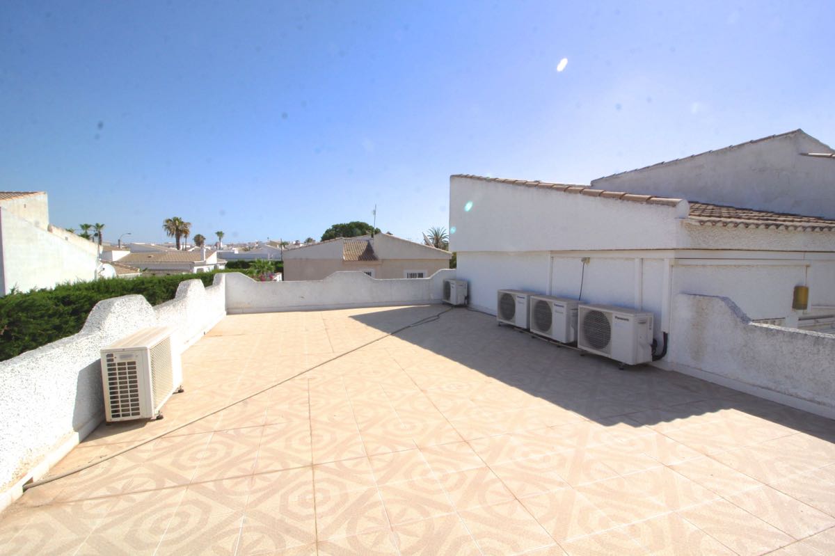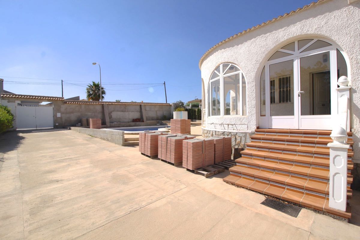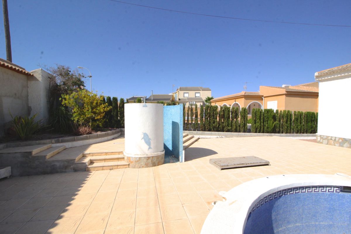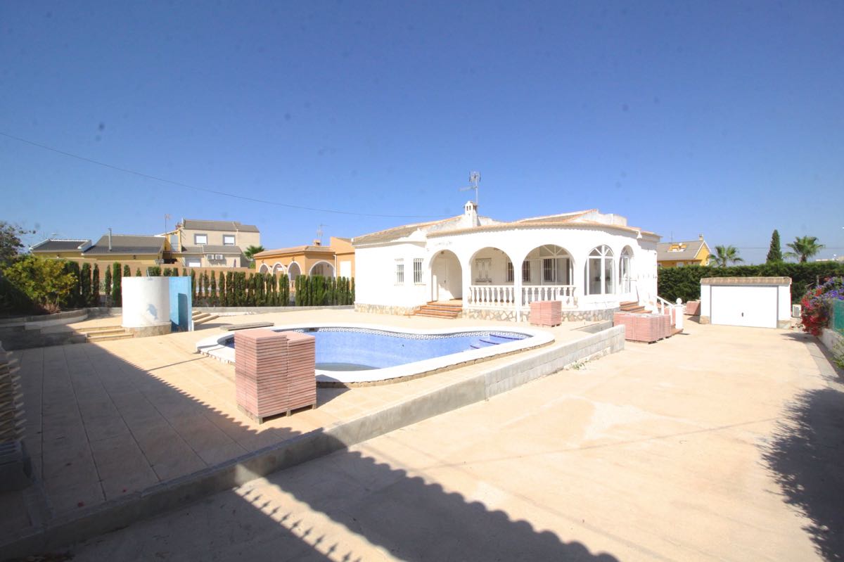 Lovely traditional 4 bedroom spanish villa in La Siesta, Torrevieja. The villa is located on a more than 800 m2 big plot, offering lots of terrace area and a private swimming pool. When entering the villa you will find a glazed-in terrace. The open kitchen, dining area and living room gets lots of natural sunlight from the windows towards the terrace. In one part of the villa you will find two double bedrooms and a bathroom, while on the other you will find a third bedroom and another bathroom.
