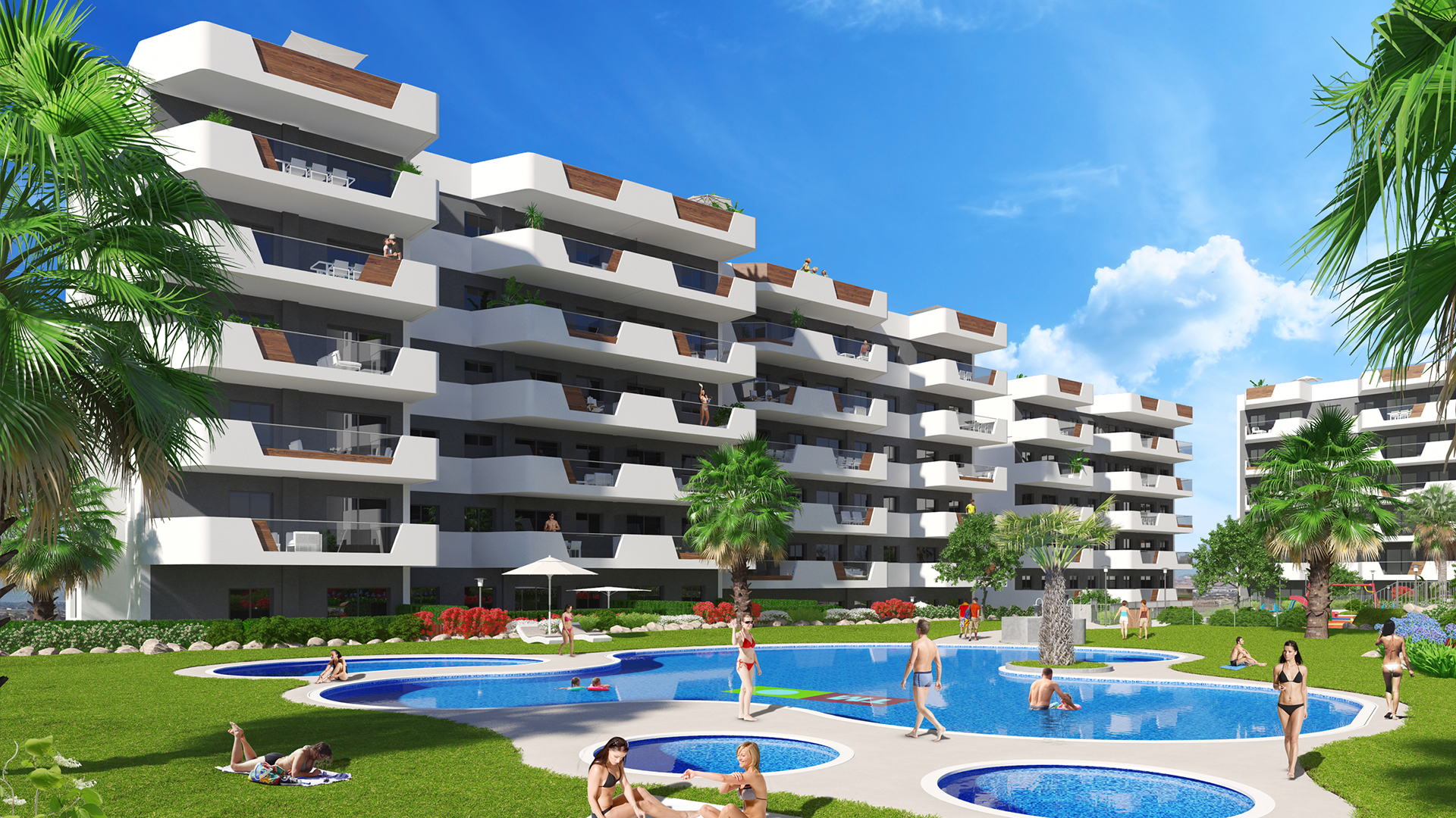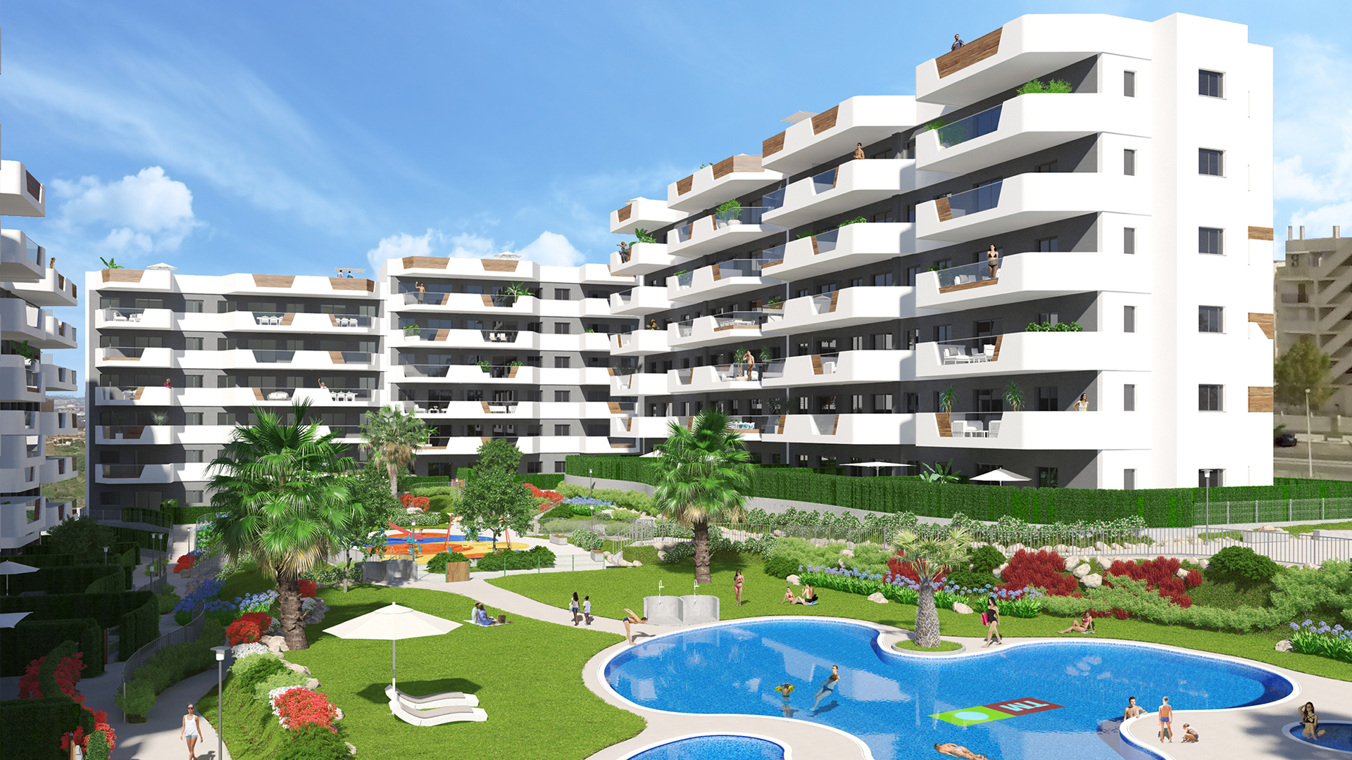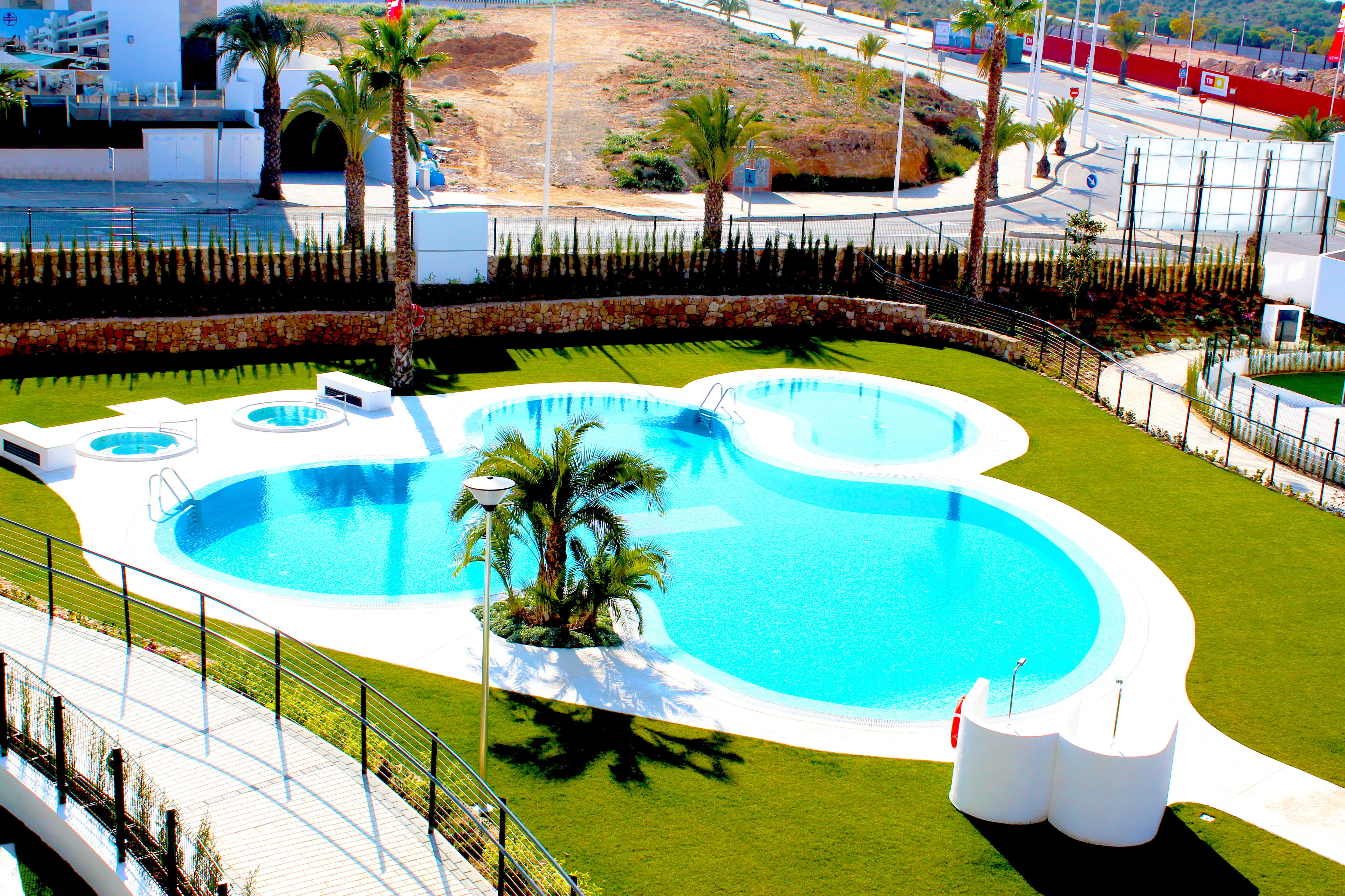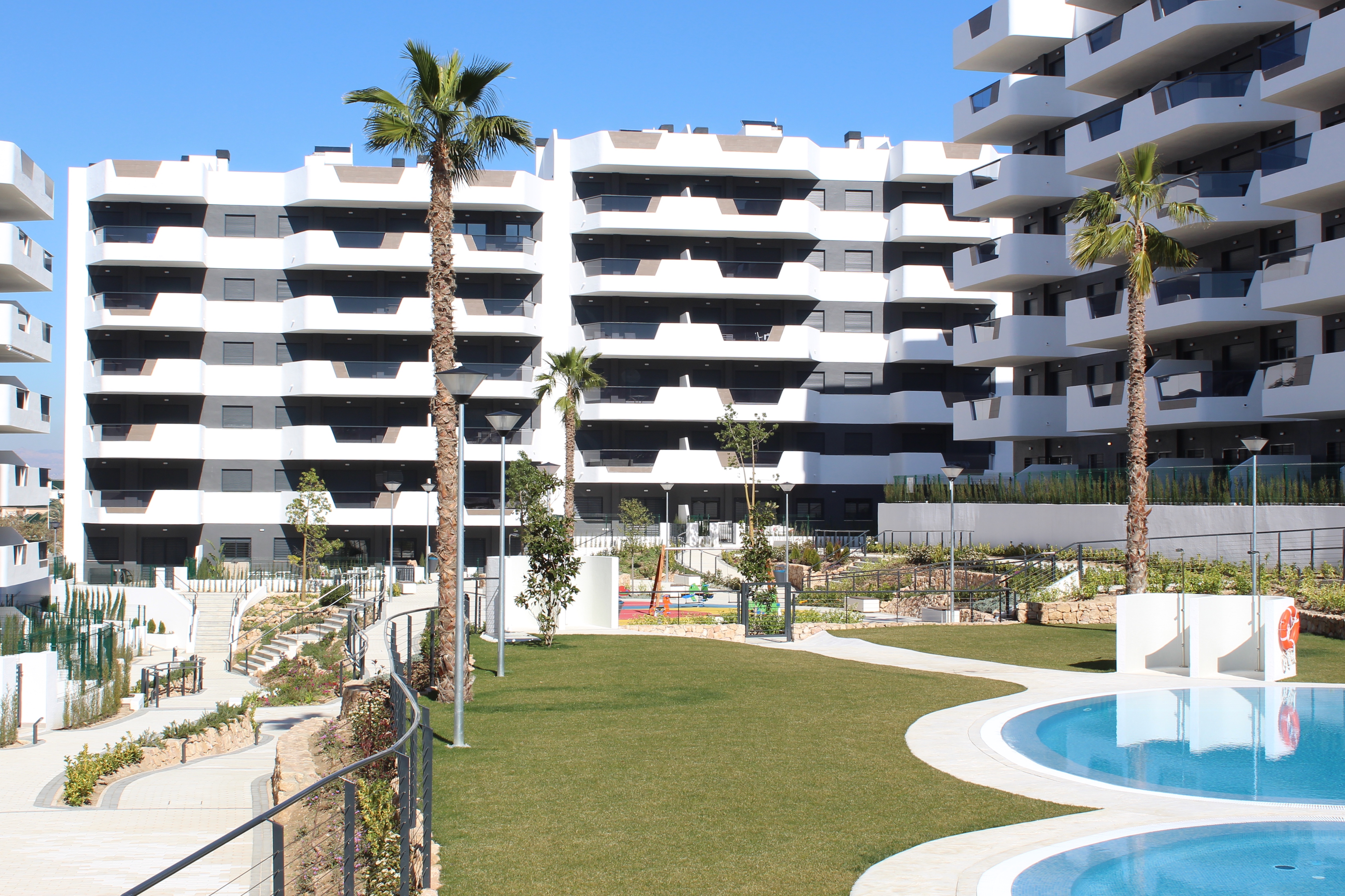 This lovely 2 bedroom 2 bathroom apartment have a light and spacious lounge with dining area, kitchen with a range of wall and base units, 2 double bedrooms both of which have fitted wardrobes and one of which has en-suite bathroom and a large family bathroom. There is a large balcony facing west, where you have plenty of space for a dining area as well as chill-out lounge area. You can sit and enjoy the views to the beautiful pool area, as well as the magnificent mountain landscape behind Elche which turns into a pink paradise view at sunset.
