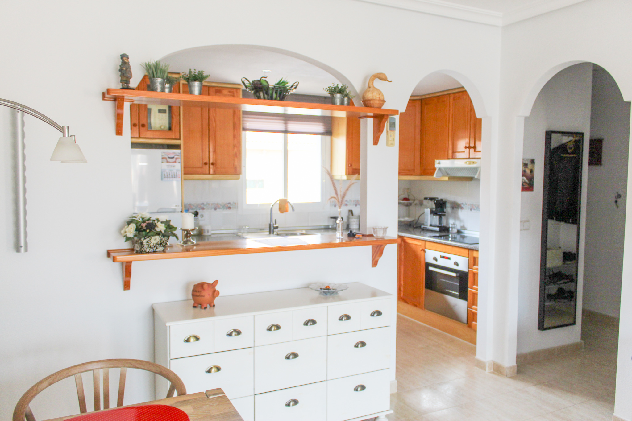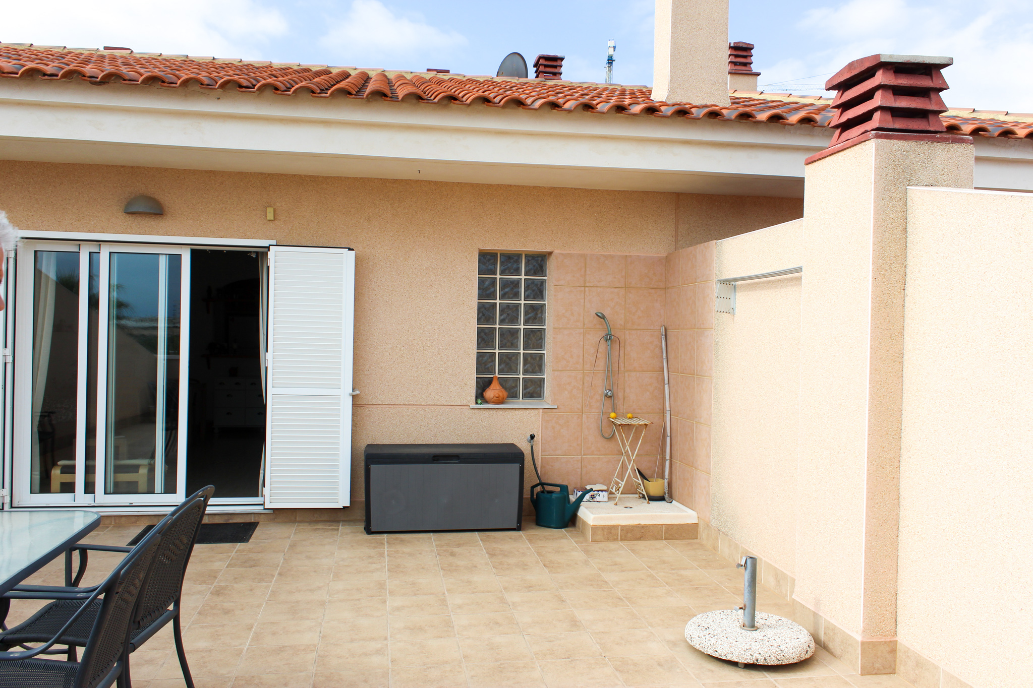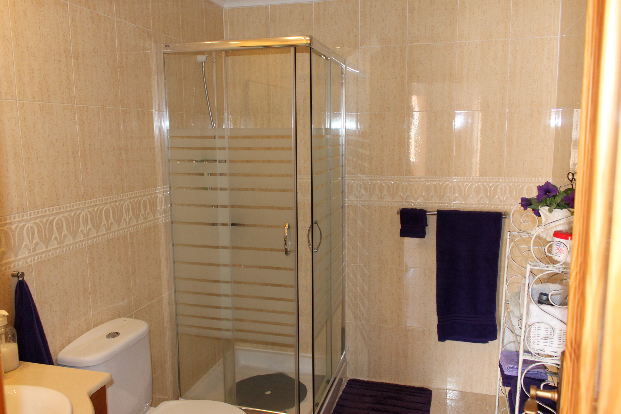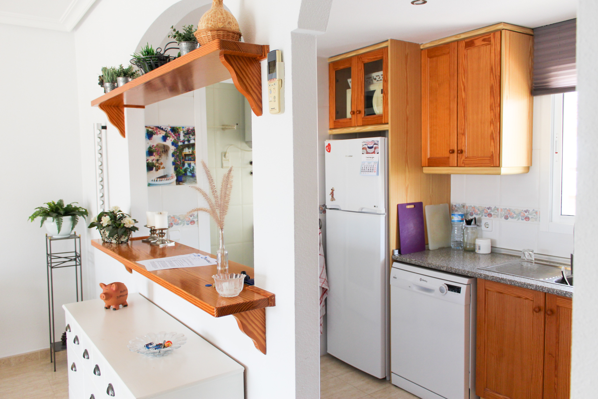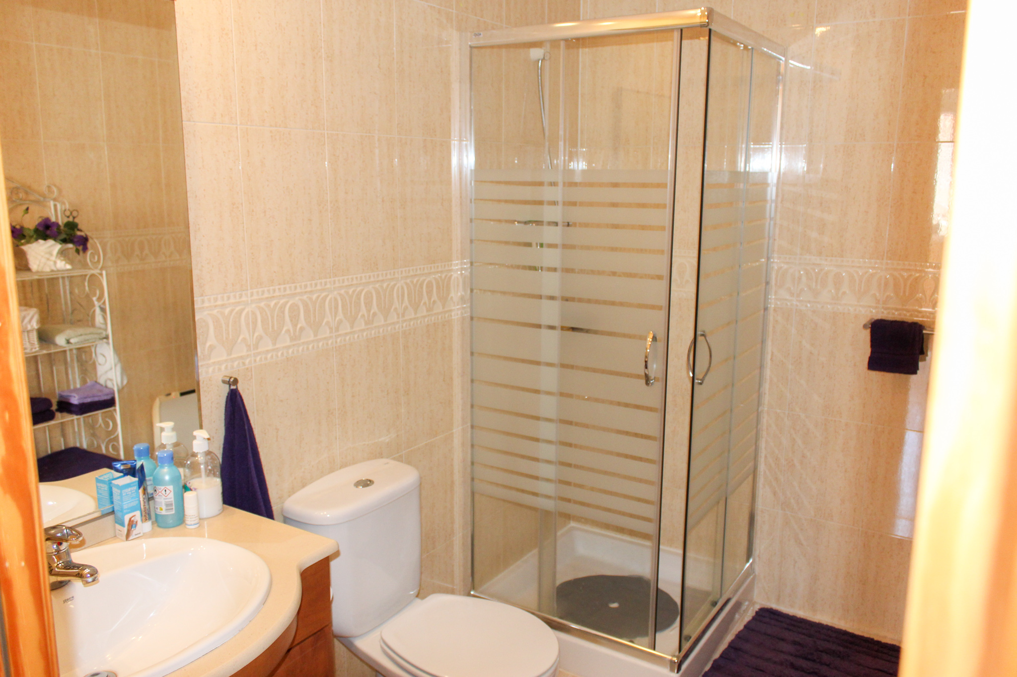 The first floor, which is where you enter the home, consists of an entrance hall, large kitchen/ living room with access to a utility/storage room and bathroom. From the bright living room, which has air con installed, there is also access to the large roof terrace, from which you have a view of the neighbouring town, Los Arenales del Sol, and not least to the Mediterranean. On the terrace there is sun all day.