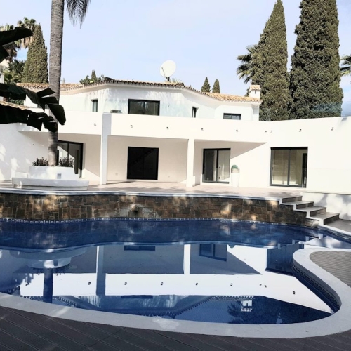 Detached villa in the Blue Lagoon area. The villa, which is 105 m2, consists of 3 bedrooms, 2 bathrooms, large living room with a semi-open kitchen. 2 large terraces on the upper floor and large terraces on the ground floor which allows you to enjoy sun or shade at any time of the day. Own parking on the plot. The property is part of a small urbanization with a lovely shared pool. Walking distance to a large number of bars and restaurants and also the La Fuente shopping center is only a short distance away.