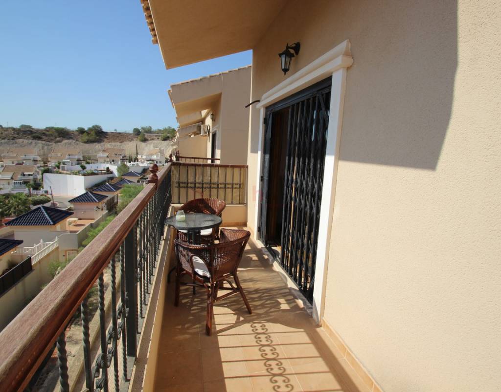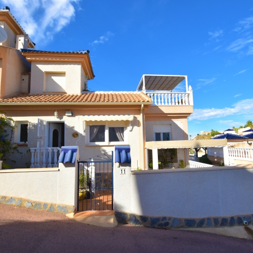 This nice south facing townhouse is situated in Ciudad Quesada and has a living area of 101 sqm. The house consists of three bedrooms, two bathrooms, a toilet, large living room with lounge area, spacious and fully furnished kitchen, an utility room and a storage room.The house has air conditioning and fitted wardrobes. OUTDOOR AREA The townhouse is located in a complex with 16 houses. Here you will find a large swimming pool which can only be used by the residents. The townhouse has a 142 sqm plot, with an area for parking, nice seating areas and a lovely balcony on the first floor with fantastic views over the surrounding area. AREA The property is located in Ciudad Quesada, a charming place on the Costa Blanca. Here you will find an 18-hole golf course, tennis courts, spa, water park, bowling, mini golf, shops, bars, restaurants and much more. The beautiful beaches of Guardamar and La Mata is just a 10 minute drive from Quesada. Torrevieja, a cozy city with a vibrant city life, is only a 10 minute drive away. The airports in Alicante and San Javier / Murcia are about 40 minutes away.