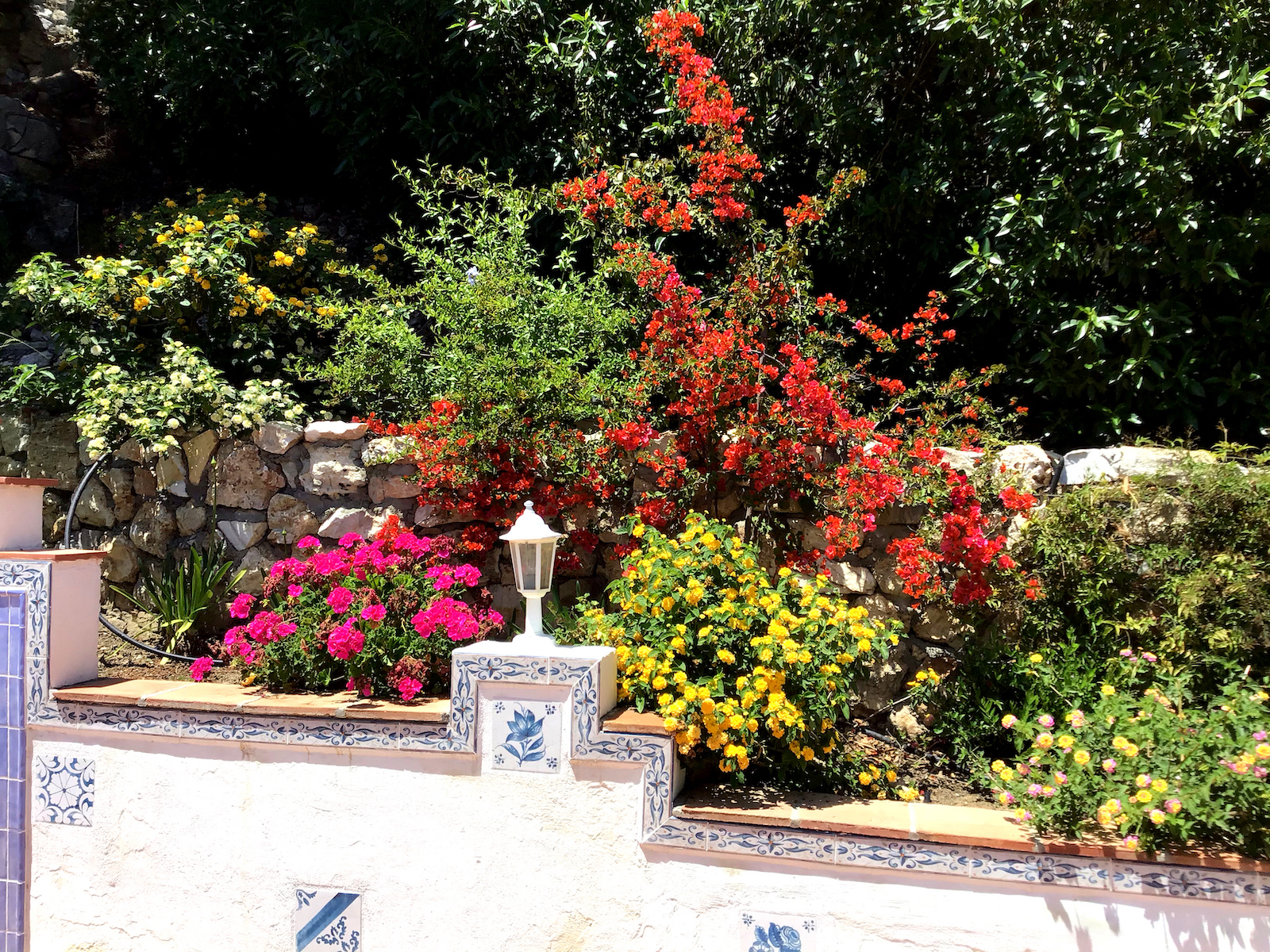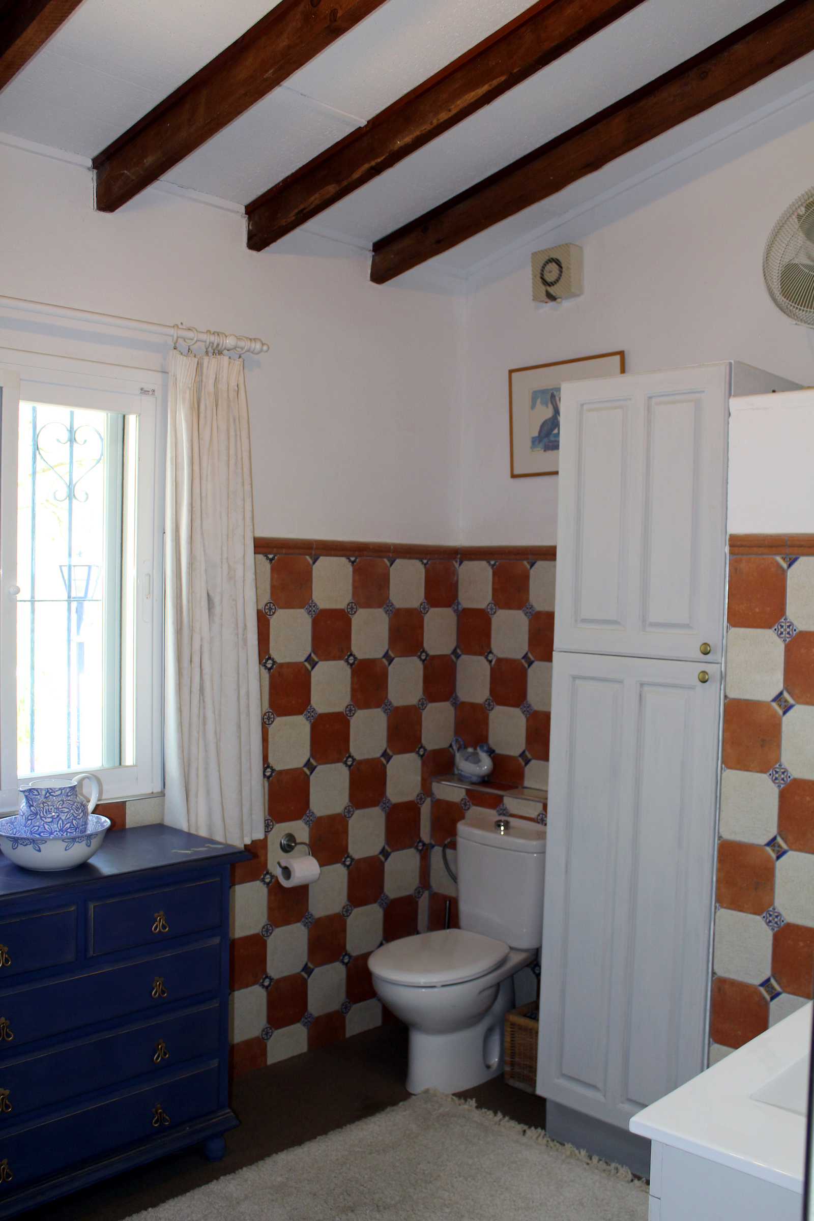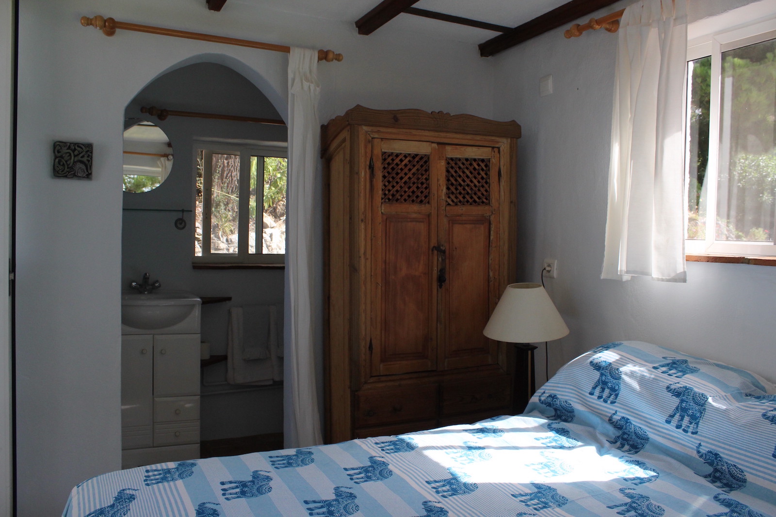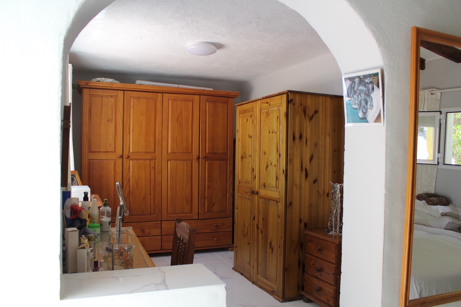 There is access to both sides of the house from here with each side enjoying sea views with the added benefit of the morning sun from one side and the afternoon sun from the other, so there is always a terrace in the sun. The living room has high ceilings with wood beams and a huge, lovely wood burner that can heat up the whole house during the winter months. The kitchen is more contemporary and yet retains its rustic style and is open to the living room. From the living room there is access to the two double bedrooms with fitted wardrobes, wood beams and extra storage. These bedrooms share a spacious bathroom with plenty of light. The end of the hall leads to the private master suite comprising bedroom, bathroom and a dressing room, which could double up as a nursery or small office. The master bedroom has access directly to one of the terraces and from this terrace a staircase leads to the guest room with its own bathroom. From this lovely room the guests have panoramic views to the mountains and sea. At the foot of the guest room stairs there is a delightful terrace which has a covered area for a hand-tiled outdoor dining table. From here a path with a few steps leads to another sitting area where the views to the mountain and sea can be enjoyed. The outdoor area is landscaped with several good terraces, beautiful flowers and trees.