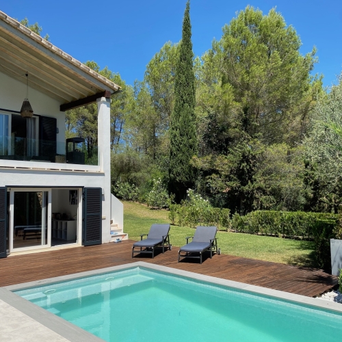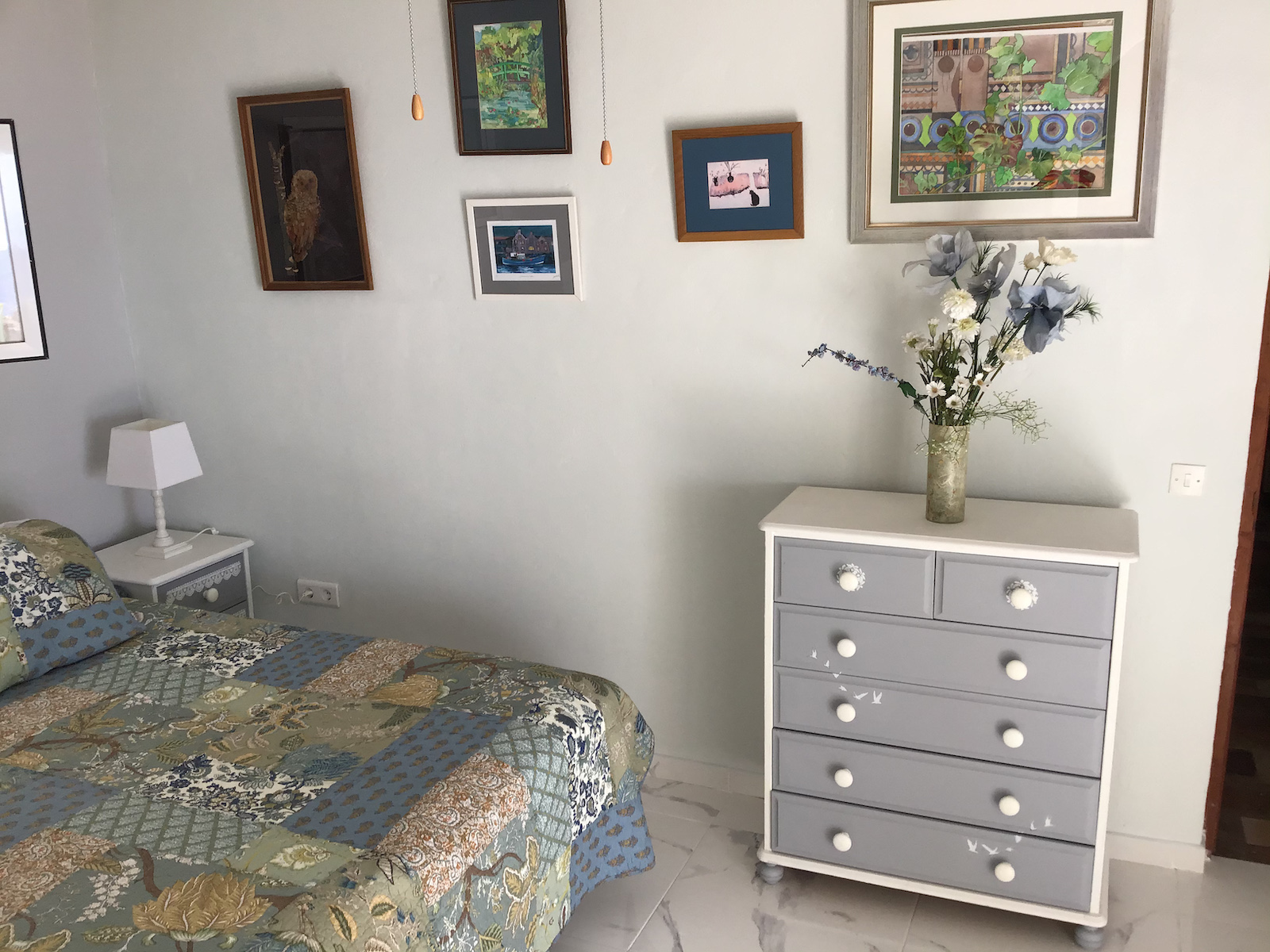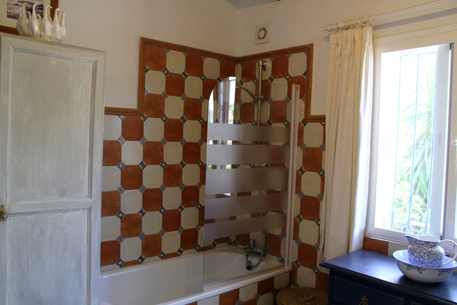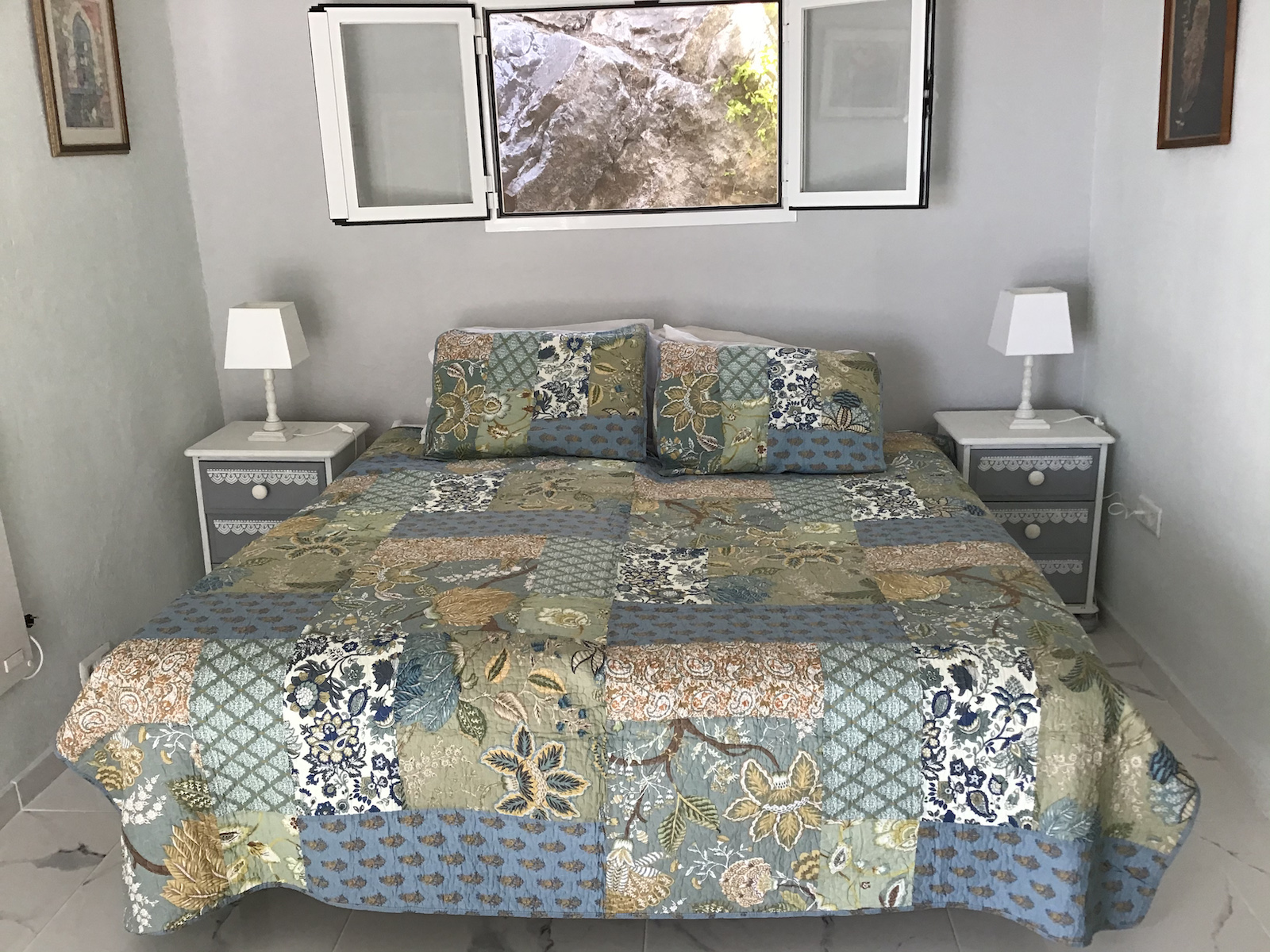 There is access to both sides of the house from here with each side enjoying sea views with the added benefit of the morning sun from one side and the afternoon sun from the other, so there is always a terrace in the sun. The living room has high ceilings with wood beams and a huge, lovely wood burner that can heat up the whole house during the winter months. The kitchen is more contemporary and yet retains its rustic style and is open to the living room. From the living room there is access to the two double bedrooms with fitted wardrobes, wood beams and extra storage. These bedrooms share a spacious bathroom with plenty of light. The end of the hall leads to the private master suite comprising bedroom, bathroom and a dressing room, which could double up as a nursery or small office. The master bedroom has access directly to one of the terraces and from this terrace a staircase leads to the guest room with its own bathroom. From this lovely room the guests have panoramic views to the mountains and sea. At the foot of the guest room stairs there is a delightful terrace which has a covered area for a hand-tiled outdoor dining table. From here a path with a few steps leads to another sitting area where the views to the mountain and sea can be enjoyed. The outdoor area is landscaped with several good terraces, beautiful flowers and trees.