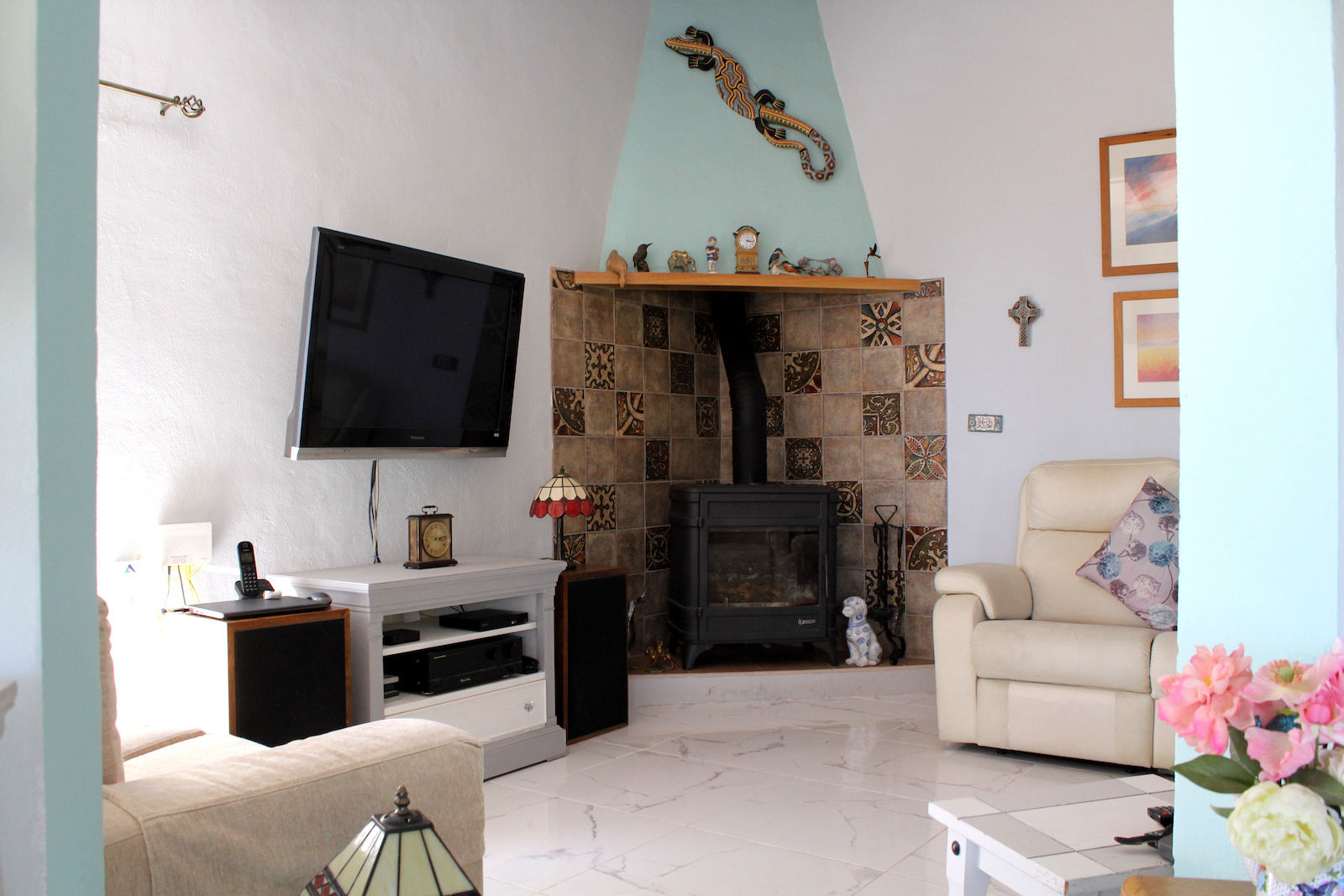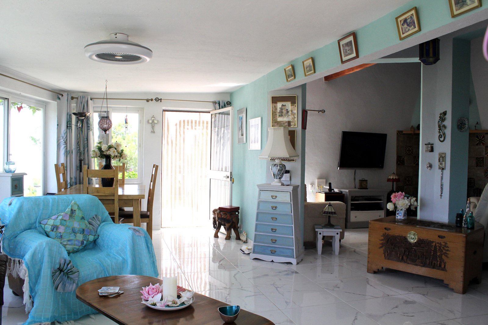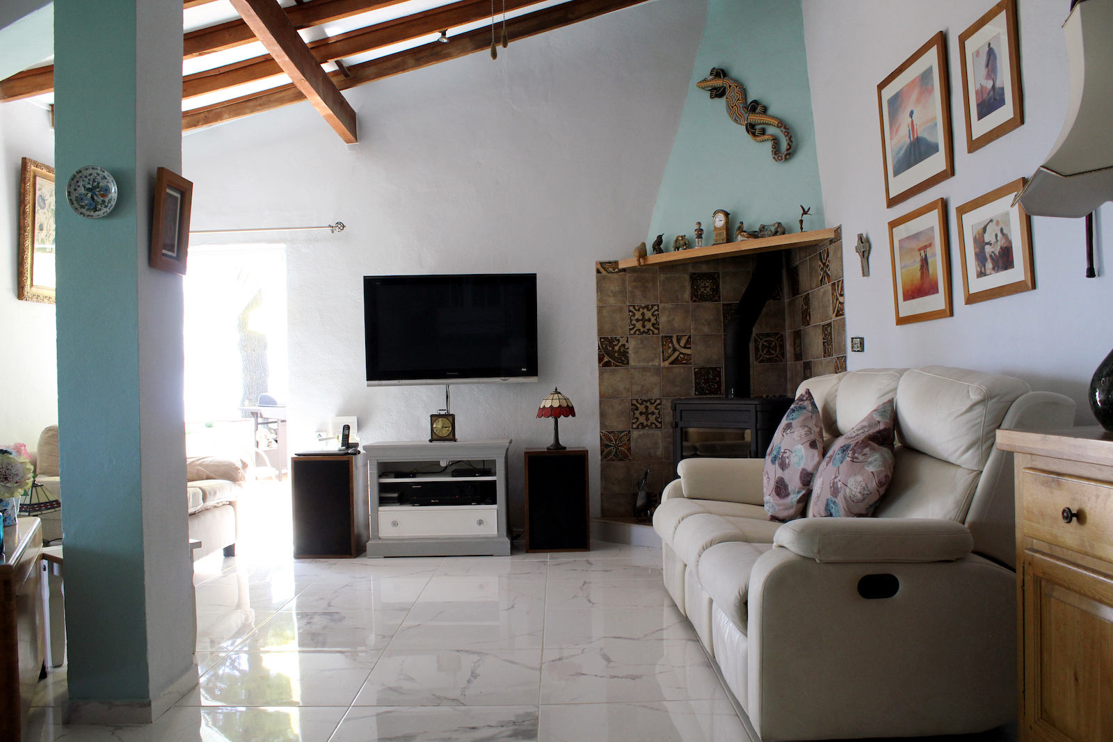The villa has a private driveway, gate and parking with garage and a storage/laundry room. A path leads through the flowerbeds and garden to the entrance of the house through a hand-crafted wooden door that opens into the spacious living, dining, and kitchen area. This lovely room benefits from huge double-glazed glass windows that allow the stunning and beautiful sea and mountain views to come directly into the living room which can be enjoyed all the year round.