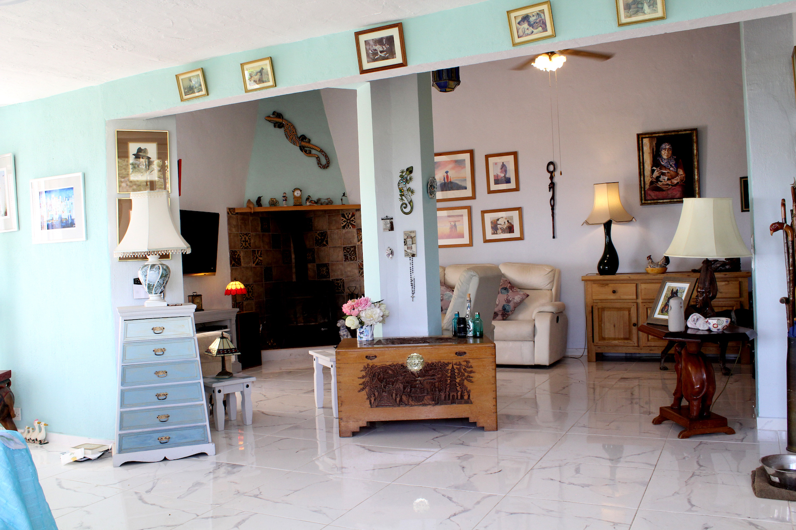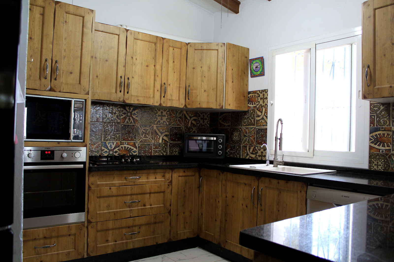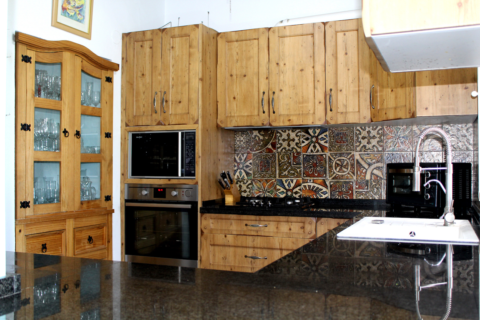 The villa has a private driveway, gate and parking with garage and a storage/laundry room. A path leads through the flowerbeds and garden to the entrance of the house through a hand-crafted wooden door that opens into the spacious living, dining, and kitchen area. This lovely room benefits from huge double-glazed glass windows that allow the stunning and beautiful sea and mountain views to come directly into the living room which can be enjoyed all the year round.