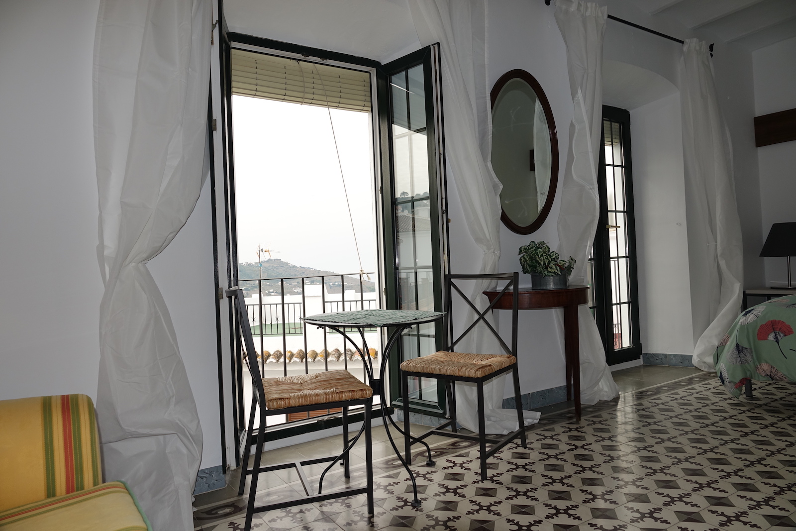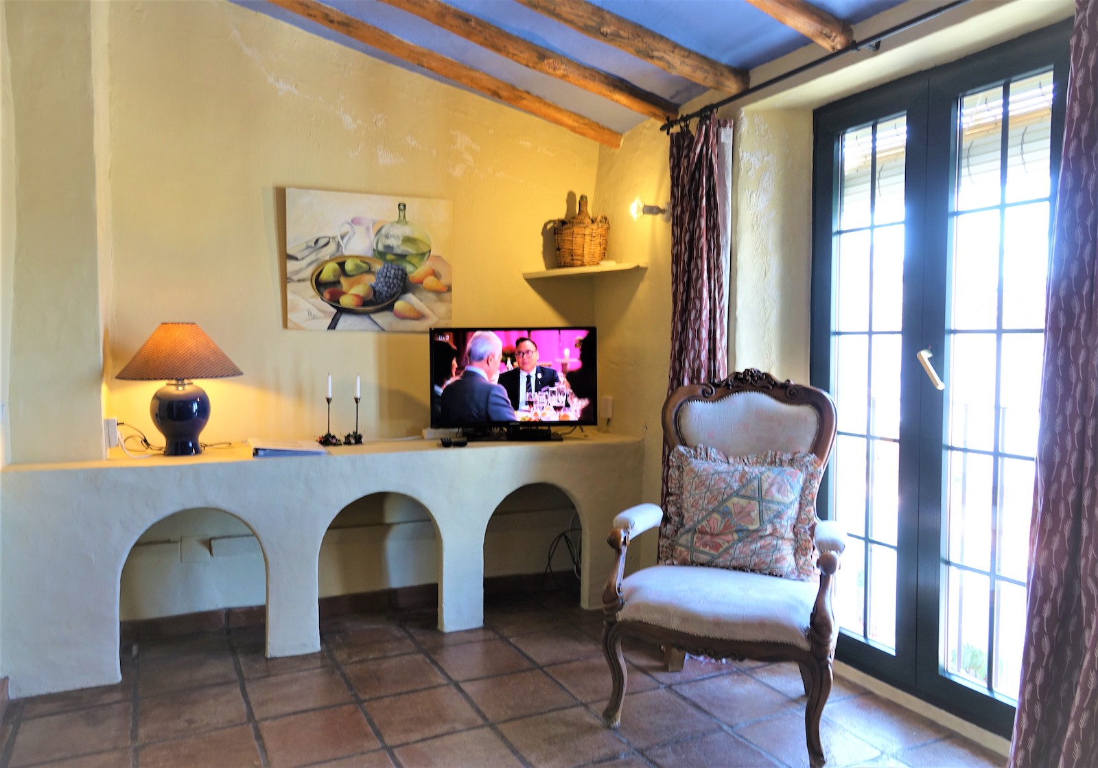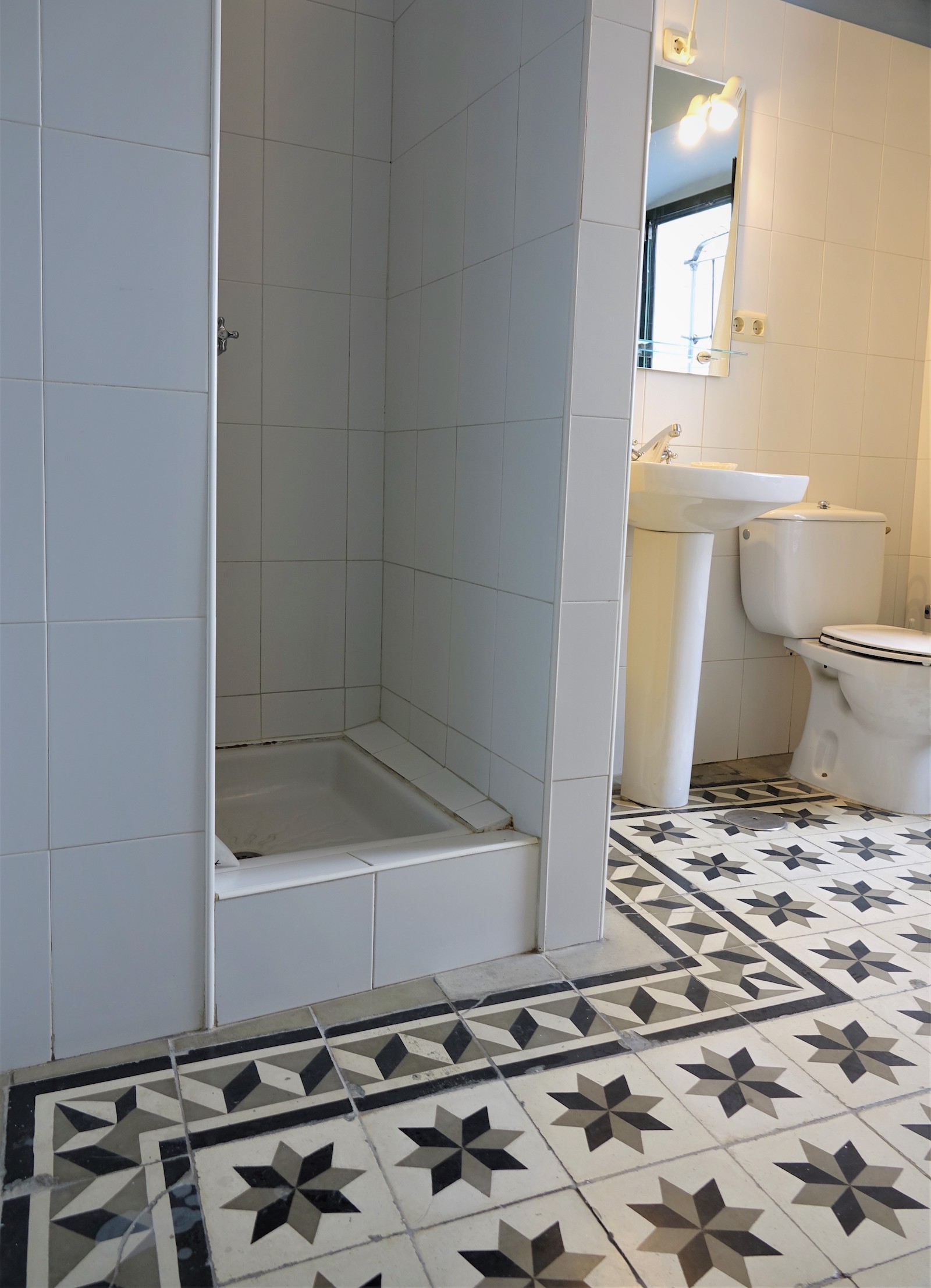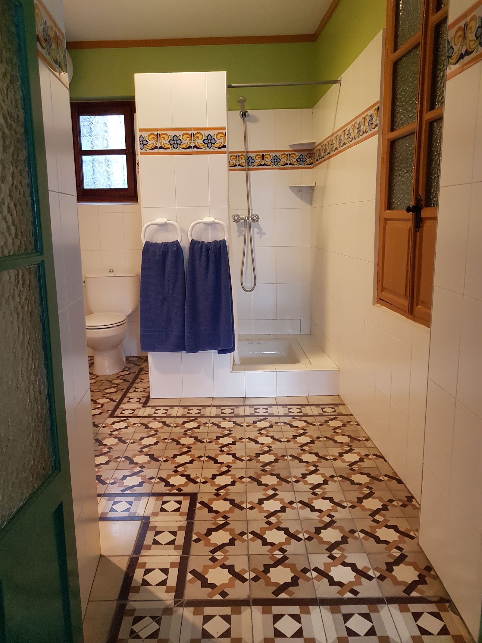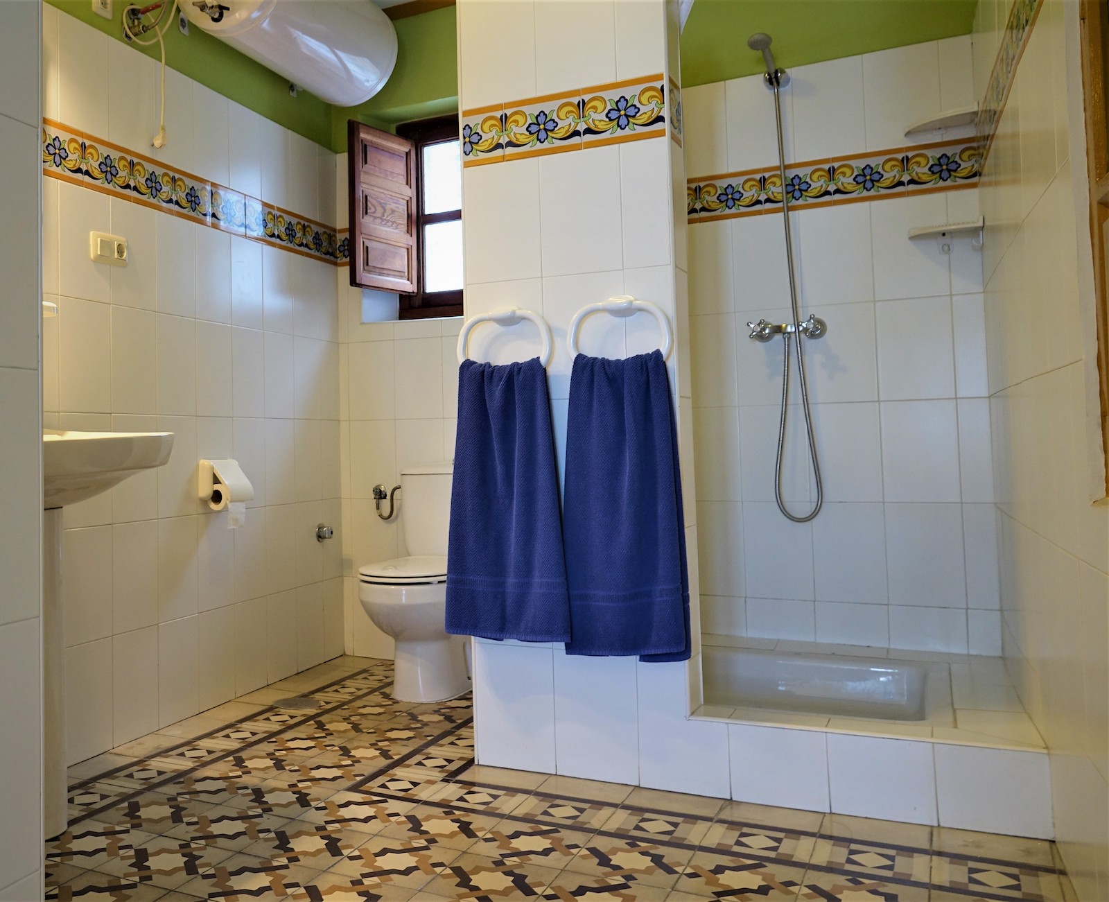 Outside the bar area you follow the steps up to the second floor where double doors lead you through to a small hallway and into the bright and spacious ‘Estudio’ double guest room (23.69 m2) with private bathroom with toilet/shower (3.90 m2). This very bright and comfortable accommodation with double thermopane glazed French doors offers views over the village towards the surrounding hills and the coast in the distance.