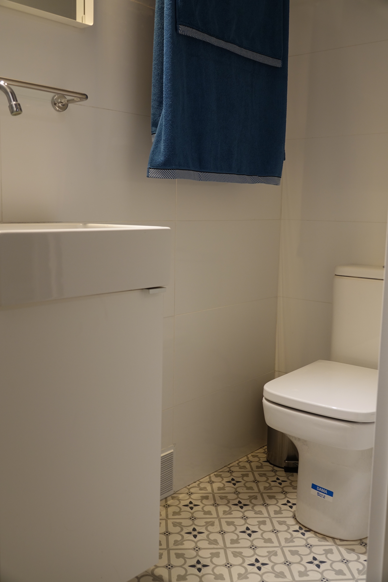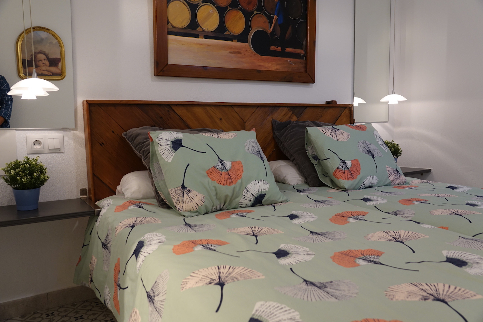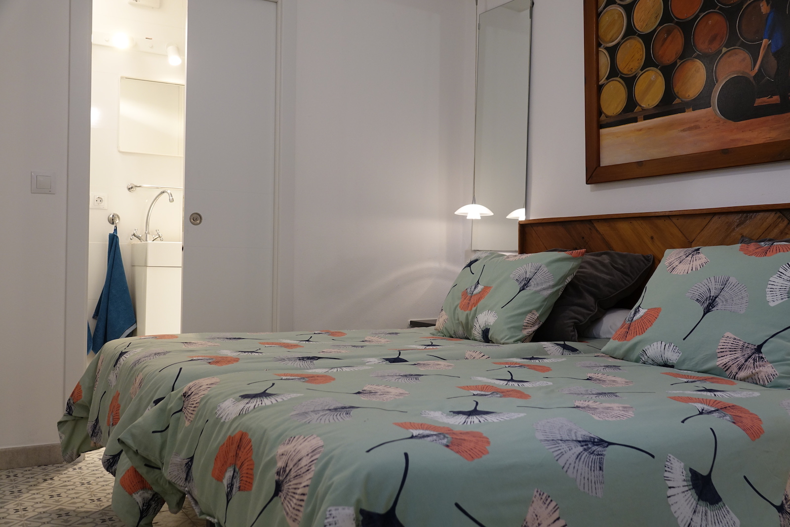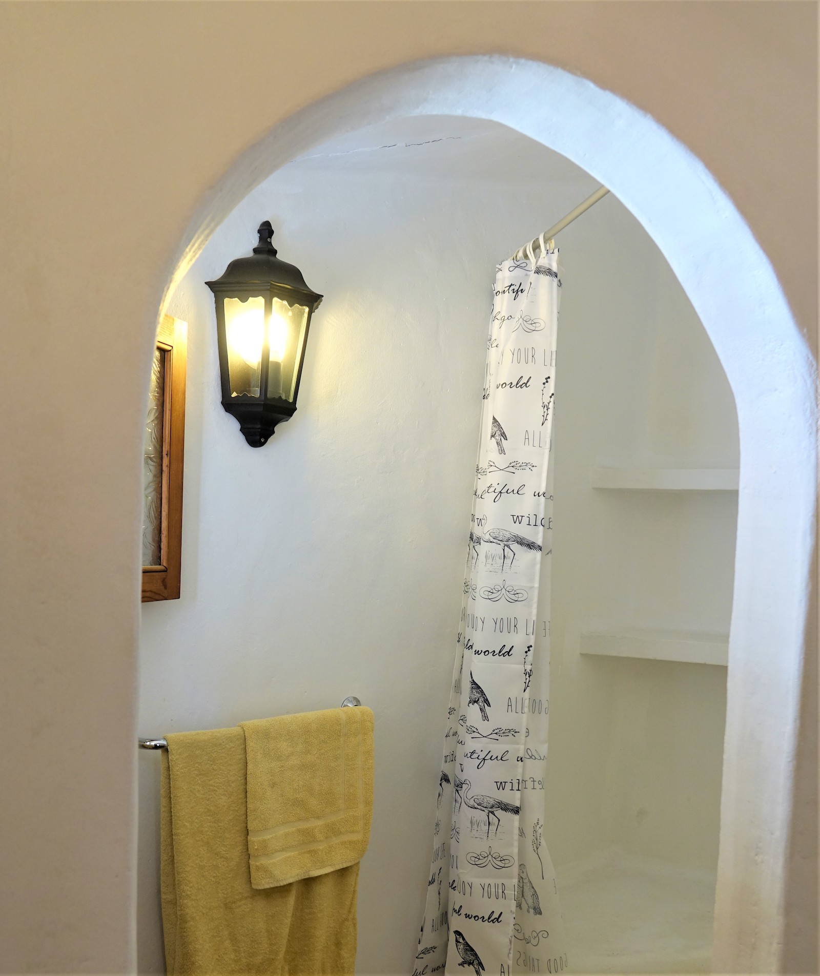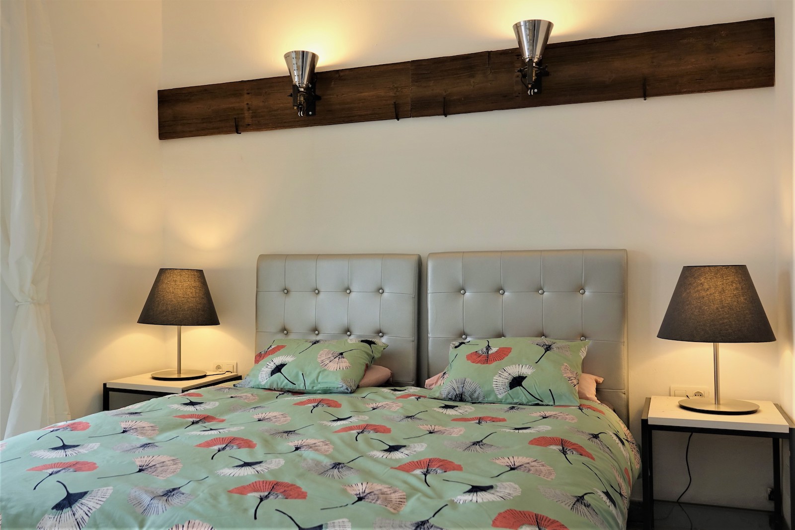 Outside the bar area you follow the steps up to the second floor where double doors lead you through to a small hallway and into the bright and spacious ‘Estudio’ double guest room (23.69 m2) with private bathroom with toilet/shower (3.90 m2). This very bright and comfortable accommodation with double thermopane glazed French doors offers views over the village towards the surrounding hills and the coast in the distance.