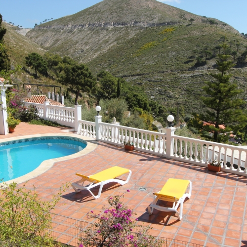 Chalet located on the Competa road, about 8 km from the coast. The plot where the house is situated measures 7,800 m². The house is 110 m², with 3 bedrooms, a living room with wooden ceiling beams, a kitchen, and a bathroom. Terraced porch, swimming pool, and garden. Good access from the road. It includes two water shares from Patamalara. Wi-Fi. Enclosed garage for two cars.