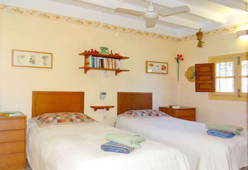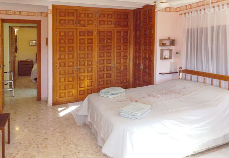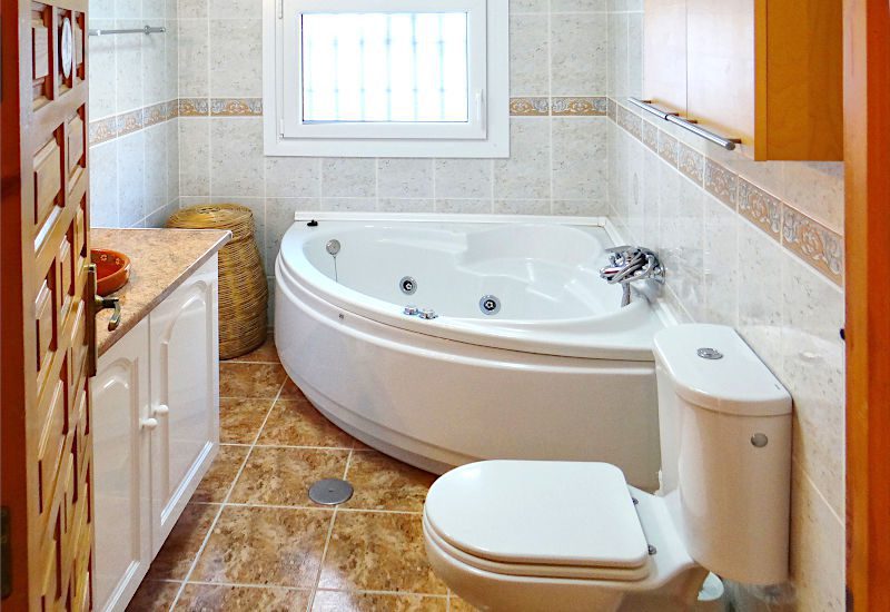 Turning left into the hallway from the kitchen takes us to the bedrooms and bathrooms: a family bathroom (2.95 x 1.90m) with jacuzzi bath and vanity sink unit with storage, a guest bedroom (3.10 x 3.50m) with fitted wardrobes and ceiling fan, a shower room (1.05 x 2.40m) and the master bedroom (5.46 x 3.55m) with fitted wardrobes and again a ceiling fan.