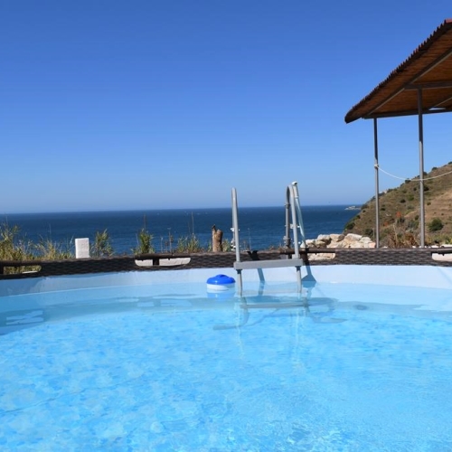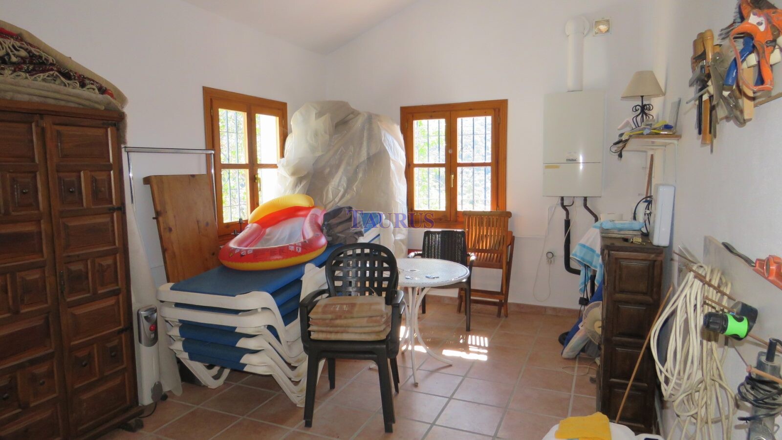 The South-east facing location enjoys fabulous uninterrupted views down to the sea as well as a manageable fenced and gated 1,500 m2 plot with fruit trees and olive grove, a flat area for growing vegetables or extra parking and a brick built BBQ with mirador for relaxing, and outdoor dining under the large bamboo-covered terrace. The 8m x 4m Roman pool is very private, with a walk-in pump room under the terrace.