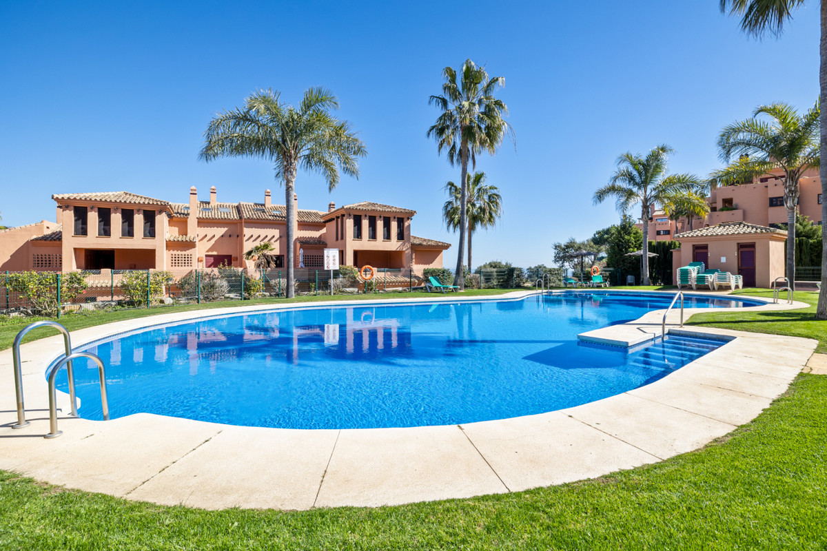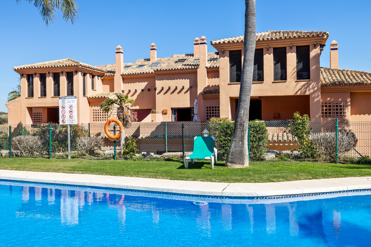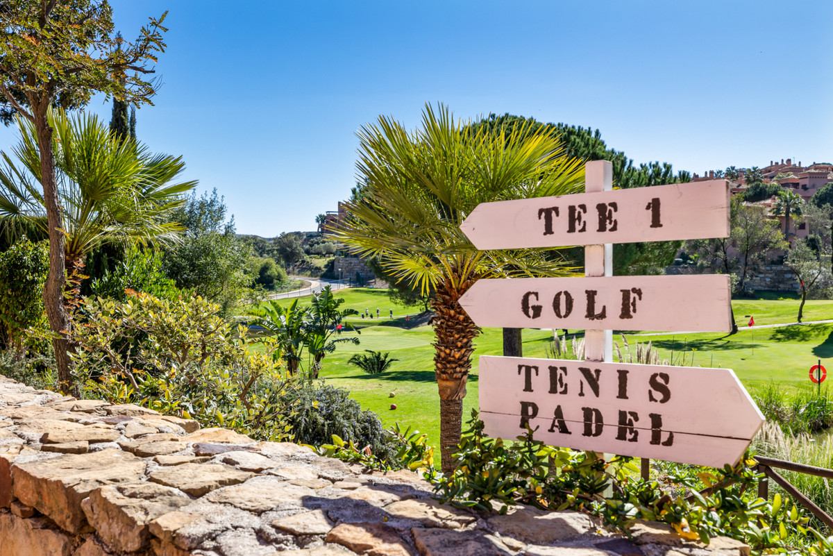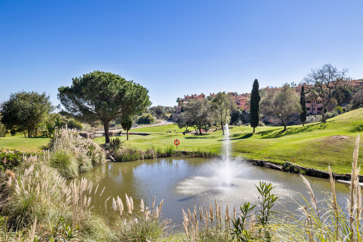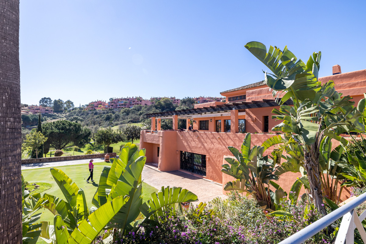 After entering the entrance hall, you find on your left hand the spacious bright living room with high ceilings, floor-to-ceiling doors with sliding function, facing Southwest to the large private terrace and garden with lawn. From the garden which offers sea views, you have your private path down to the one (out of two) communal pool and the beautiful green areas.