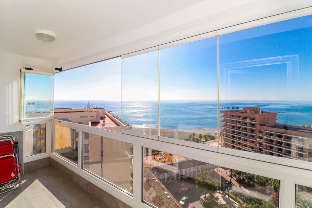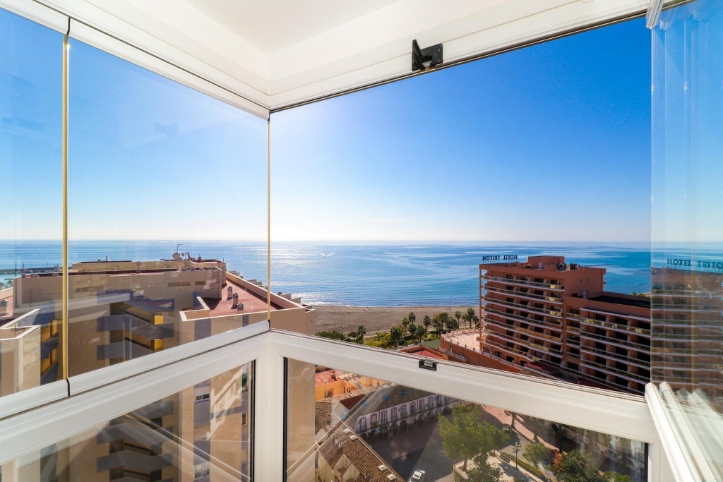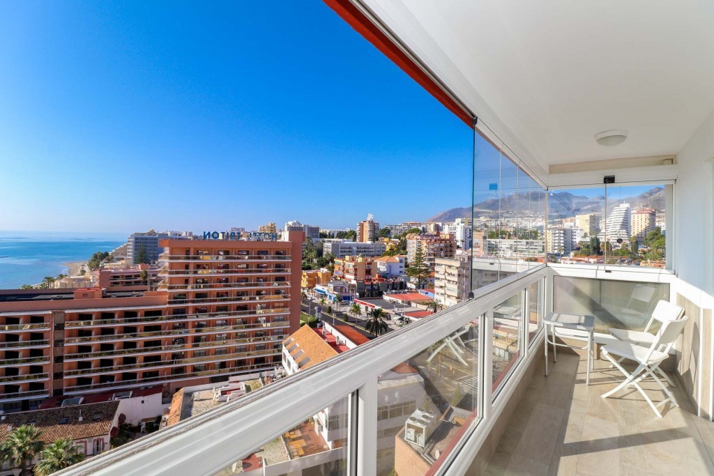 Panoramic see and mountain views from Malaga to Gibraltar and to the peak of the mountain Calamorro in Benalmadena. Southwest ,12th floor