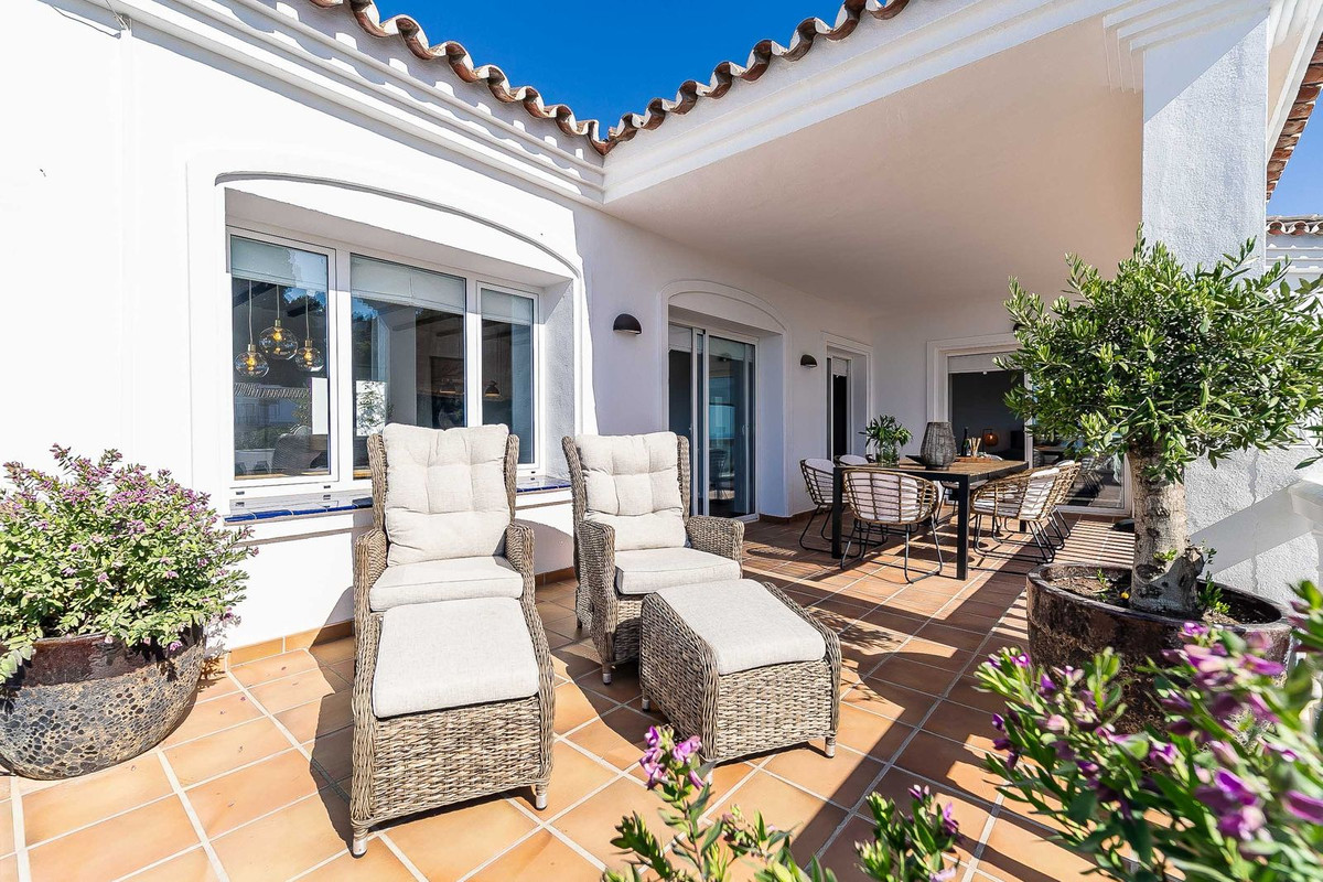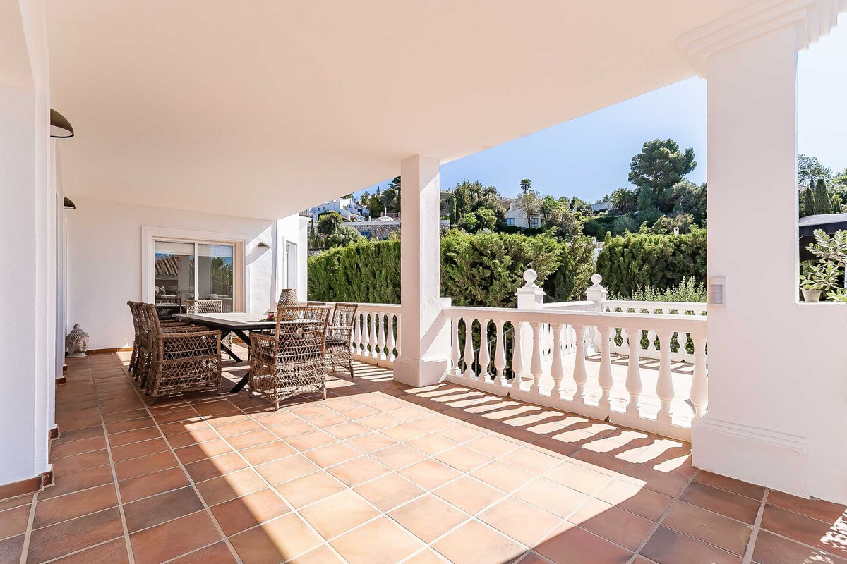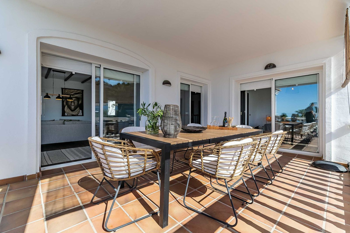 Lower level: This level consists of a bright and spacious hall with high ceiling and furnished with comfortable sofas, 3 spacious bedrooms with fitted wardrobes, 2 of them with direct access to the lower terrace, 3 bathrooms, all of them "én suite" and a 31 m2 south-east facing covered terrace furnished with another large dining table and direct access to the garden and pool area.