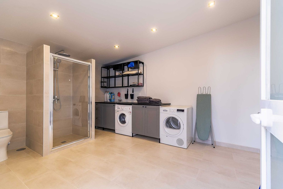 Garden & pool area: In the pool area you will find comfortable garden furniture, parasols and sunbeds as well as exotic plants, which makes the entire outdoor area so beautiful. There is also a fully equipped outdoor kitchen, BBQ, shower and a laundry room with washing machine, dryer and bathroom. There is a gated carport/garage.