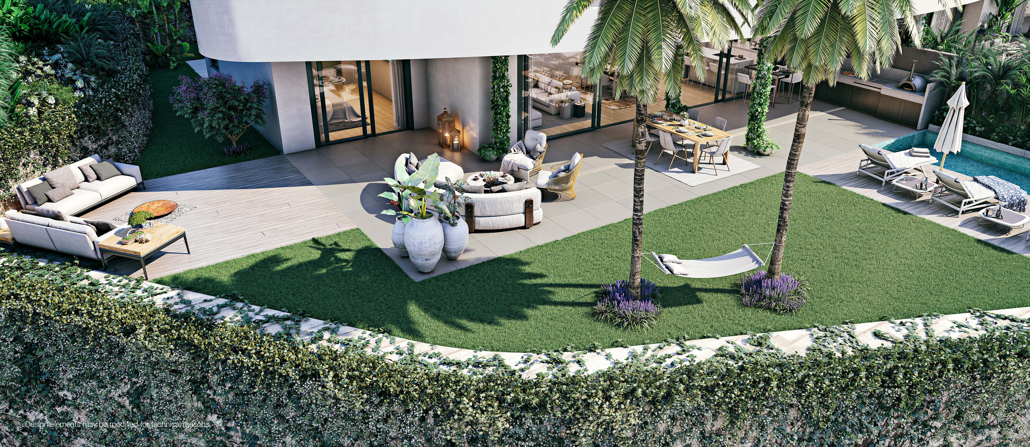 From the large open kitchen and living room there are sliding doors all the way to the south-facing terrace of 45m2, and in addition there is a large private garden, where you also have the opportunity to put in a private pool, if wanted.