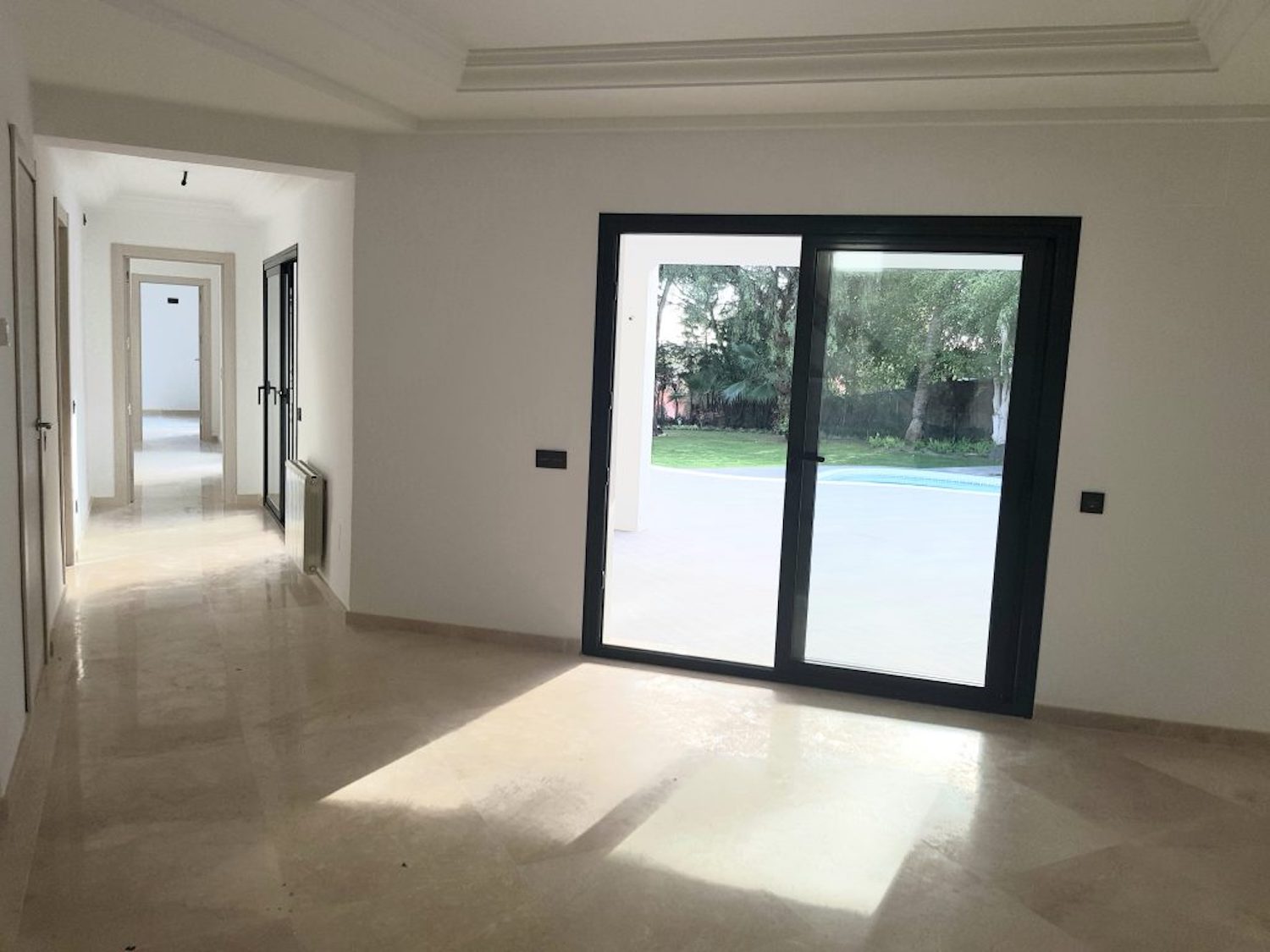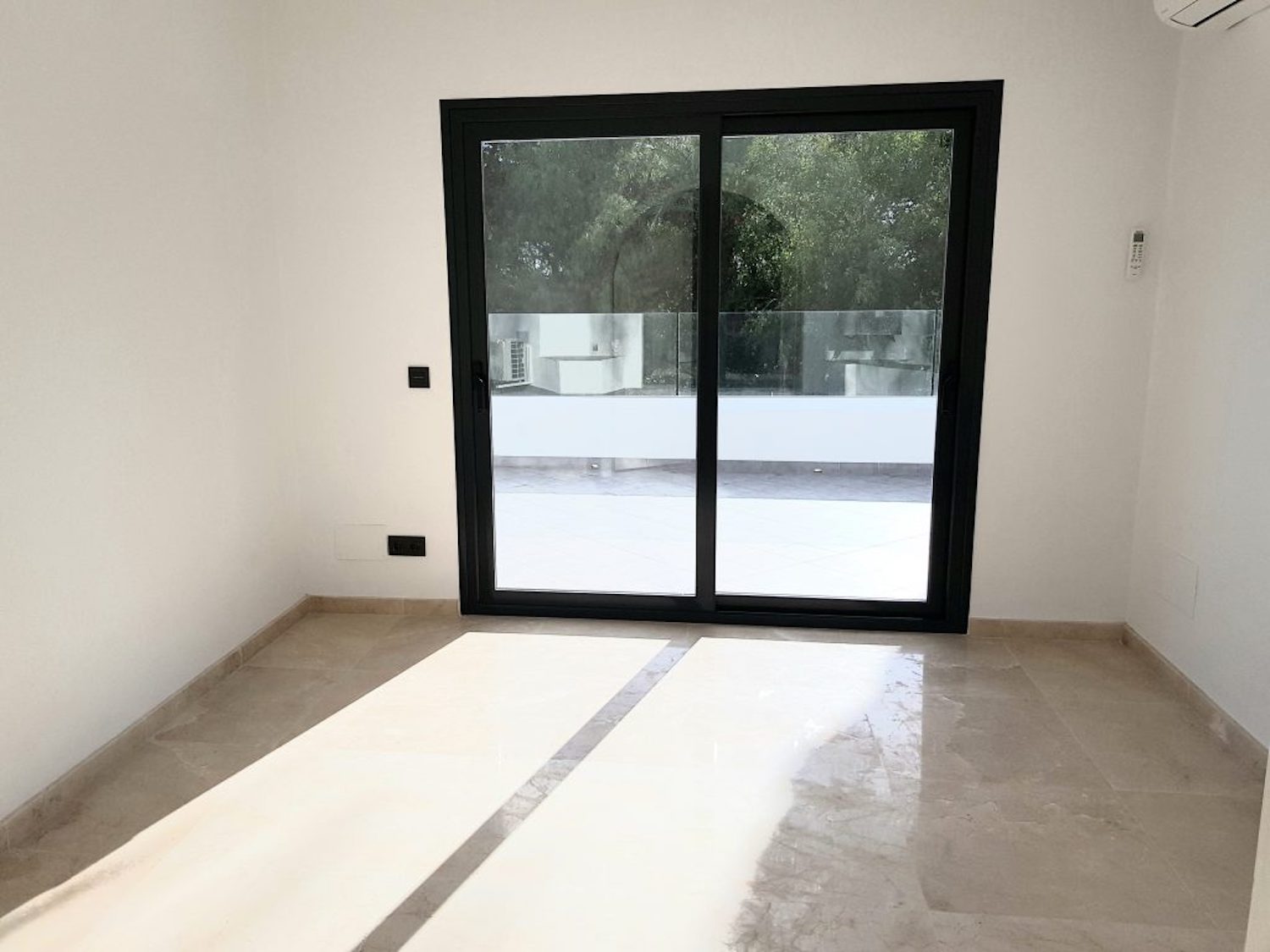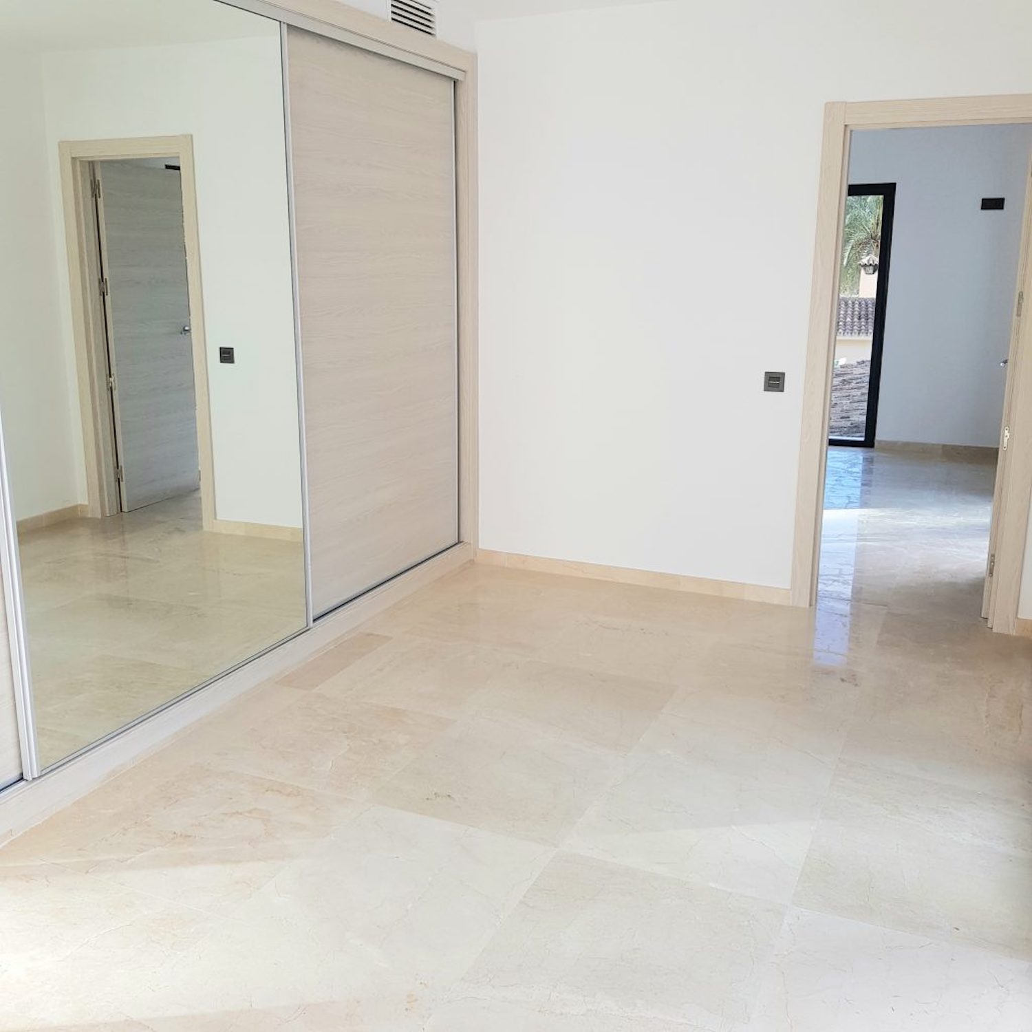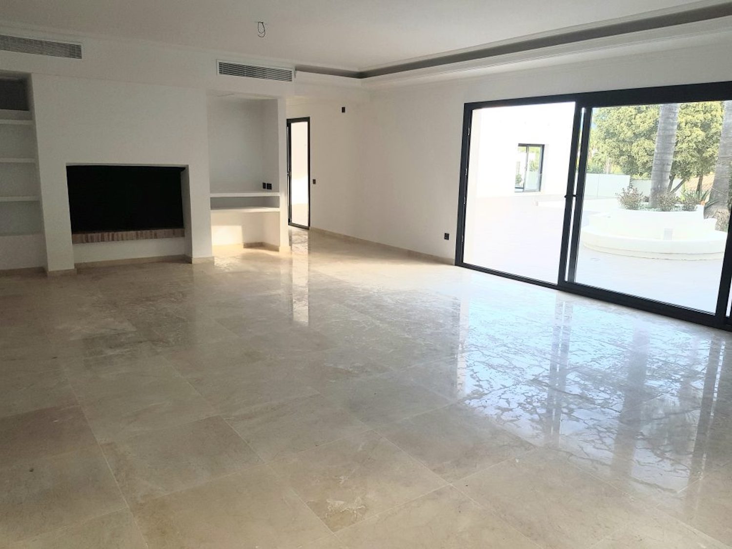 The entrance offers a spacious hallway, which leads in to the separate but open plan kitchen with a dining area. The living room is spacious and has a fireplace. On this floor there is one double bedroom en suite and the master bedroom en suite, with a walk in closet. All rooms have direct access to the terraces and pool area offering beautiful views towards the golf course and La Concha mountain. At the first floor there two bedrooms en suite, with an office room in between.