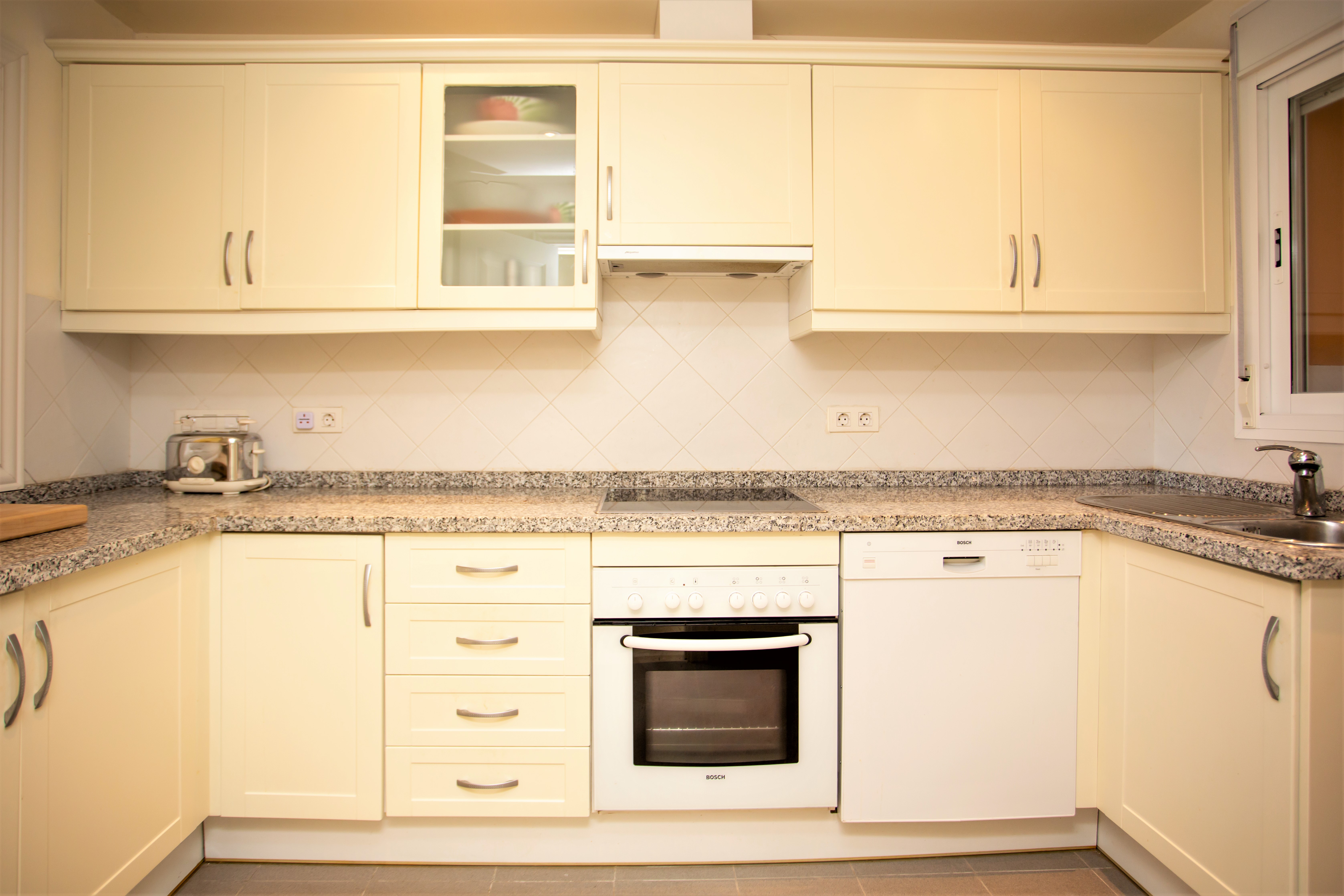 On the ground level of the property you can find a spacious living room with a fireplace, separate fully fitted kitchen and a guest bathroom. From the living room you have a direct access to the terrace and a private garden, a prefect place to enjoy some peace and tranquility. There are stairs from the garden,which leads into the communal garden and swimming-pool area.