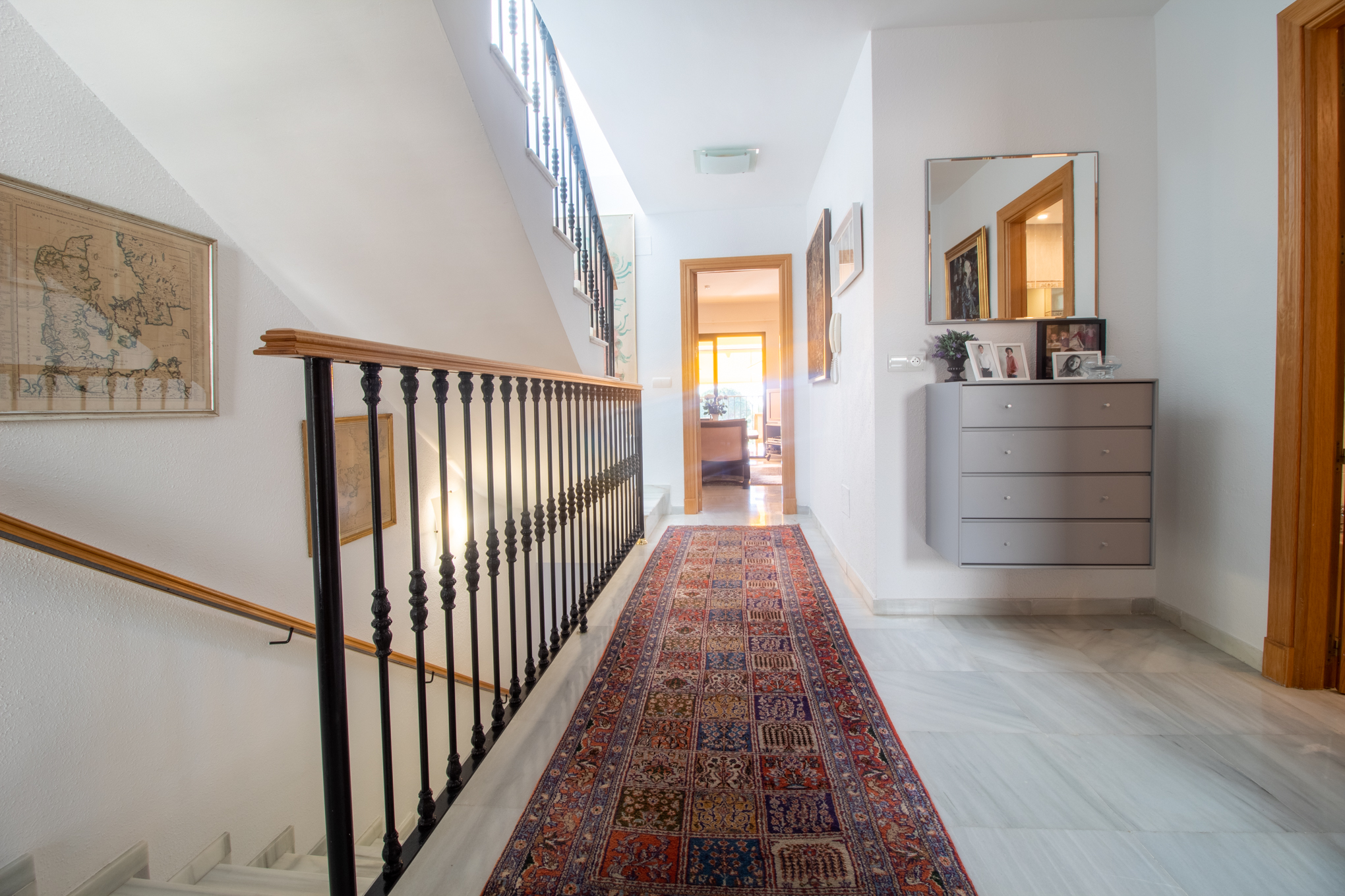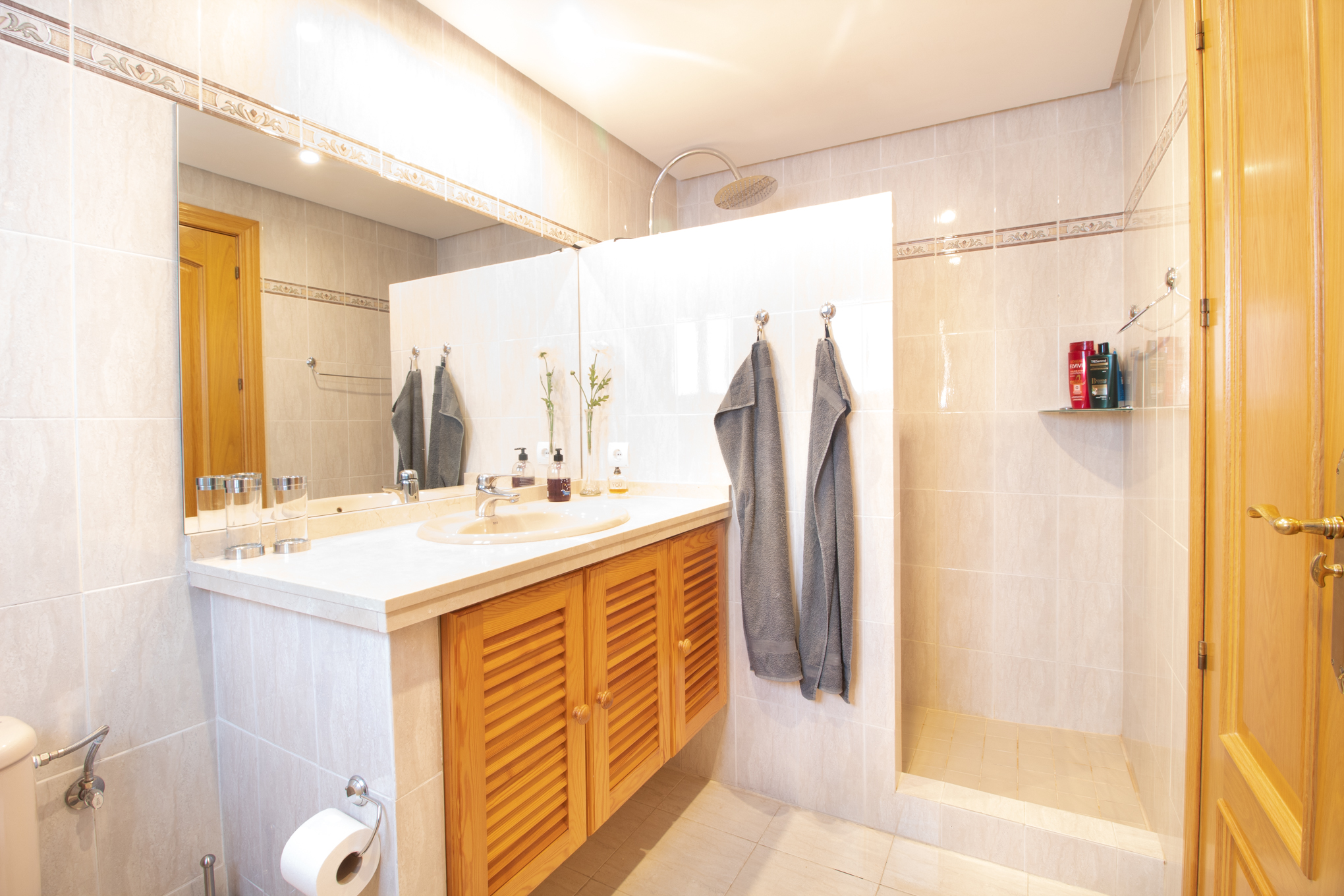 On the floor below you will find three more bedrooms and 2 bathrooms. From this level you have direct acces to the private garden and a downstairs terrace.