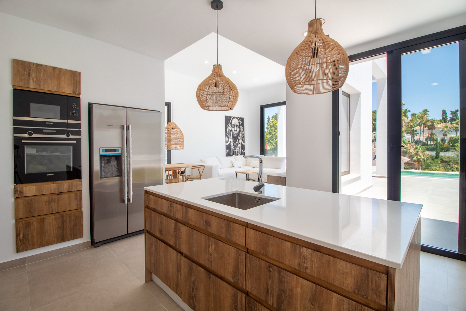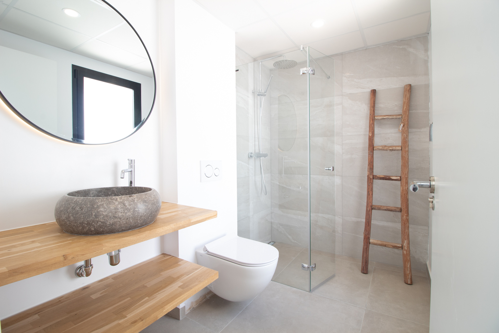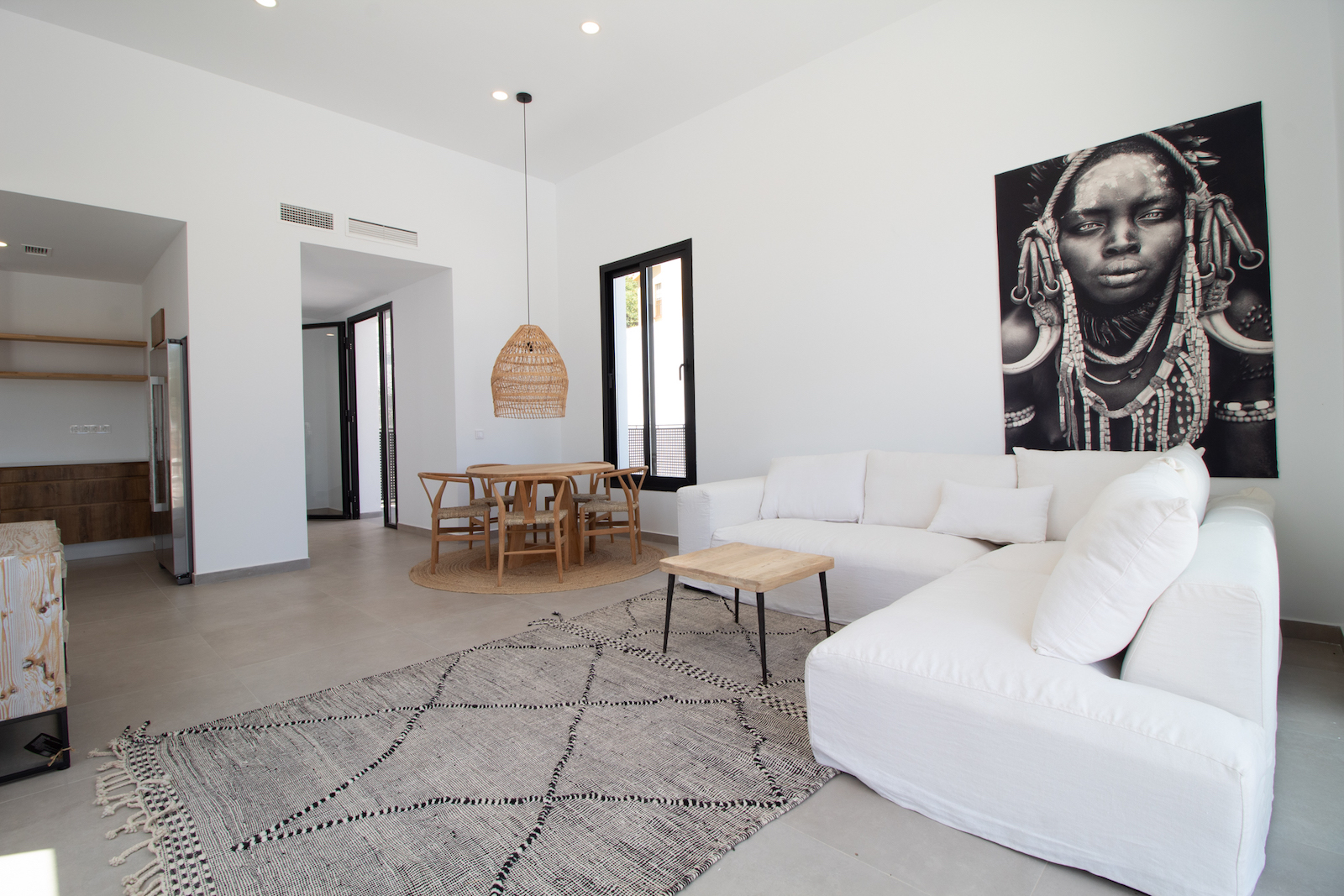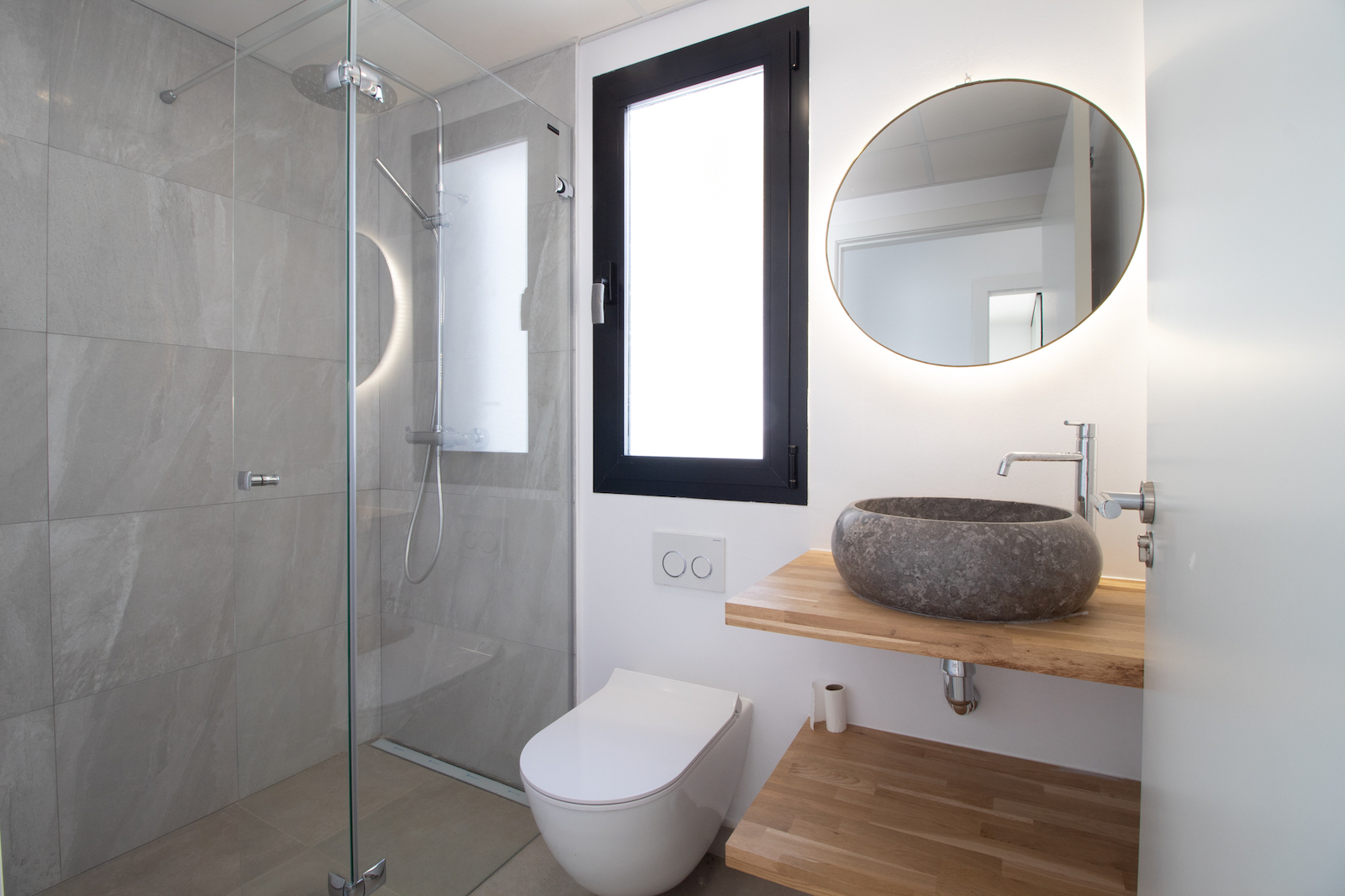3 of the bedrooms has beautiful views to the pool and the area with double sliding doors to a small terrace, where you can also put in step, so you can walk straight out to the pool for a morning dip. 2 bedrooms share one bathroom and the last bedroom has it own bathroom as well. All of them is built in the same style, quality and with direct access to a terrace.