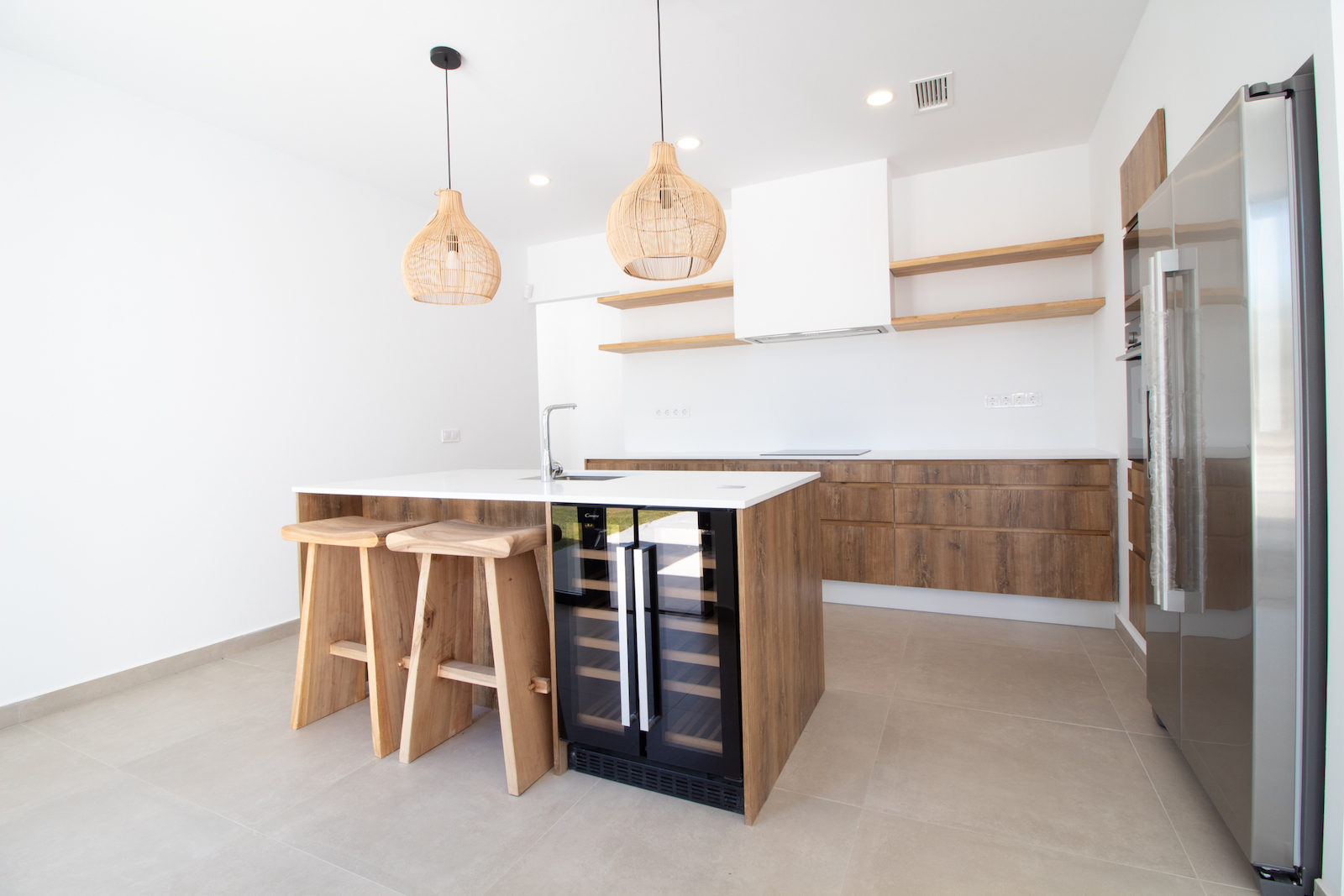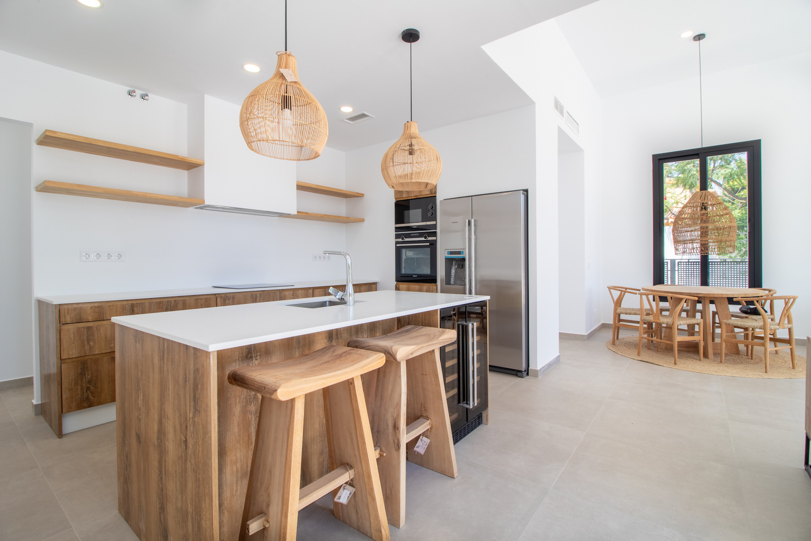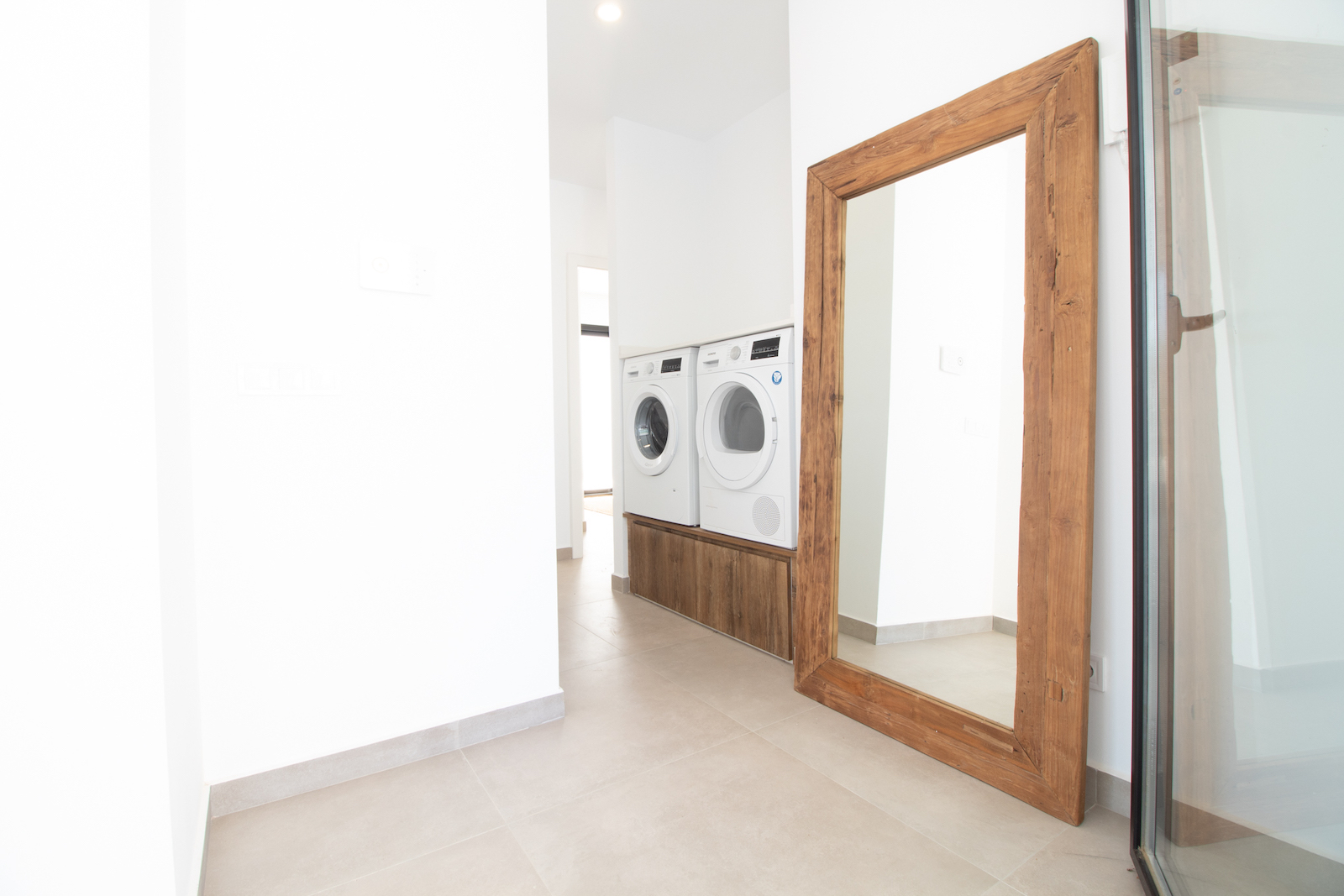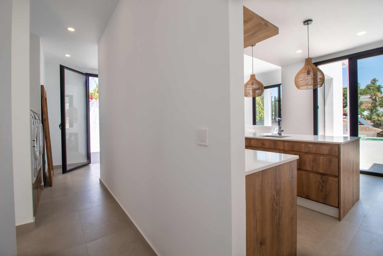 Throughout the whole house you will have underfloor heating and aircondition both hot and cold. All floors are the same material and look throughout the house and with nice spotlights in all rooms.