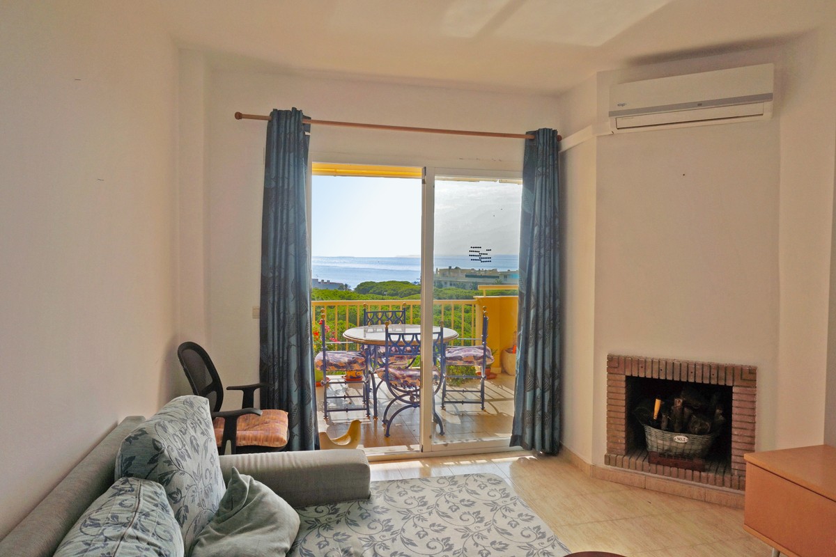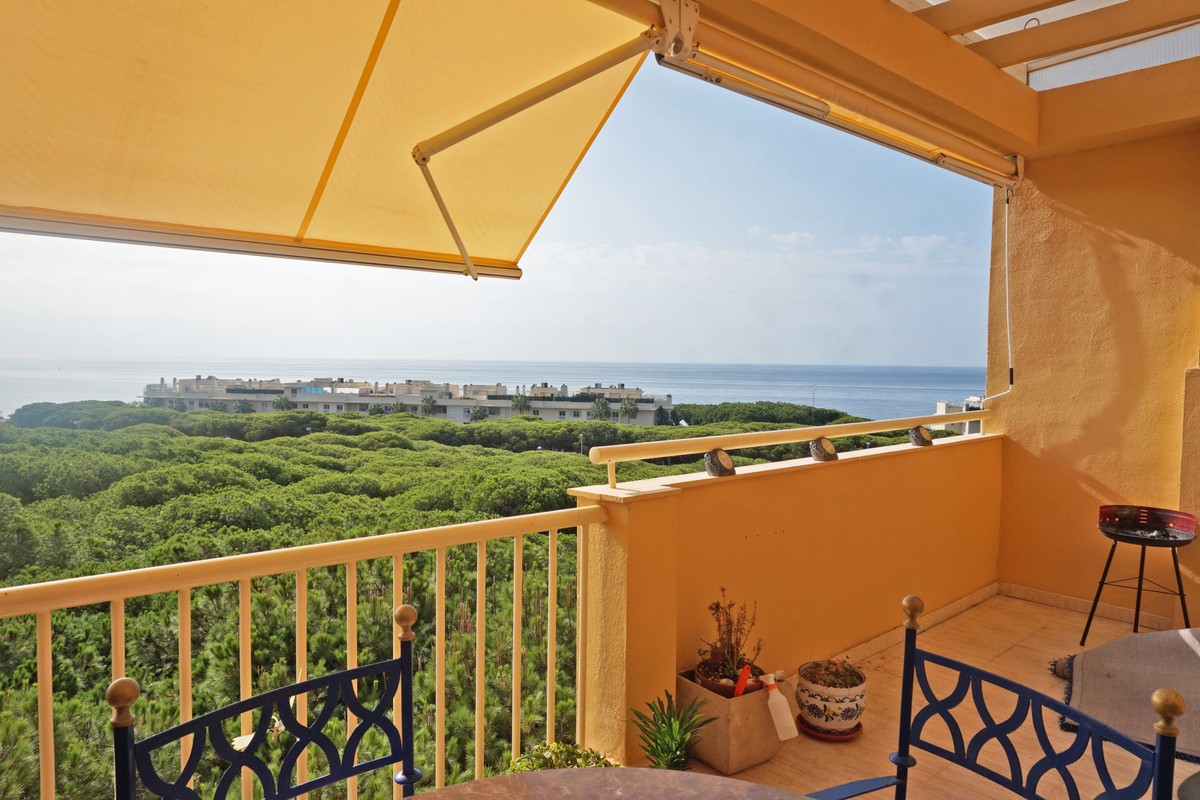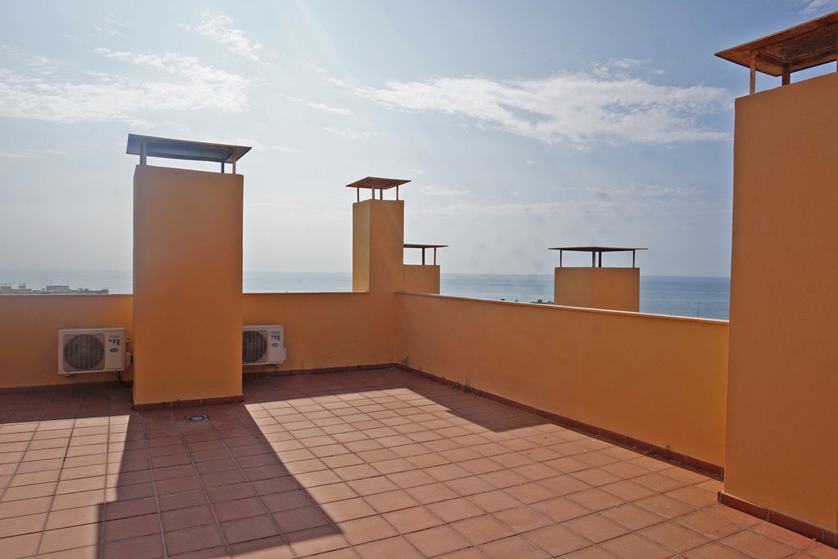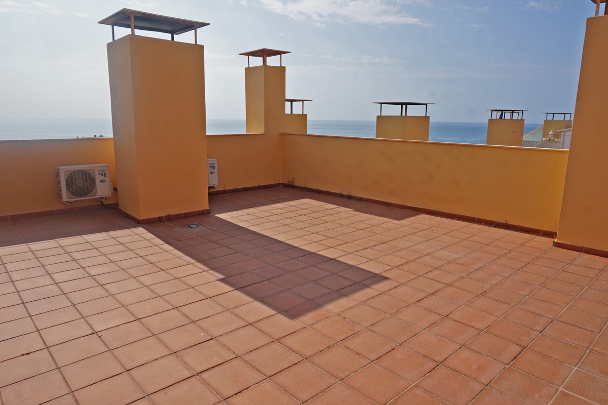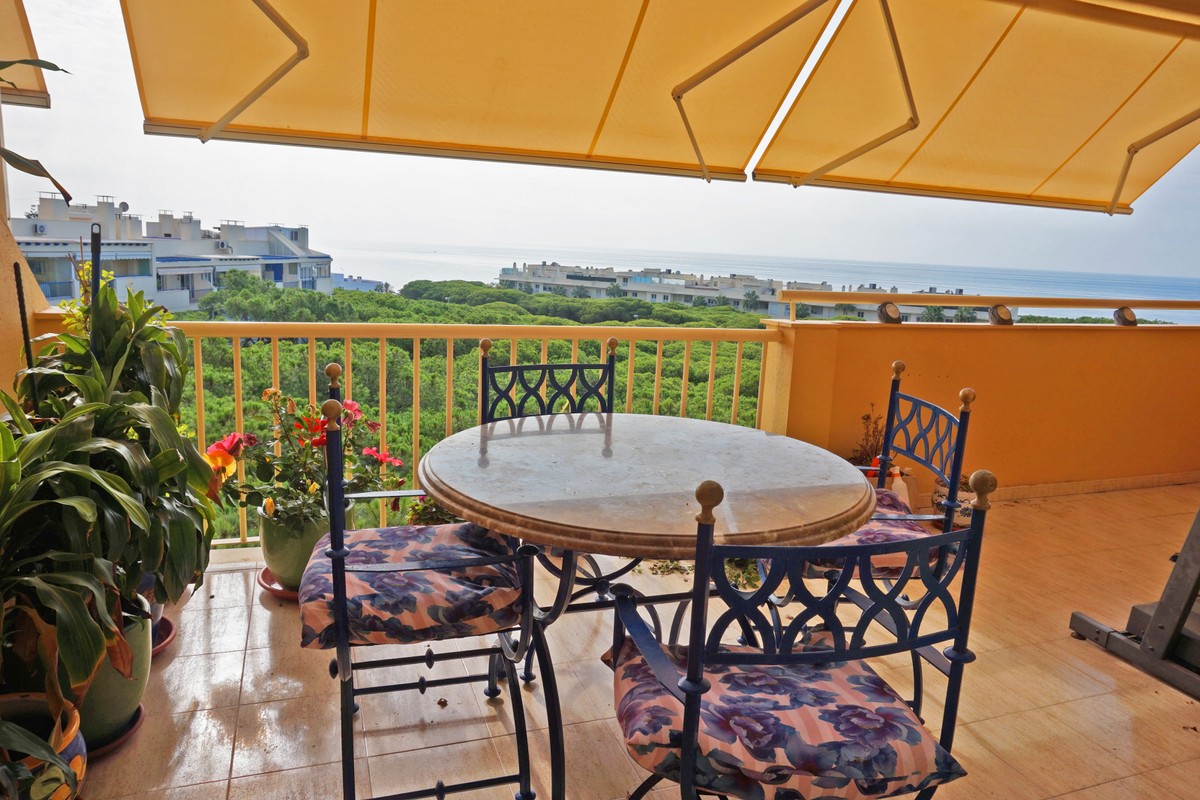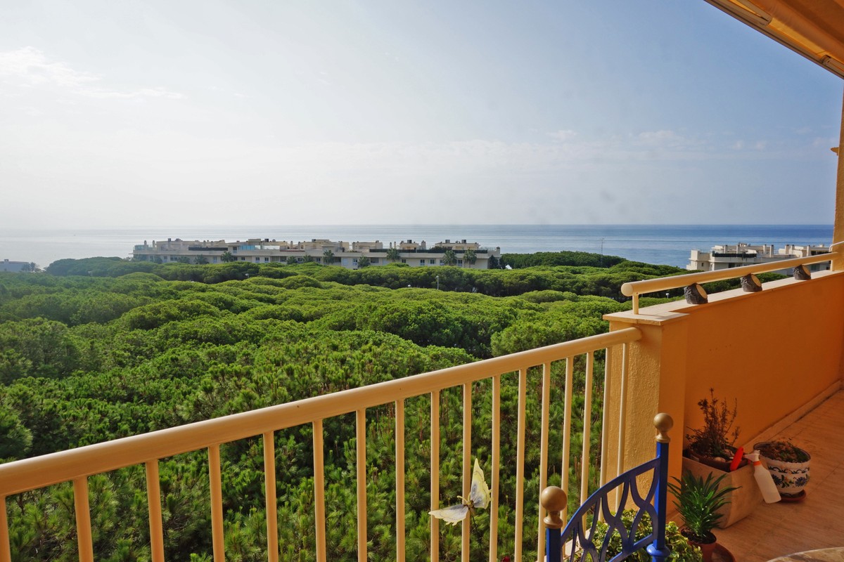Fantastic panoramic sea view for this top floor apartment in Calahonda Royal. This is a perfect location to walk to the beach, the commercial center and the bus stop to take you to Fuengirola or to Marbella center. The apartment consists of 2 bedrooms sharing a complete bathroom, a semi open kitchen, a bright living-dining room with fireplace and a large 22m2 covered terrace with BBQ and 2 new awnings, plus a 68m2 solarium on top. The view from the terrace is beautiful overlooking the green pine trees with the sea on the background.