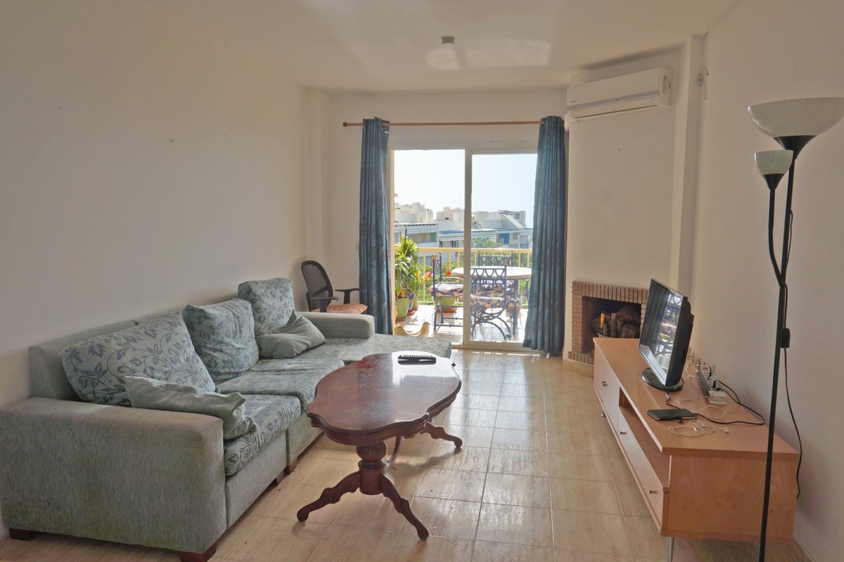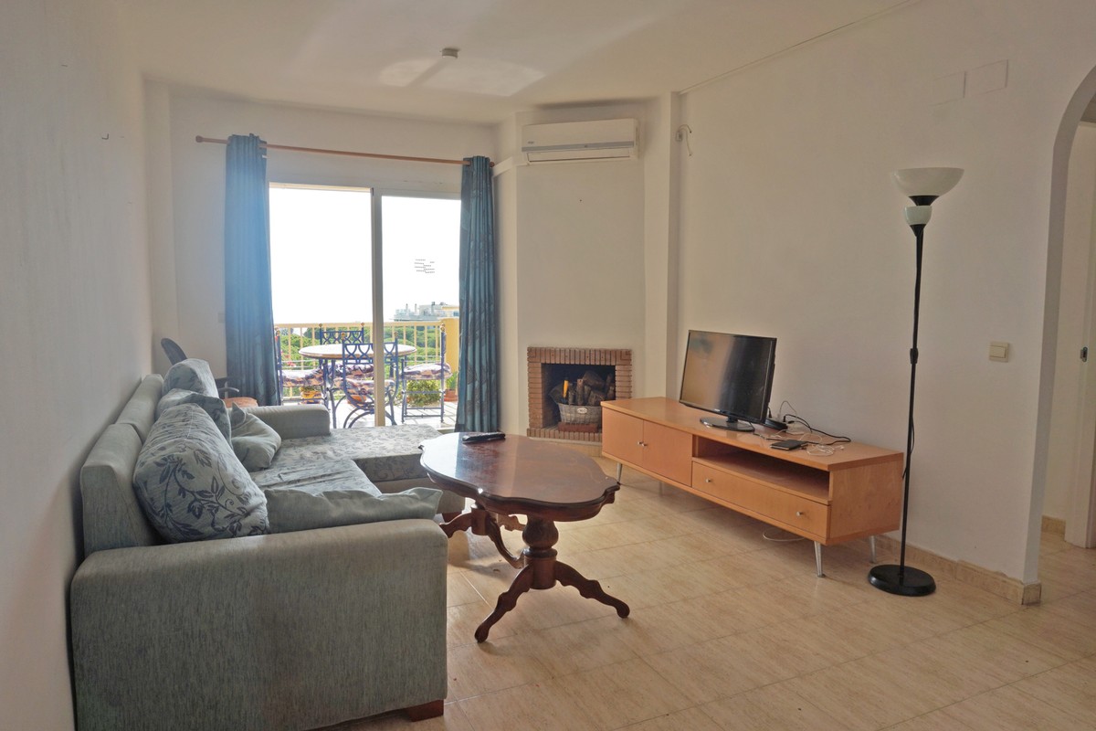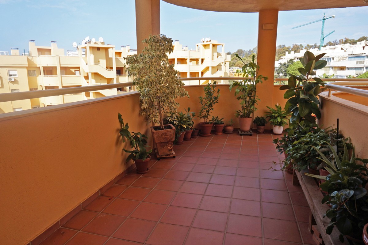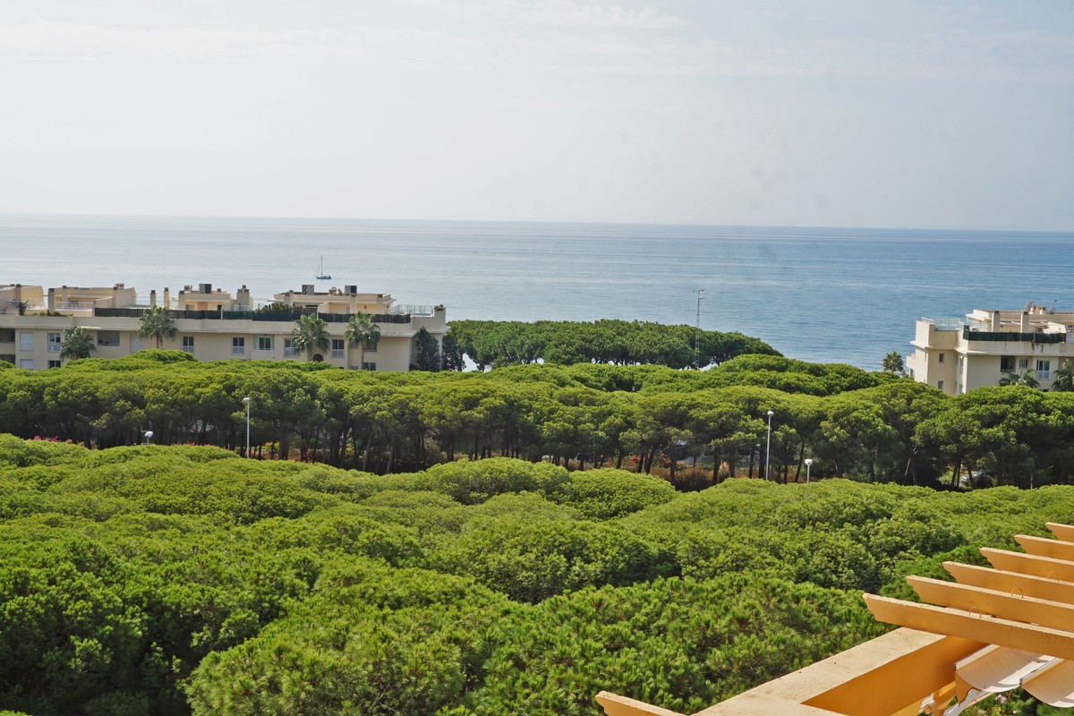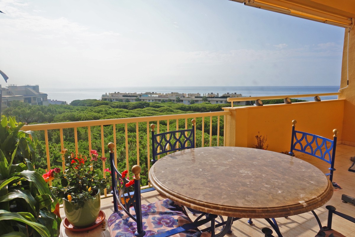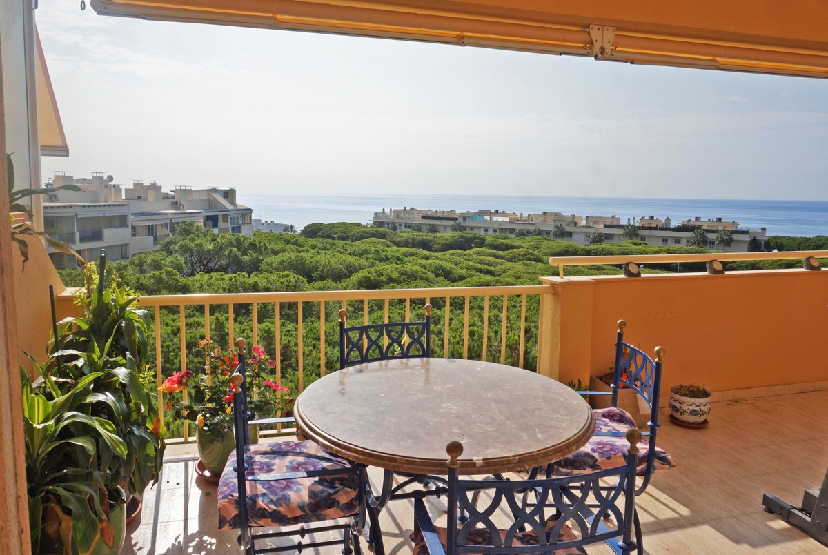 Fantastic panoramic sea view for this top floor apartment in Calahonda Royal. This is a perfect location to walk to the beach, the commercial center and the bus stop to take you to Fuengirola or to Marbella center. The apartment consists of 2 bedrooms sharing a complete bathroom, a semi open kitchen, a bright living-dining room with fireplace and a large 22m2 covered terrace with BBQ and 2 new awnings, plus a 68m2 solarium on top. The view from the terrace is beautiful overlooking the green pine trees with the sea on the background.