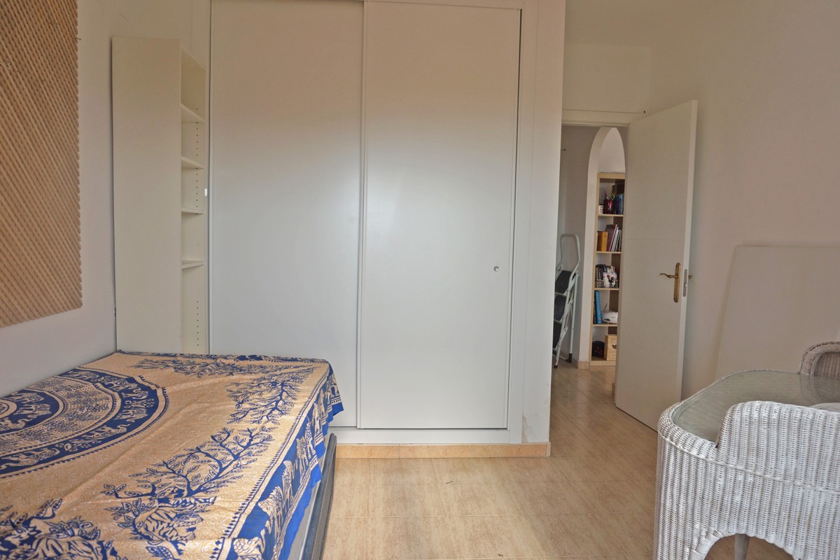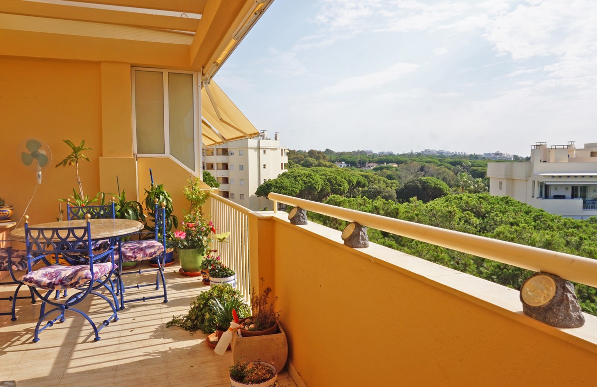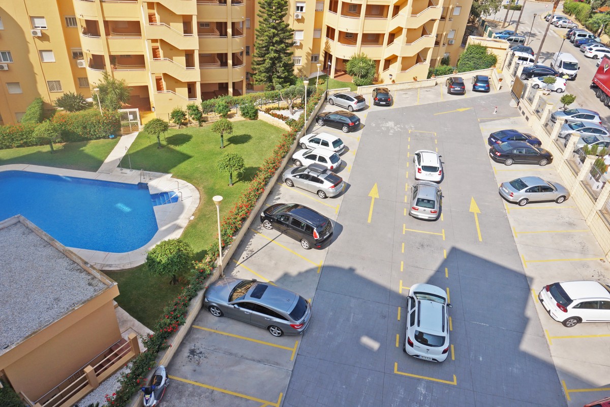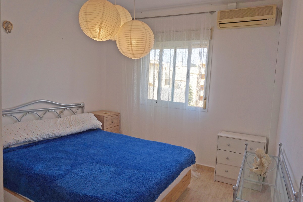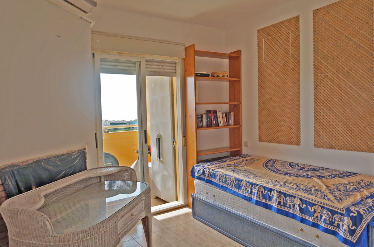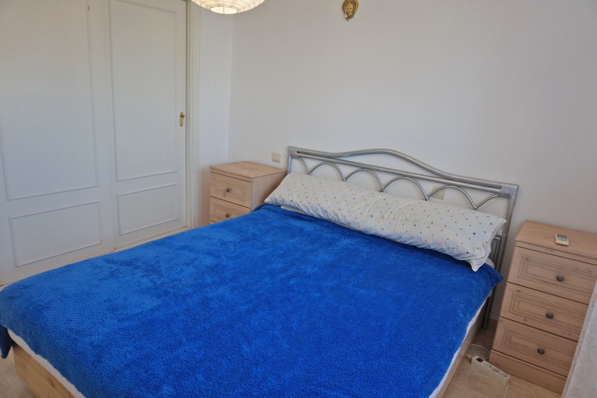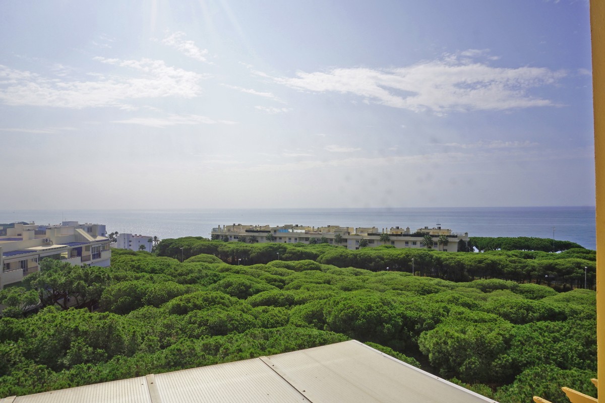 Fantastic panoramic sea view for this top floor apartment in Calahonda Royal. This is a perfect location to walk to the beach, the commercial center and the bus stop to take you to Fuengirola or to Marbella center. The apartment consists of 2 bedrooms sharing a complete bathroom, a semi open kitchen, a bright living-dining room with fireplace and a large 22m2 covered terrace with BBQ and 2 new awnings, plus a 68m2 solarium on top. The view from the terrace is beautiful overlooking the green pine trees with the sea on the background.