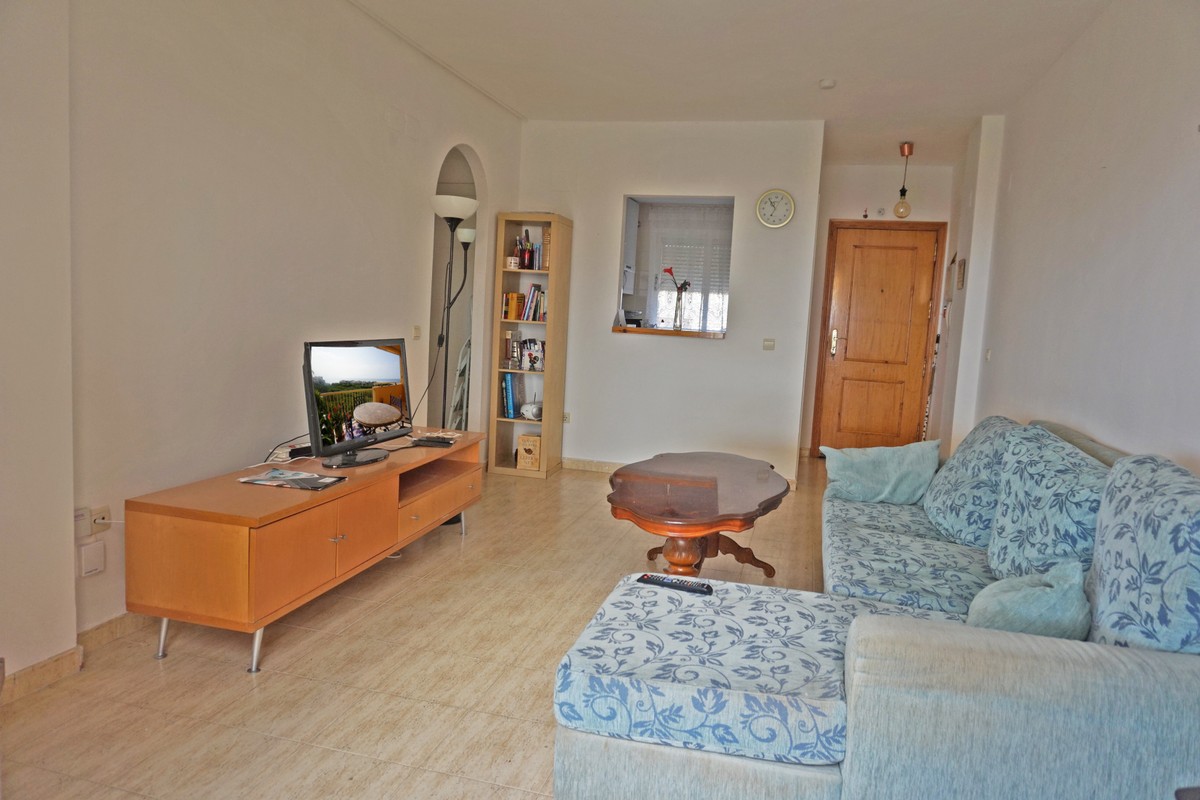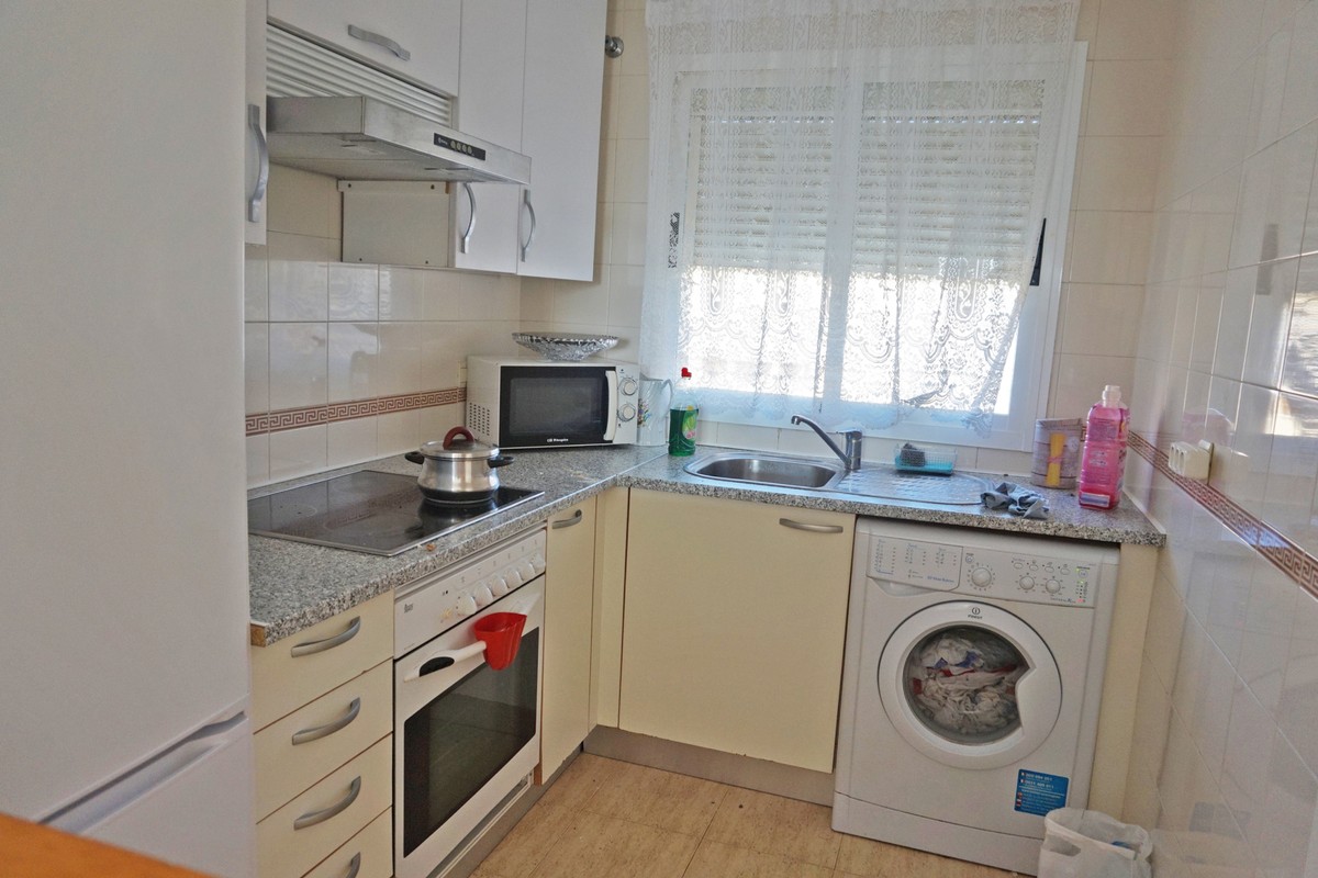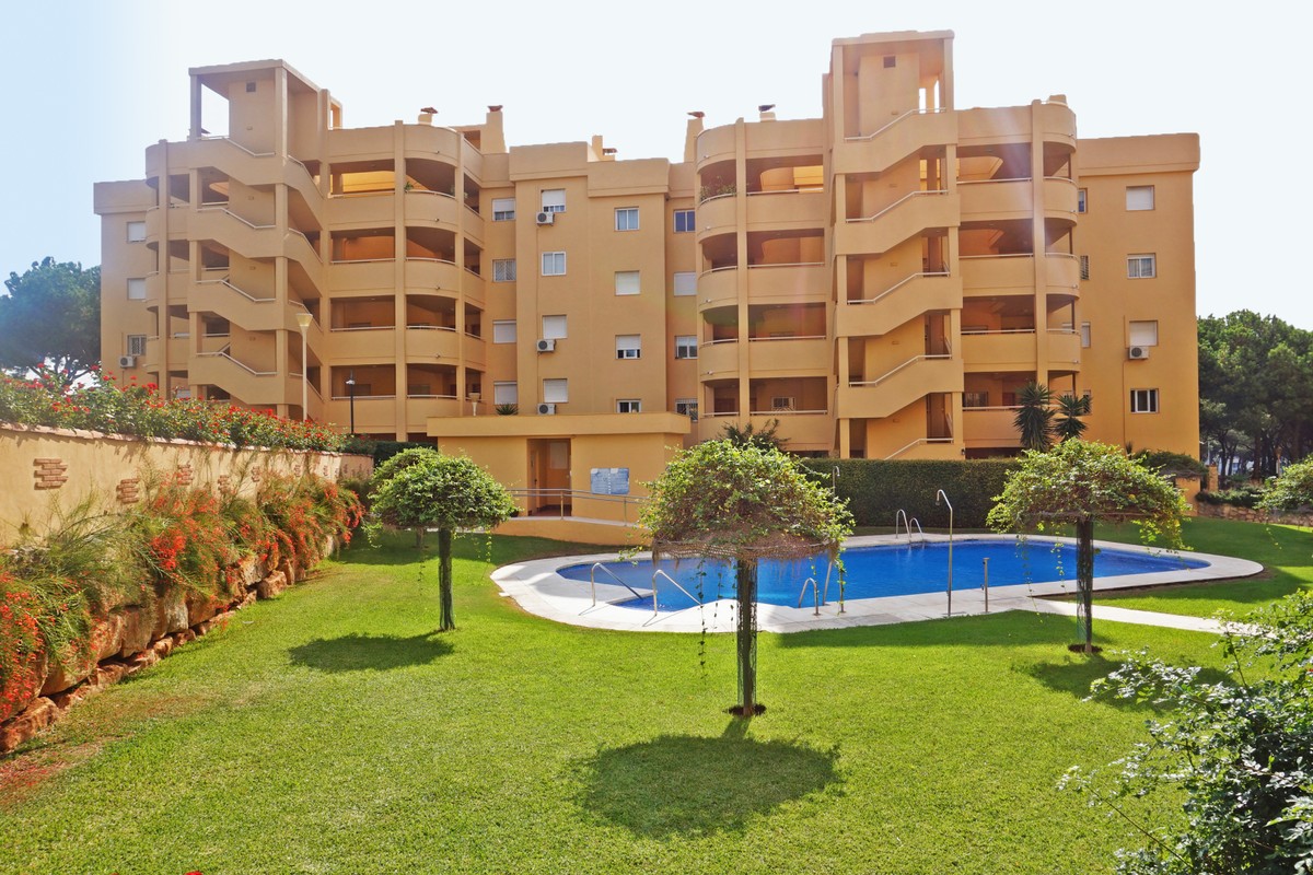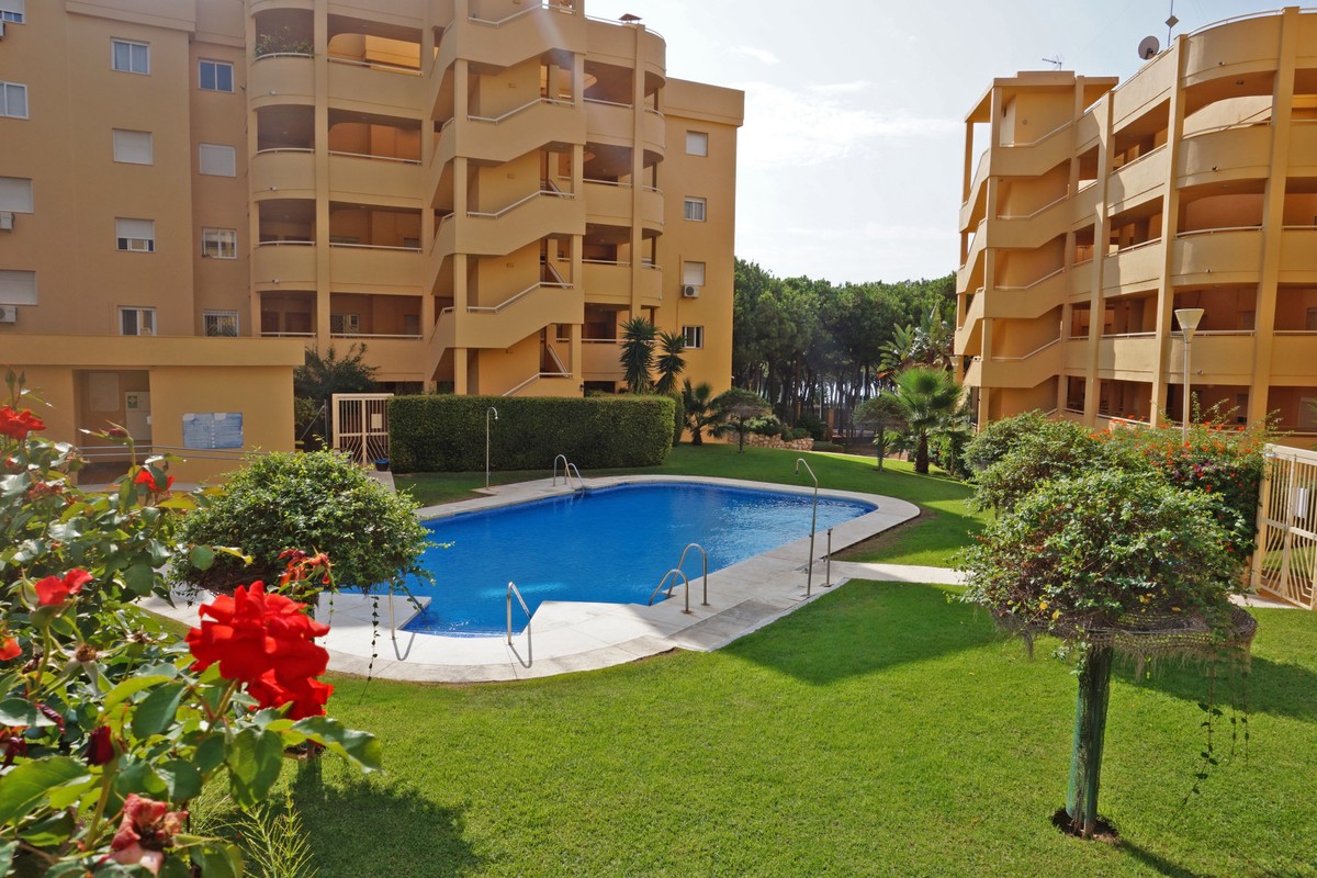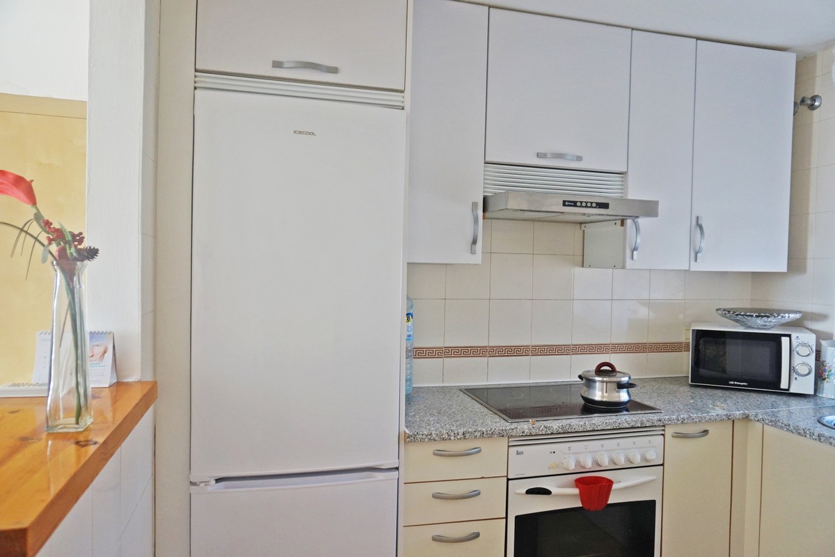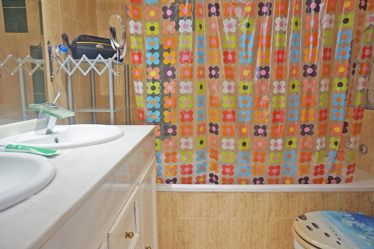 Fantastic panoramic sea view for this top floor apartment in Calahonda Royal. This is a perfect location to walk to the beach, the commercial center and the bus stop to take you to Fuengirola or to Marbella center. The apartment consists of 2 bedrooms sharing a complete bathroom, a semi open kitchen, a bright living-dining room with fireplace and a large 22m2 covered terrace with BBQ and 2 new awnings, plus a 68m2 solarium on top. The view from the terrace is beautiful overlooking the green pine trees with the sea on the background.