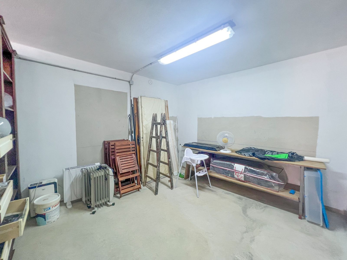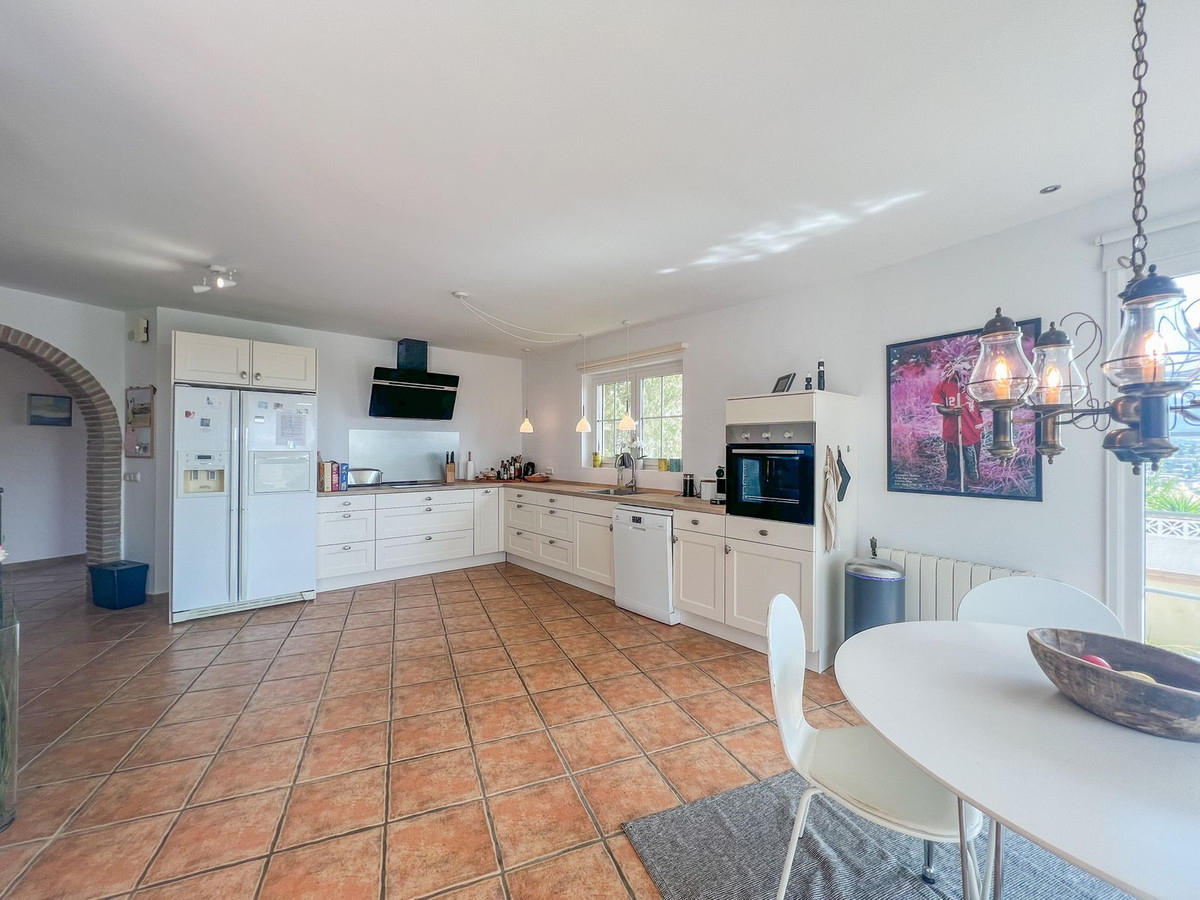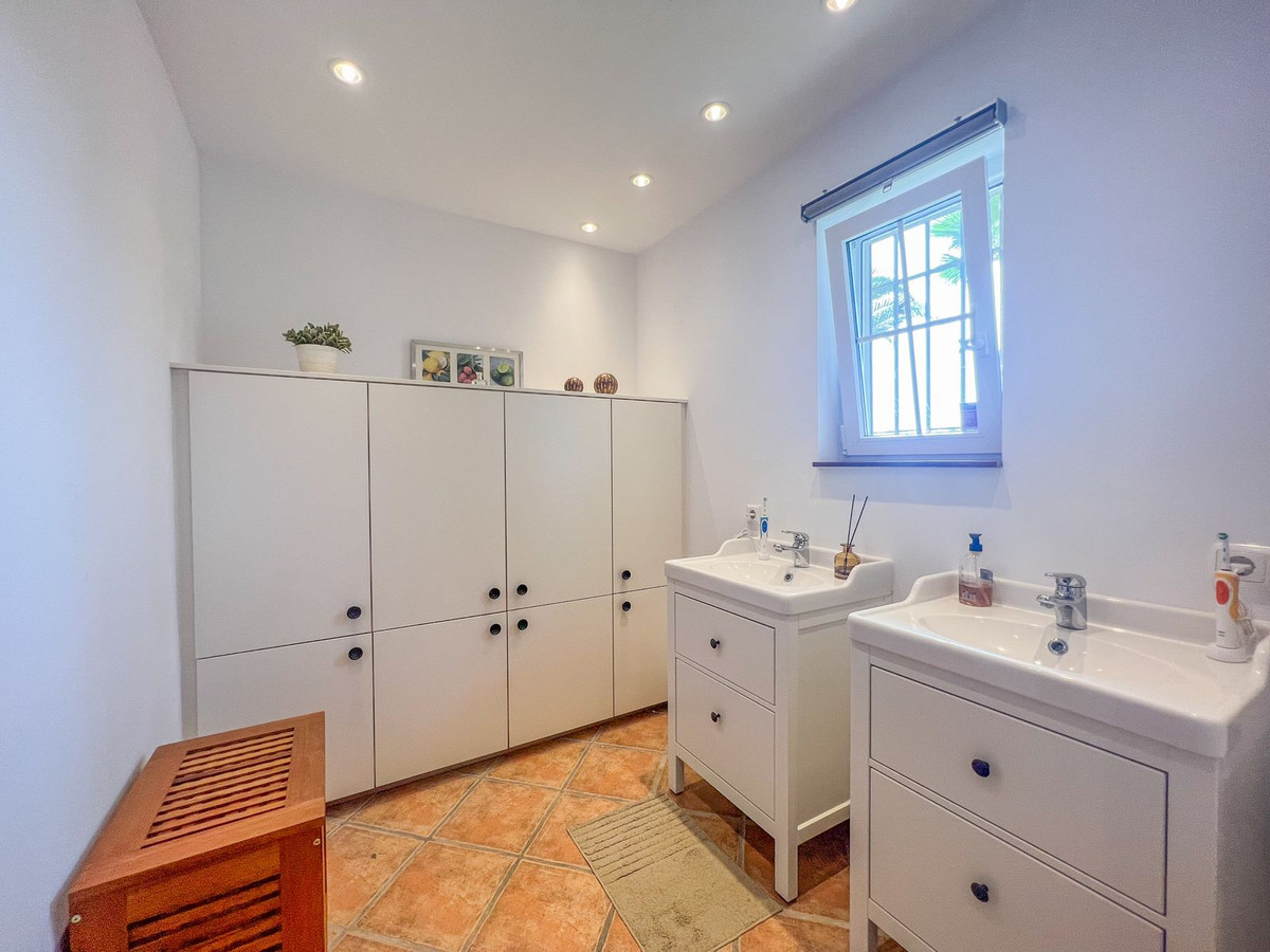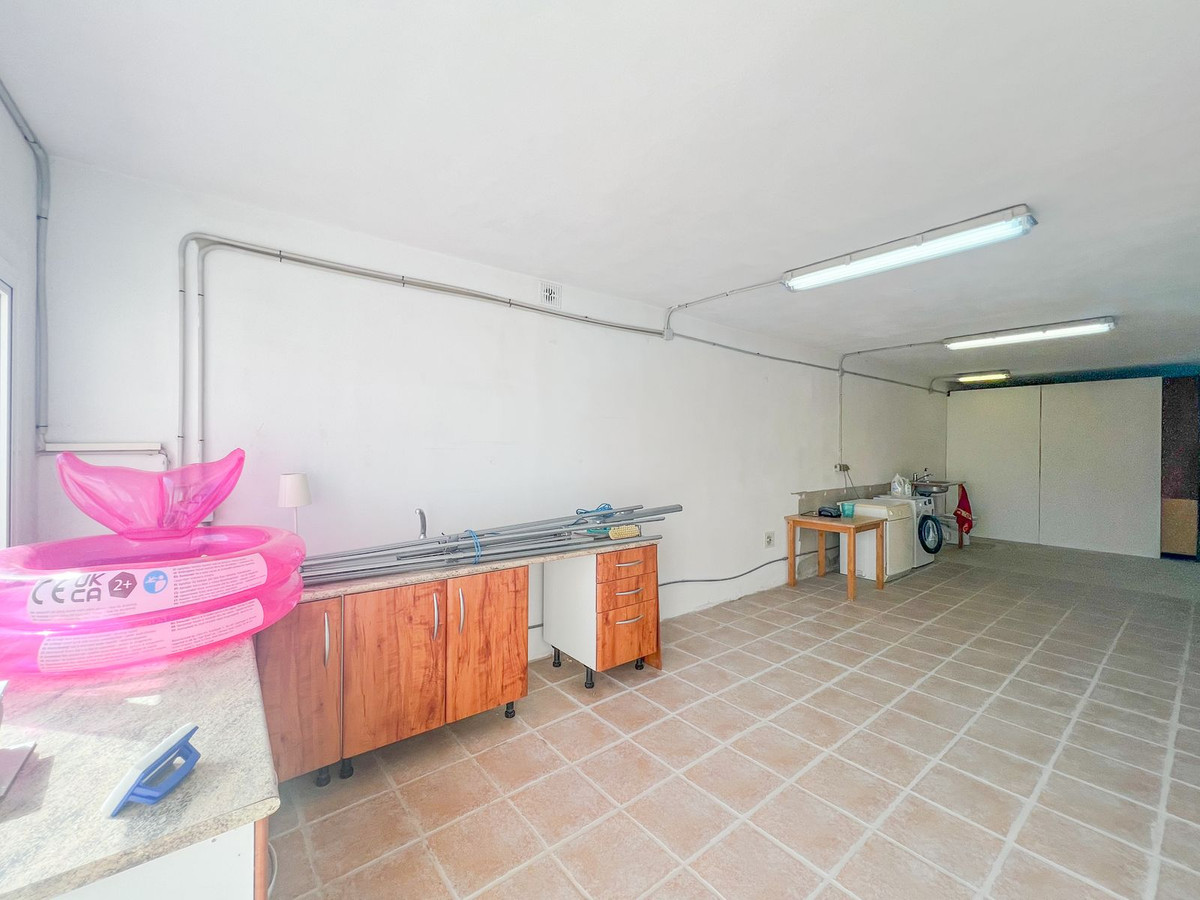 Underneath the villa there is a large room that used to be a garage, but has now been closed off with big windows and a door, the idea was to create a separate apartment here. In here there is currently a washer and dryer, connected plumping and it is being used as a laundry room. There is also a toilet. It has a complete separate entrance and a parking space. Please note that this area is not included as residence.