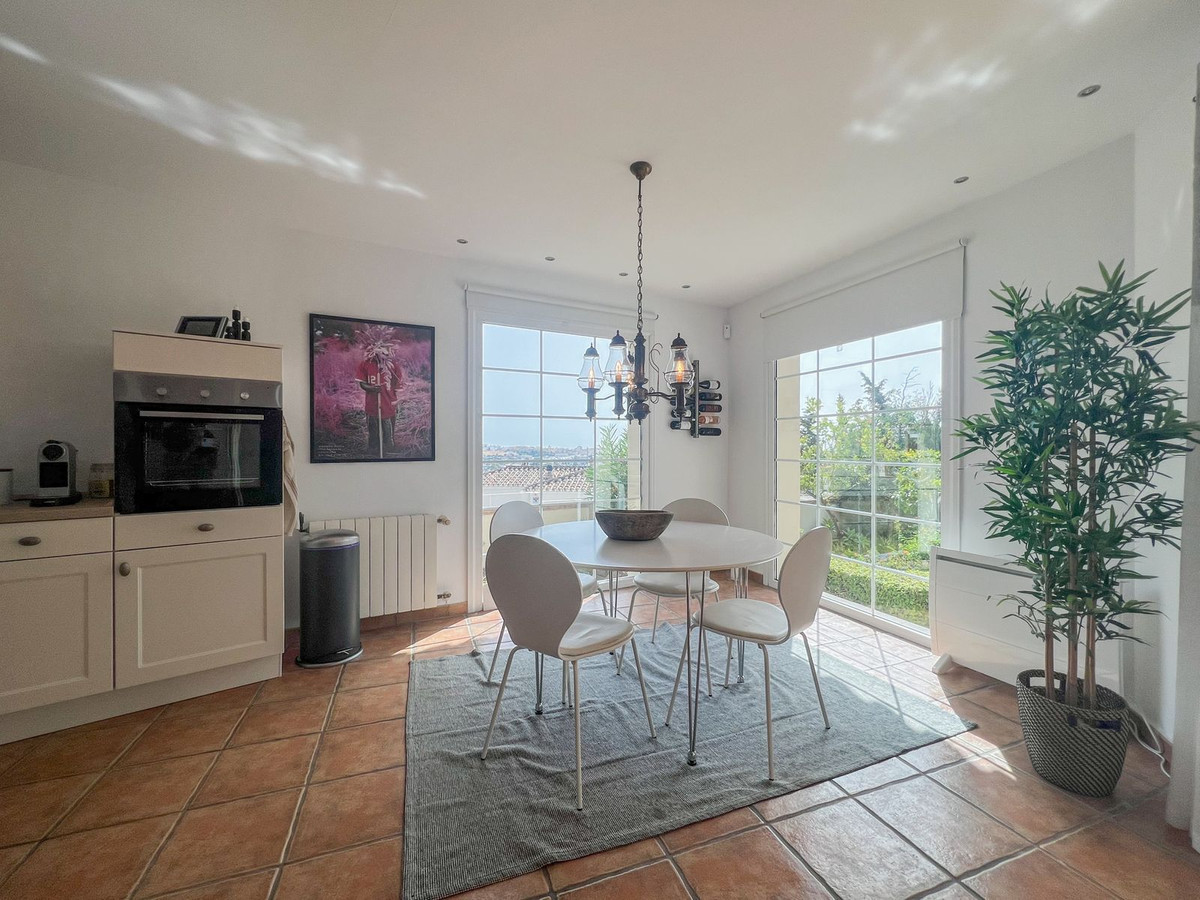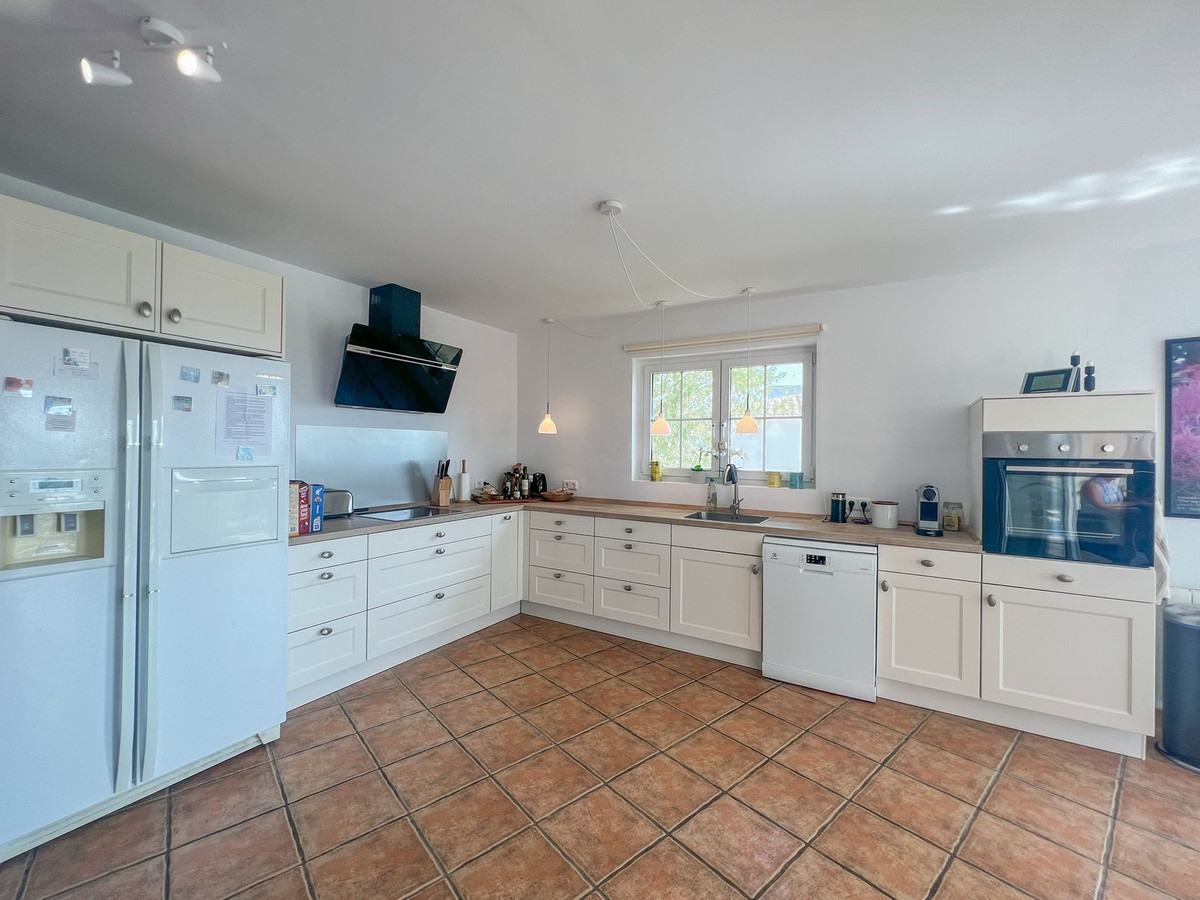 The large living room faces the garden and terrace directly making it a perfect space for entertaining guests. It has space for a large family sized table, where you can comfortably BBQ. There are ceiling fans that help to create a nice breeze in the hot summer evenings. In connection to the living room there is also a large open-concept kitchen/dining room with floor to ceiling windows. The kitchen is large enough to expand with a kitchen-island and still have enough space to have your dining room table by the windows with views out into the garden.