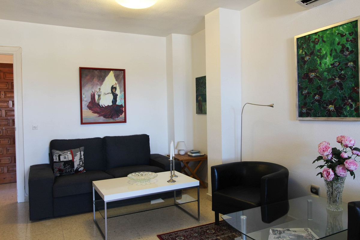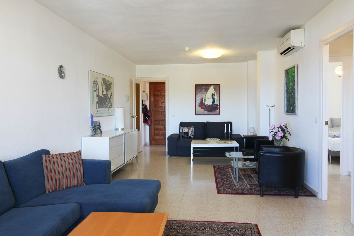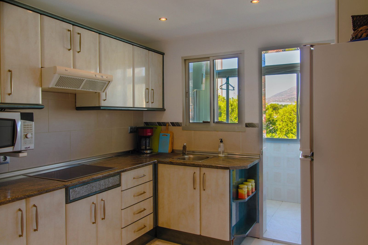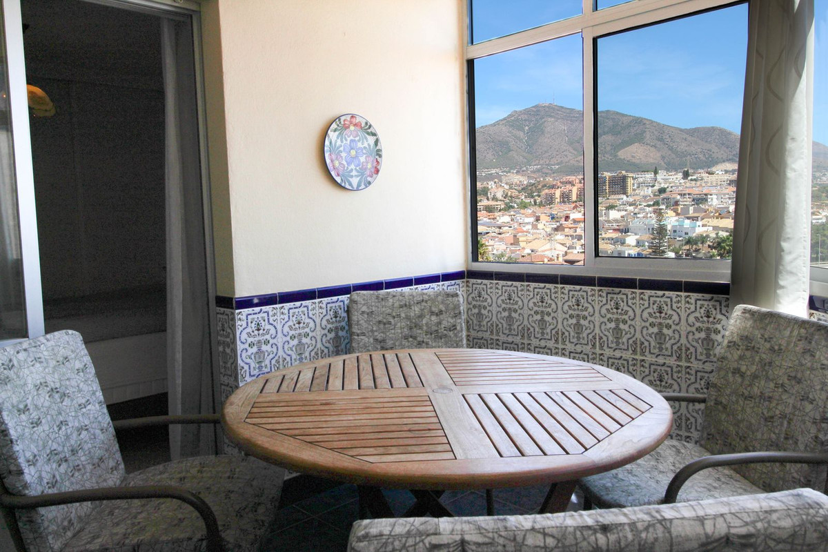 From one bedroom there is direct access to a small balcony with a magnificent view of the Mijas mountains. The apartment's bathroom is located on the same hallway as the bedrooms. Large bright living room with two sofa sections, air conditioning and access to the terrace/dining area, where you have a view of the city and the mountains. Equipped kitchen with good table and cupboard space. In extension of the kitchen via a door, there is the laundry room with washing machine.