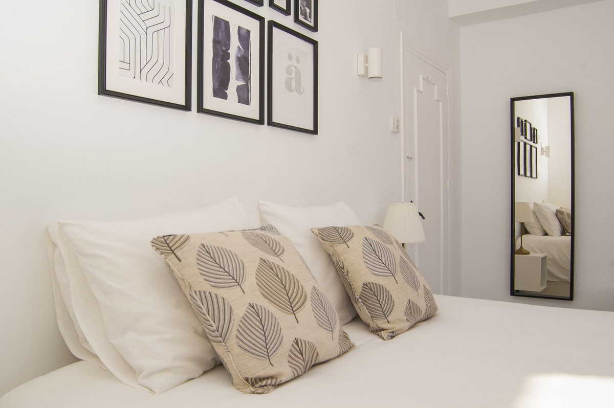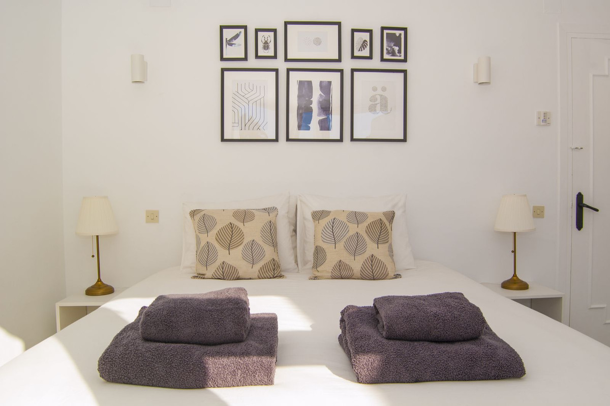 Make your way up the staircase to the upper level, where you'll find two cozy bedrooms, a hallway, and a luxurious bathroom. Each bedroom is furnished with a double bed and lots of storage space in built-in closets. Step out onto the charming balconies from either room for a breath of fresh air. The newly renovated tiled bathroom is equipped with a bathtub, shower, and storage cabinets.