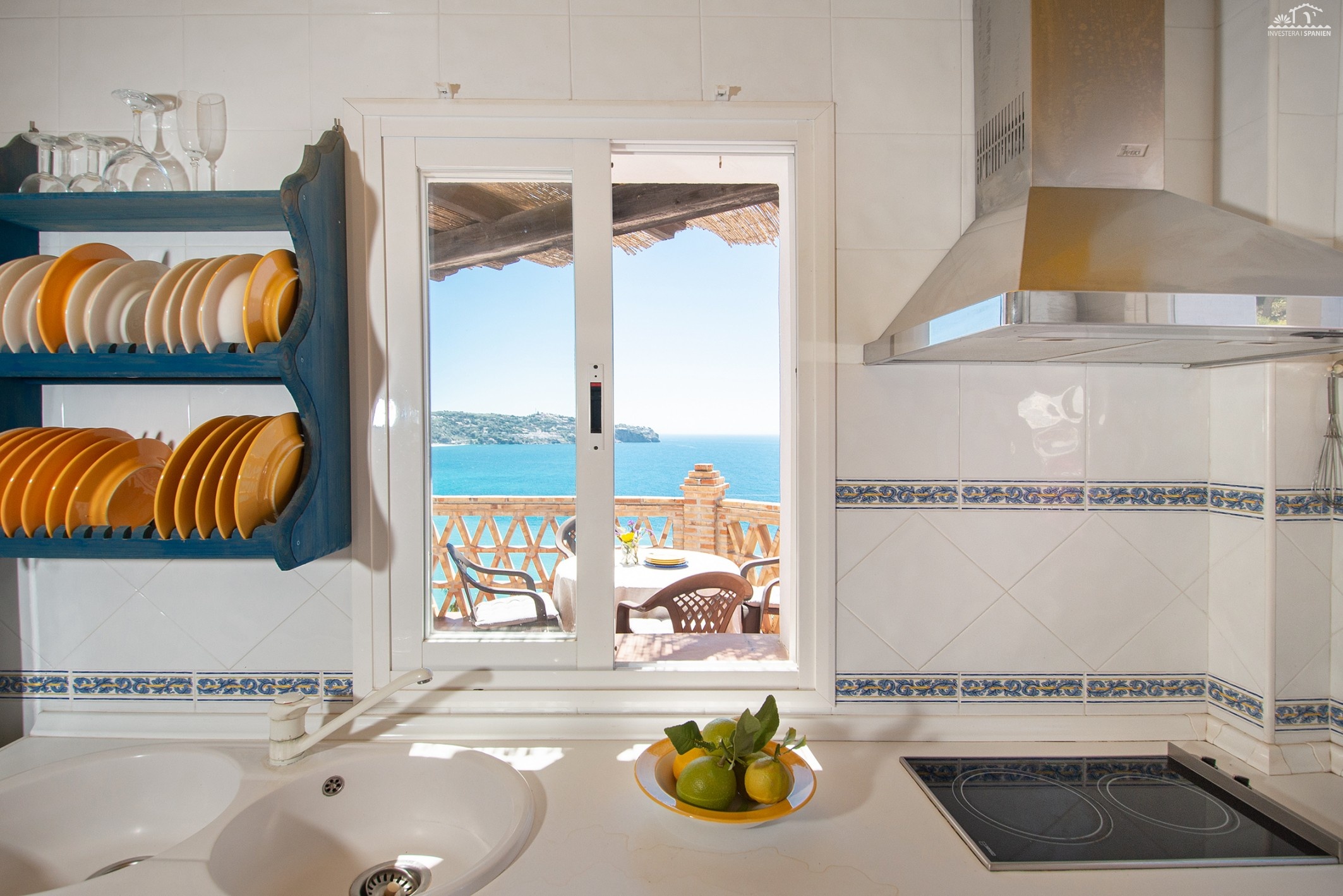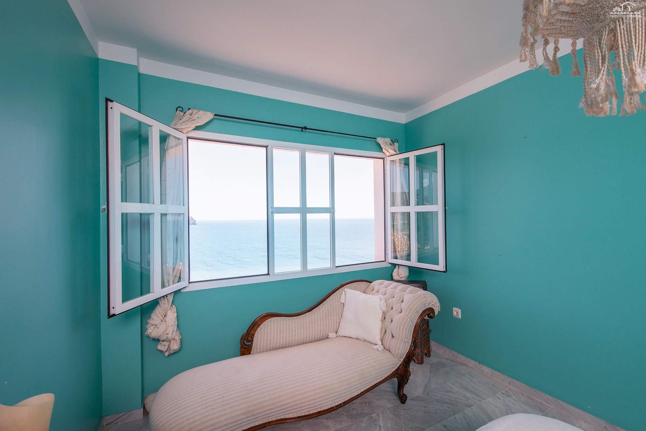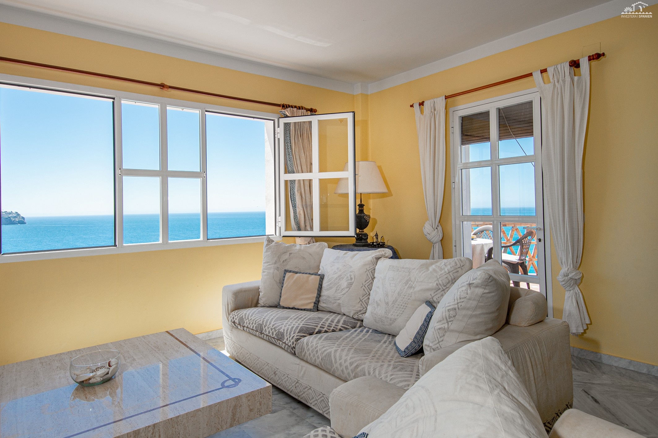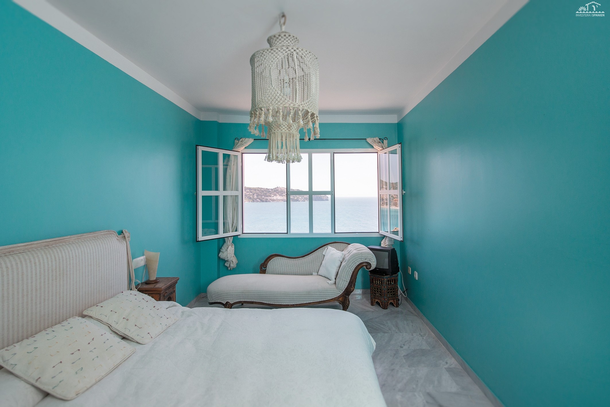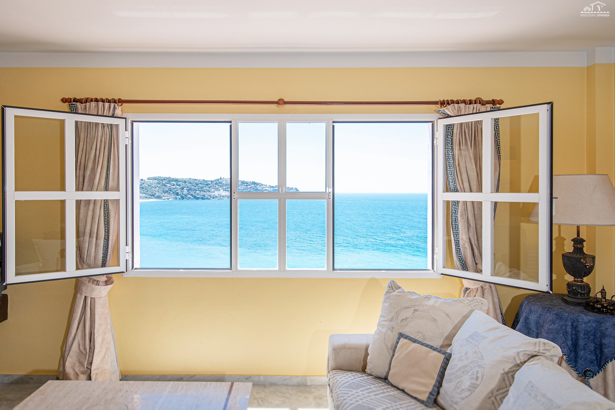 Entrance to the entrance and on to the living / dining room with large double windows facing the sea, to the right of the front door there is a toilet. Furthermore, we enter the kitchen which has windows to the terrace and to the side sea view. The living room has a door to the terrace where the view is magnificent to the sea and cerro gordos sea cliffs on the right side. You can see the entire beach and village of La Herradura from here.