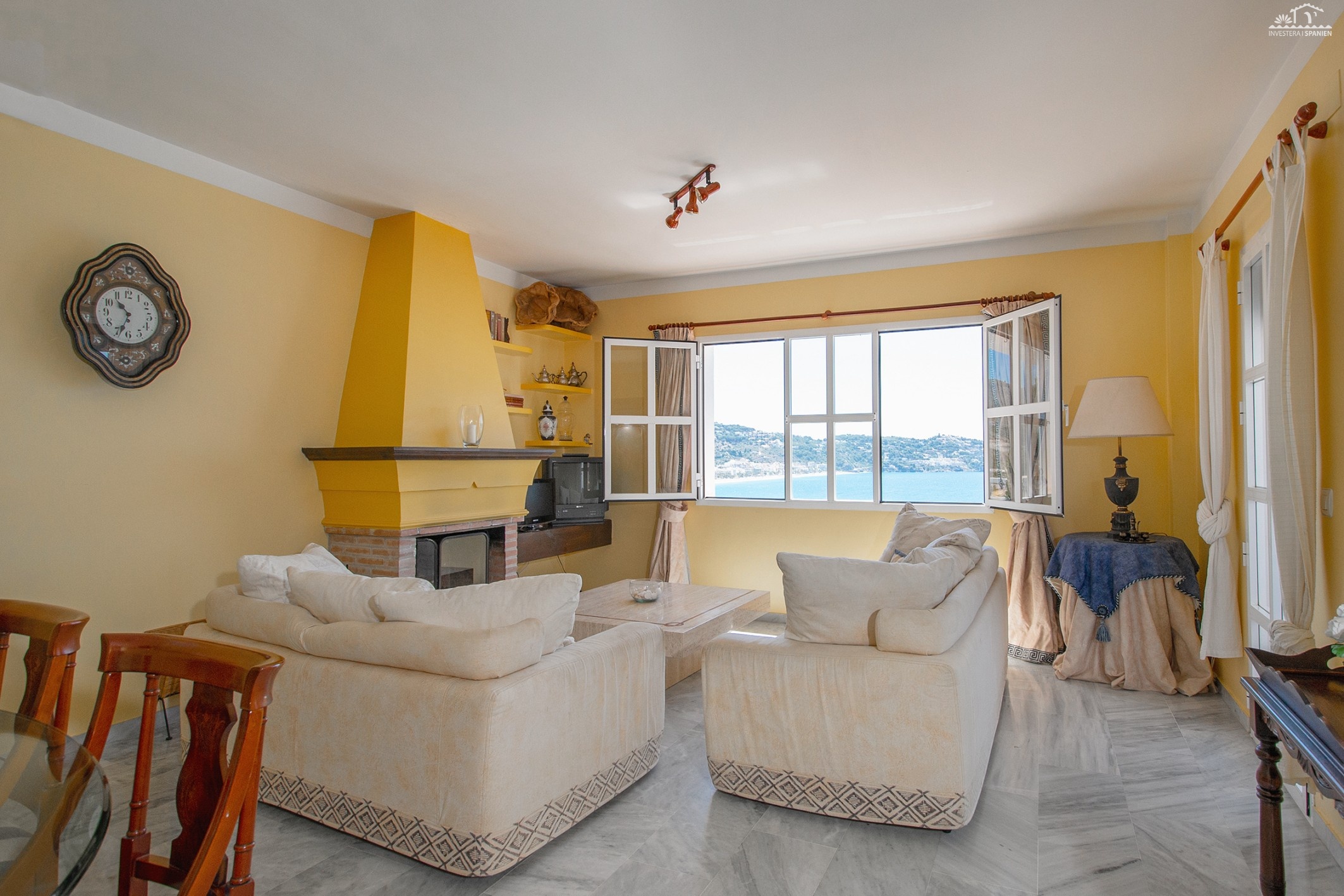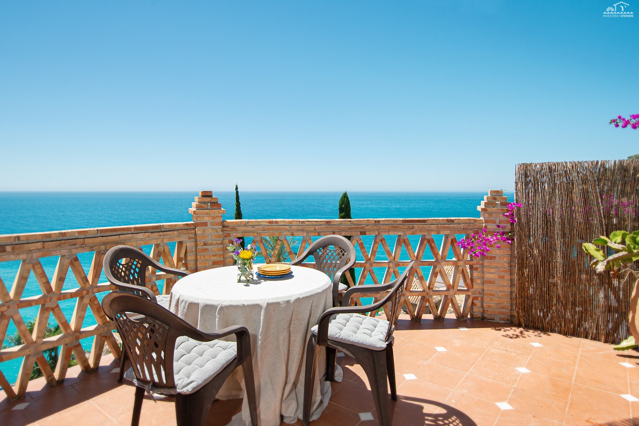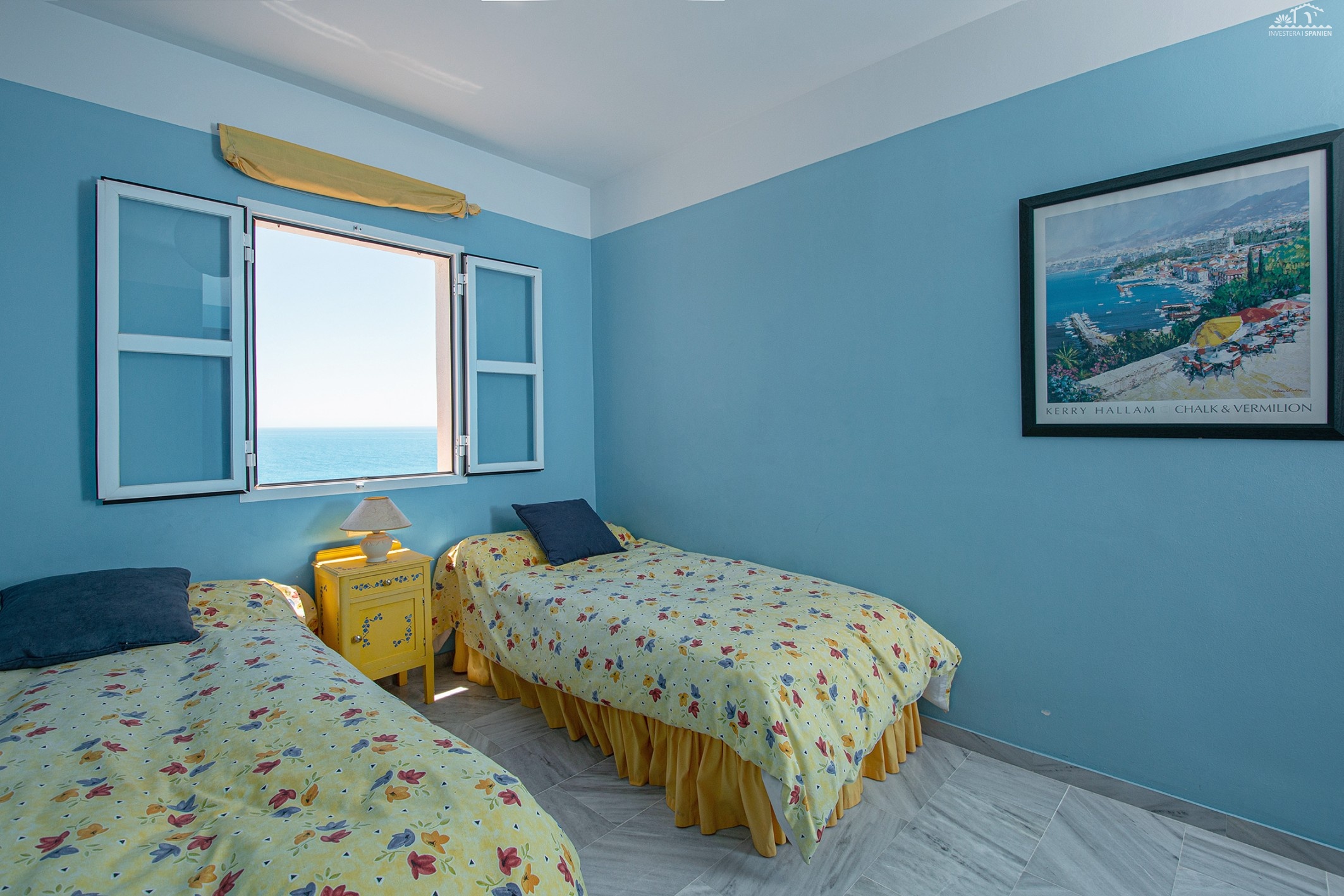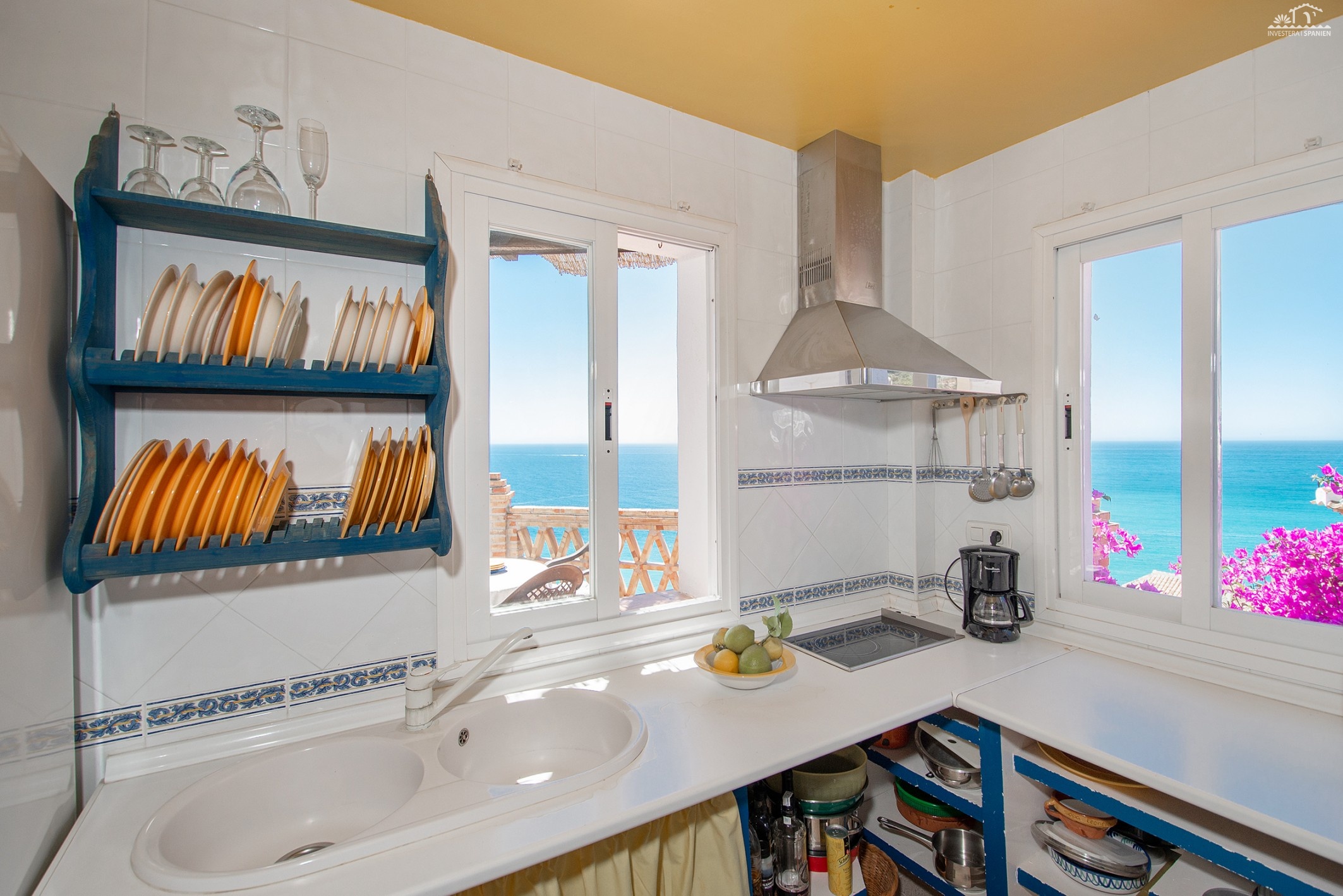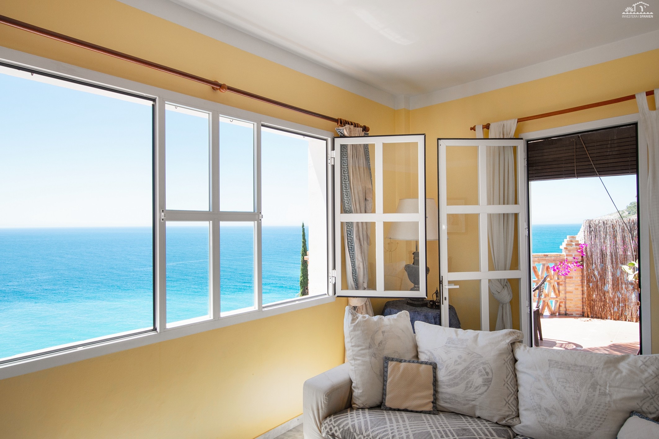 Entrance to the entrance and on to the living / dining room with large double windows facing the sea, to the right of the front door there is a toilet. Furthermore, we enter the kitchen which has windows to the terrace and to the side sea view. The living room has a door to the terrace where the view is magnificent to the sea and cerro gordos sea cliffs on the right side. You can see the entire beach and village of La Herradura from here.